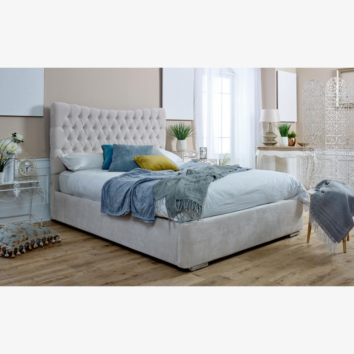 Simply sophisticated, the Magenta Ottoman bed frame is every shade of luxury, elegance, and perfection. It features a sturdy frame and strong side legs with a capacity to hold heavy weight. The plush, velvety covering of the frame gives it a compact fitting that will stand out in any bedroom space. It comes with a curved headboard with our customized handcrafted signature buttons that add perfect finishing to the whole design. For support, it uses a solid board base and chrome feet that, giving the bed a dainty look but dont be fooled, the bed frame is as strong and durable as they come. It also features a gas lift storage that helps to keep your bedroom free of clutter, leaving your space looking stylish and modern. The package does not come with a mattress.