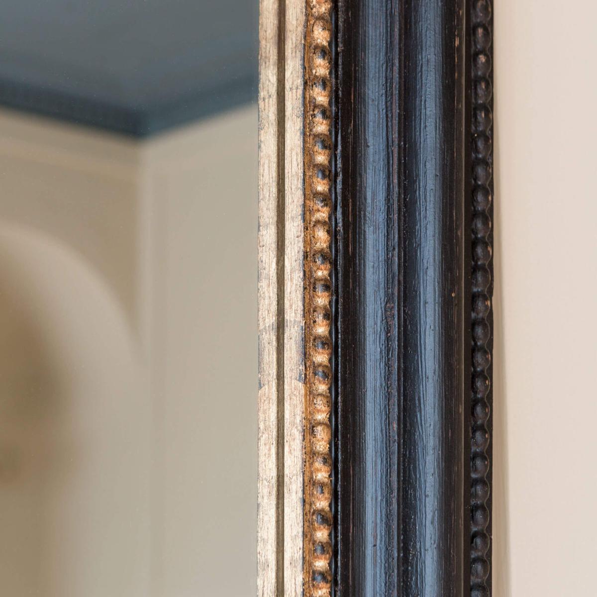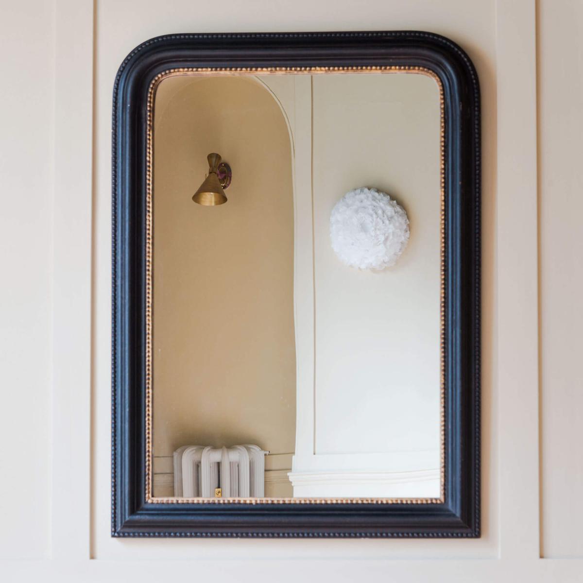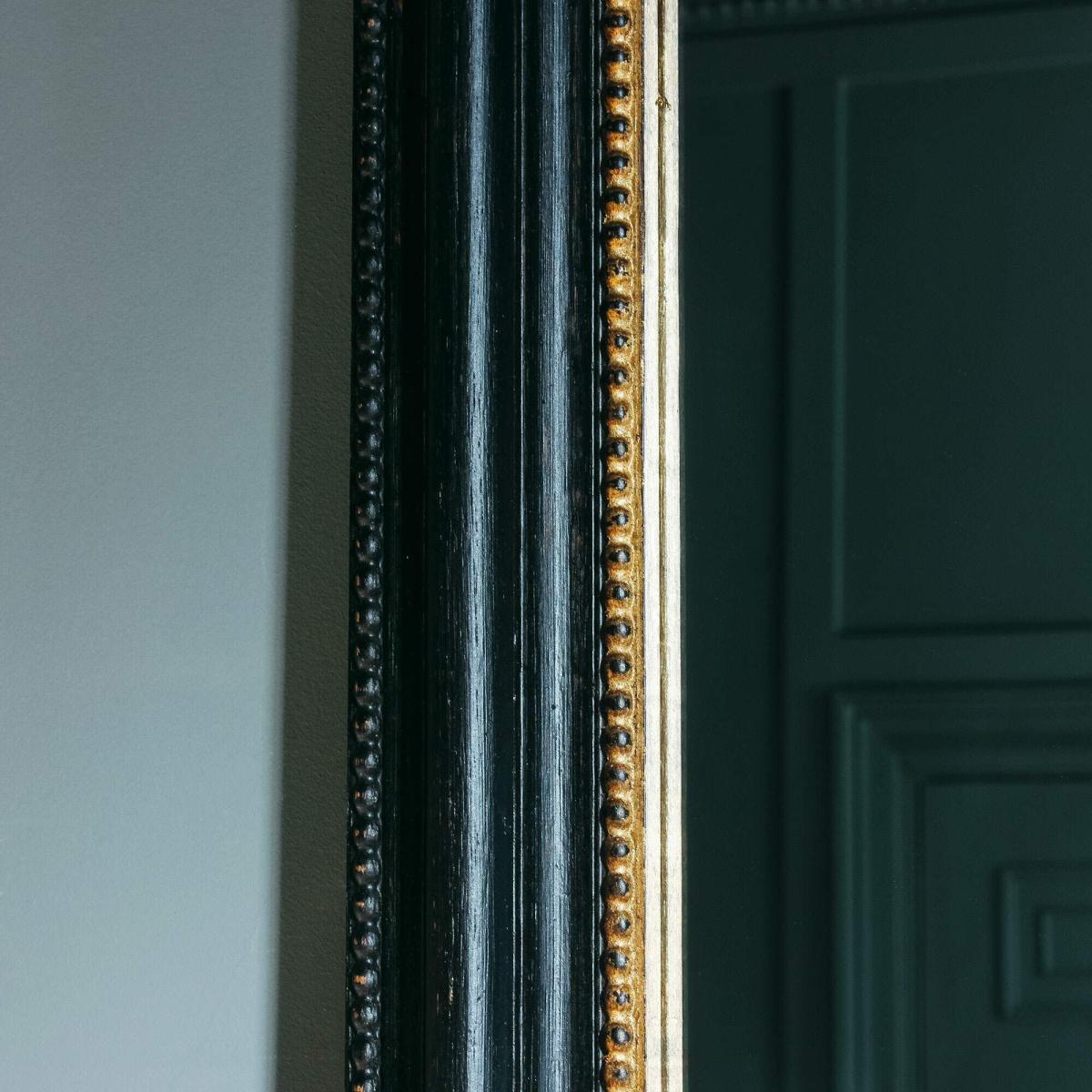A rectangular mirror with an arched shape crafted from wood and finished in black with gold detailing.