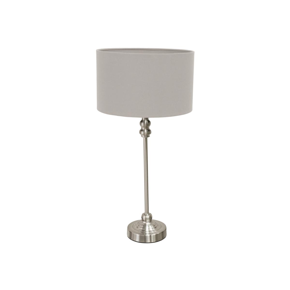 The perfect foundation for any shade. The Maggie candlestick table lamp in brushed chrome is an understated, slim table lamp base perfect for tighter spaces and ready to glow with this black drum shade. A free-standing table lamp with a slim stem and a wide base. Fitted with a rocker switch on a convenient 150cm cable and finished with a shade. Simple, elegant and contemporary. A simple brushed chrome base matched with a classic fabric drum shade in black. A slim design that fits well in tight spots, suitable for living rooms, bedrooms, hallways, dining rooms, kitchens and home offices. Requires 1x E14 bulb, max 7. W. Personalise the lighting experience with your choice of cool, natural, warm or smart bulb. Doesn't require installation, just plug into any UK plug socket and get glowing! Comes with a 150cm cable for hard to reach plugs. Wipe clean only, with a clean damp cloth. Dimensions - height 50cm x width 25cm x depth 25cm. Includes a 12 month warranty for peace of mind. Includes suitable LED bulb, so you're ready to go. Shade colour grey