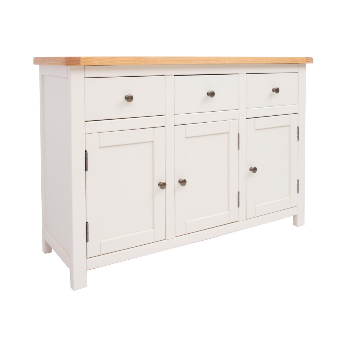 Our Maggiori collection has a simple but pleasing design and is produced by our skilled craftsmen to the highest standards using responsibly sourced wood and veneers. All tops are made using a combination of solid pine wood and veneers and are carefully hand waxed giving it a great look. The body is finished with a high quality eco-friendly water base paint in an off-white colour. This large 3 door 3 drawer sideboard will look at home in your dining room or lounge. The three doors conceal a large cupboard space for storing crockery, bottles or glassware and there is also a shelf to further organise your contents. Above this there are three drawers for storing your cutlery, napkins, coasters or even paperwork you need to hand. These attributes combined with a simple construction for easy assembly makes it a great value product to be taken home today.