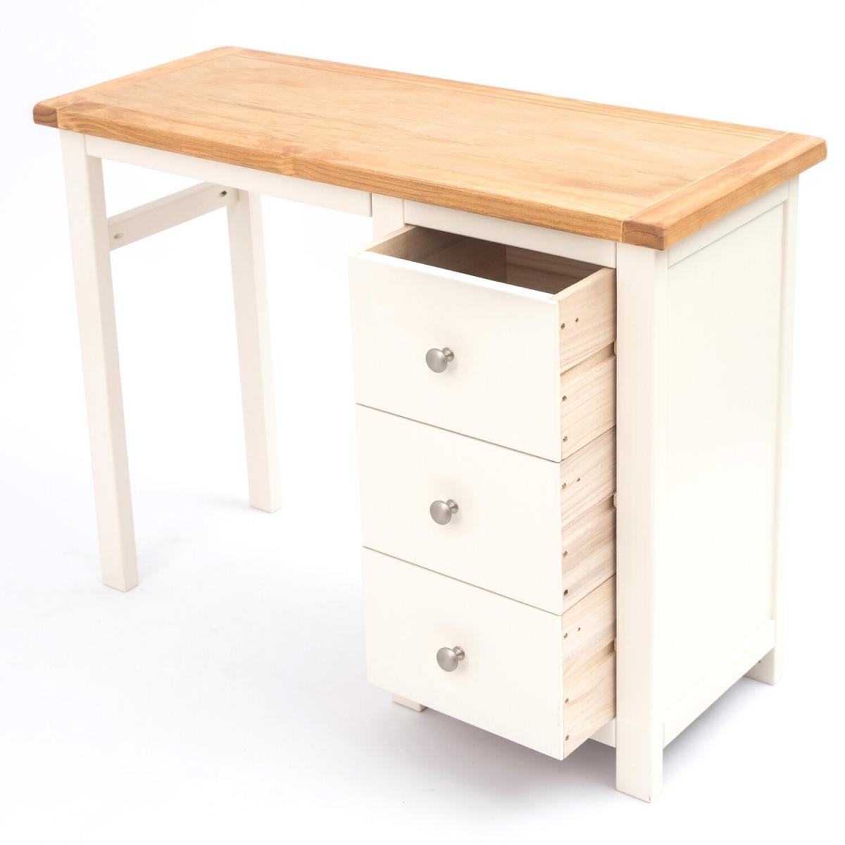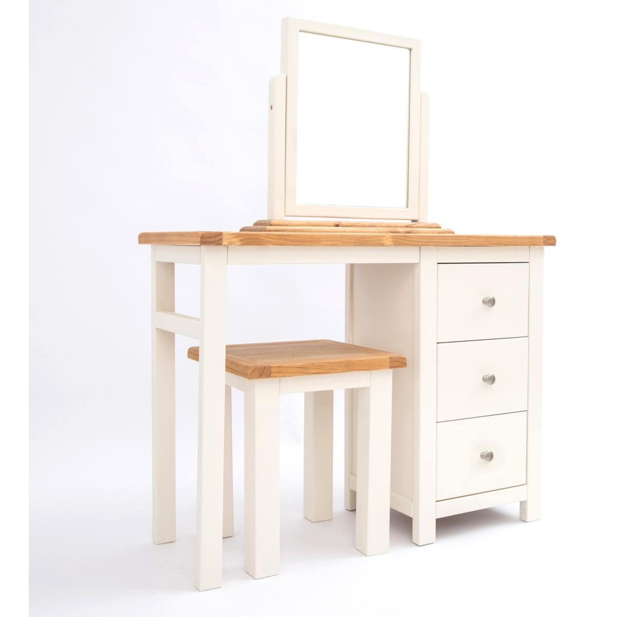 Our Maggiori collection has a simple but pleasing design and is produced by our skilled craftsmen to the highest standards using responsibly sourced wood and veneers. All tops are made using a combination of solid pine wood and veneers and are carefully hand waxed giving them a great look. The body is finished with high-quality eco-friendly water base paint in an off-white colour. A versatile 3-drawer dressing table set, the perfect multifunctional piece for your bedroom. The 3 drawers offer plenty of space for your belongings. The pedestal part can be positioned to the left or right-hand side when assembling. The mirror and stool are individual pieces and can be used with the dresser or separately. These attributes combined with a simple construction for easy assembly make it a great value product to be taken home today.
