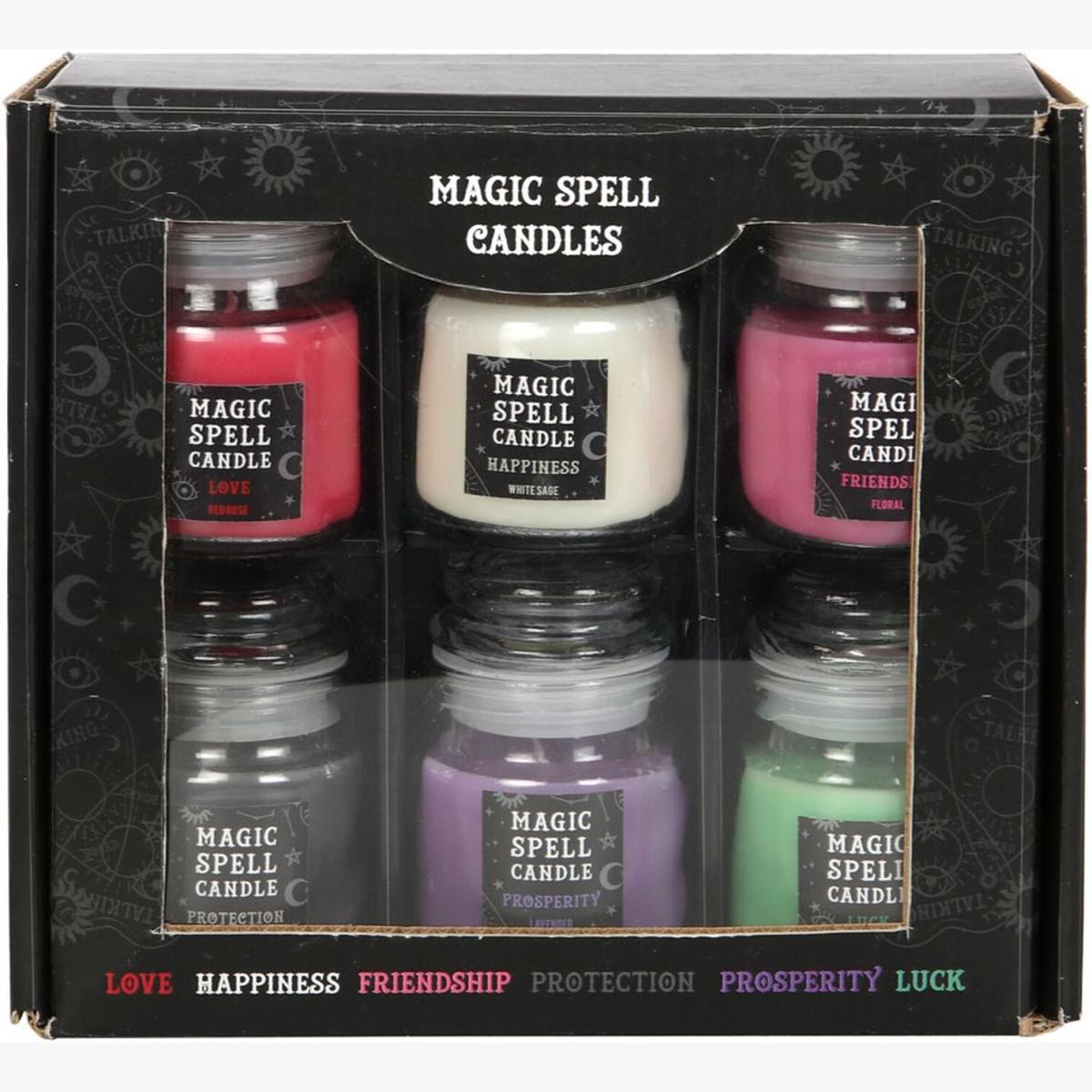 This captivating collection of mini spell candle jars includes six scented candles that are ideal companions for spellcasting and other rituals. Whether used for candle magic or as alternative decor, this set makes a great gift. Fragrances include Love (red rose), Protection (black opium), Friendship (floral), Prosperity (lavender), Happiness (white sage) and Luck (green tea). Paraffin wax. Approximately 15-hour burn time