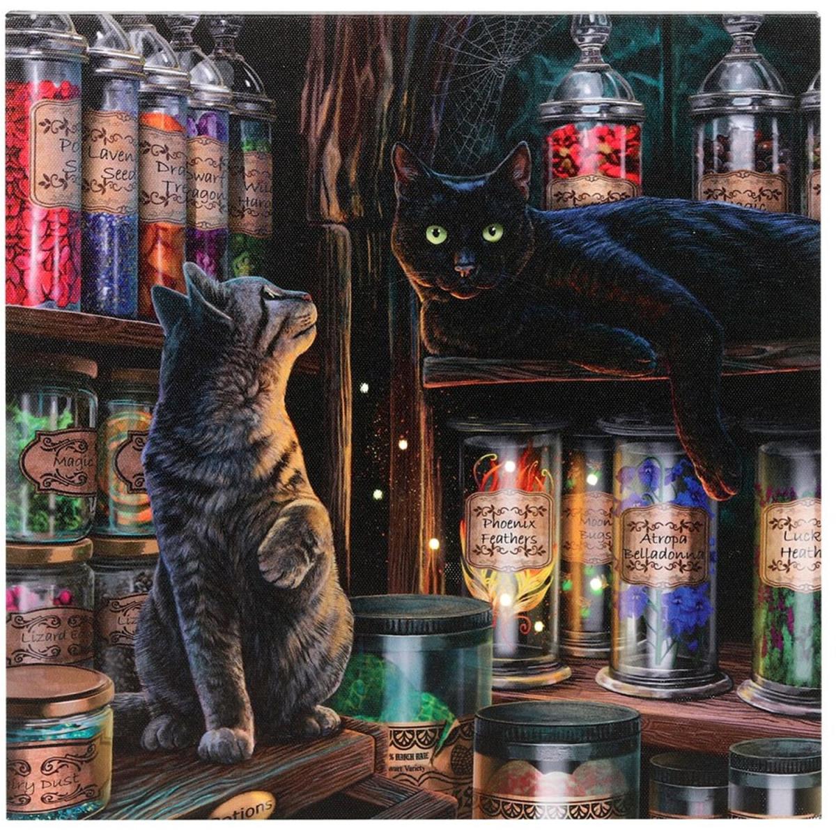 Measuring 30x30cm this square canvas features a high quality colour print of the 'Magical Emporium' artwork by popular artist Lisa Parker. Light up details bring this magical piece to life. Requires 2 x AA batteries which are not included. The switch is located on the side of the canvas.