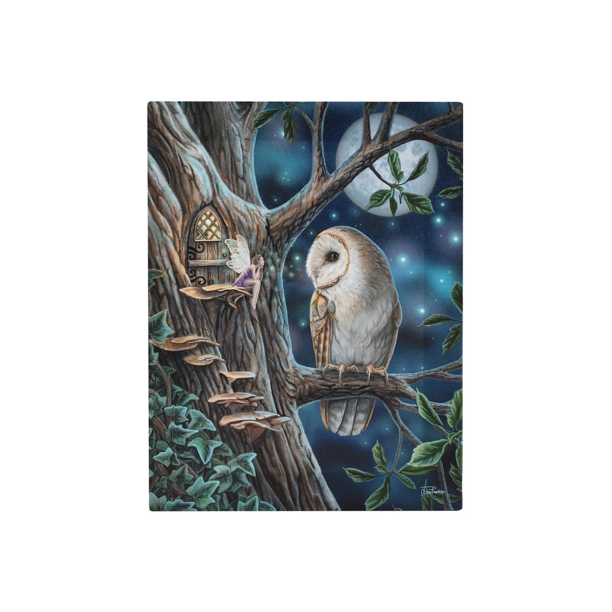 This charming fairy tale magical canvas features a perched owl with a fairy sitting in a tree on a moonlit background. Art design by Lisa Parker. The canvas is mounted in a wooden frame. Height 25 cm, width 19 cm.