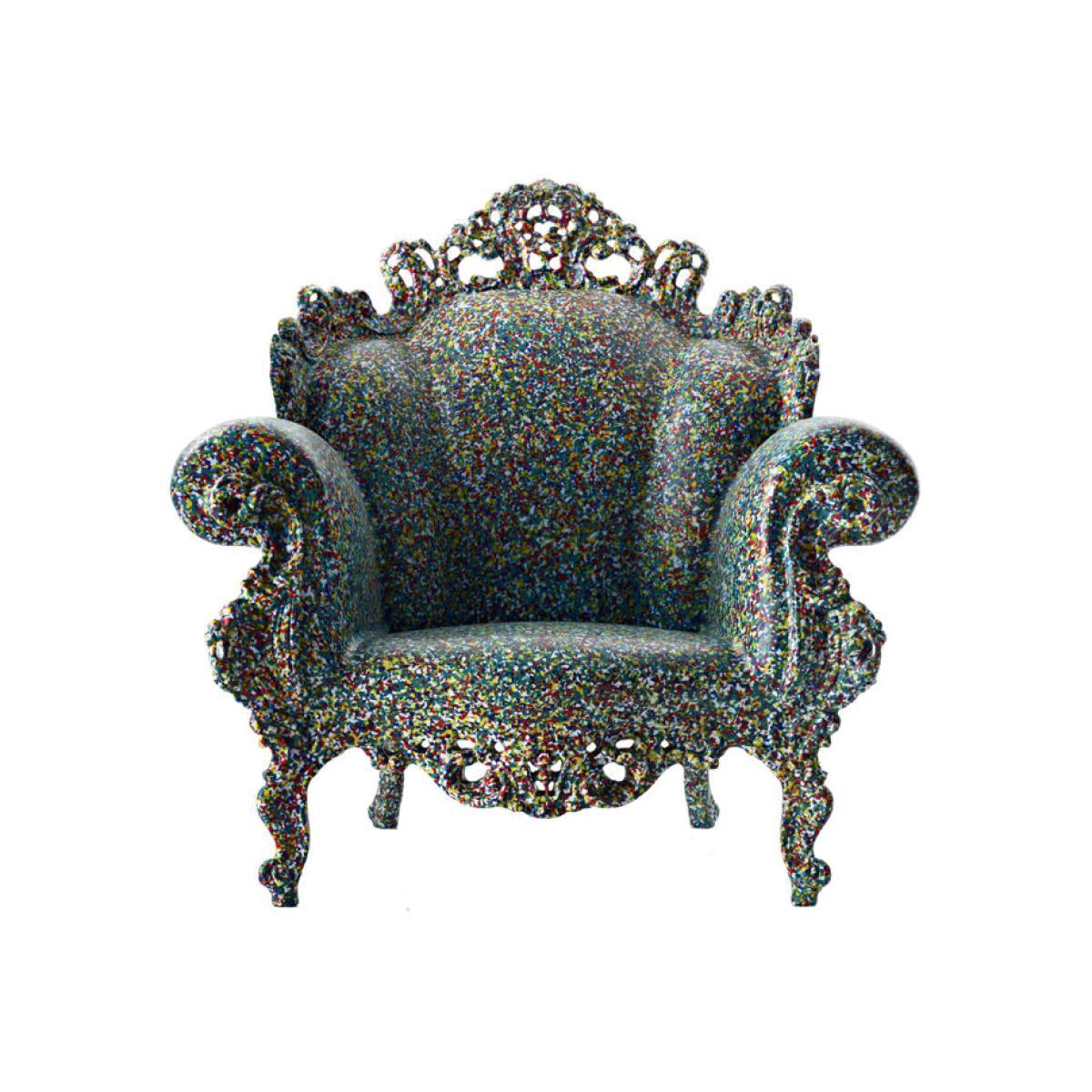 "Many people should already know the famous ""Poltrona di Proust"" (1978). It is a romantic baroque armchair, on which an endless number of polychromatic points are painted by hand using the pointillism technique. These points invades the whole armchair, its fabric and also the wooden decorations. It's a re-design work. It is, in fact, the collage of a mock-ancient armchair and of a detail from the garden by the French painter Signac. From 1978 onwards the Poltrona di Proust was realized in many versions, different in colors, materials and dimensions and was even made of ceramics and bronze. It traveled all around the world and was hosted in many museums. Now a real unexpected news. A paradox becoming true. Now the ""Poltrona di Proust"" has become an industrial rotational-moulded object. Here's the new armchair ""Magis Proust"". It is a technical and production gem. A new energy of colours and atmospheres for a timeless object. ".