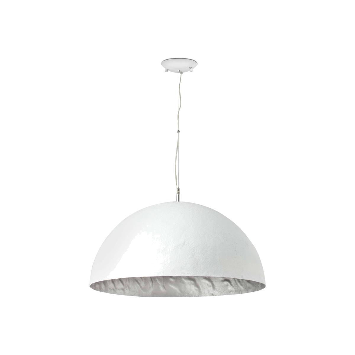 This is a fitting which will add a decorative centrepiece to the room, while providing the necessary light at the same time. The pendant is suitable as a main light fitting in the room, with its round, wide shade allowing the light to spread to a large area. The pendant is offered in three different finishes white and silver, white and gold, and black and gold. The fitting is made out of fibre-glass for an original feel. Class one.