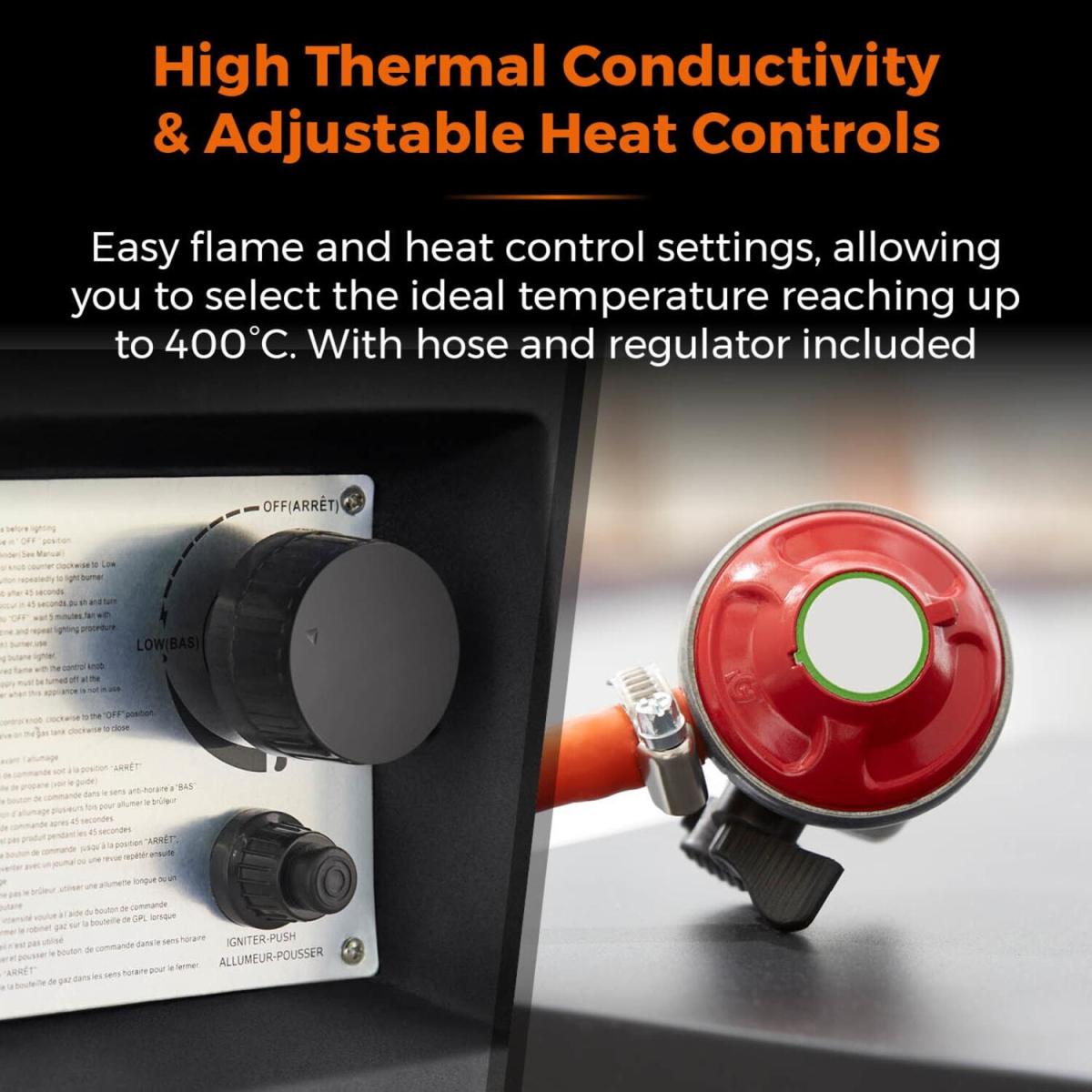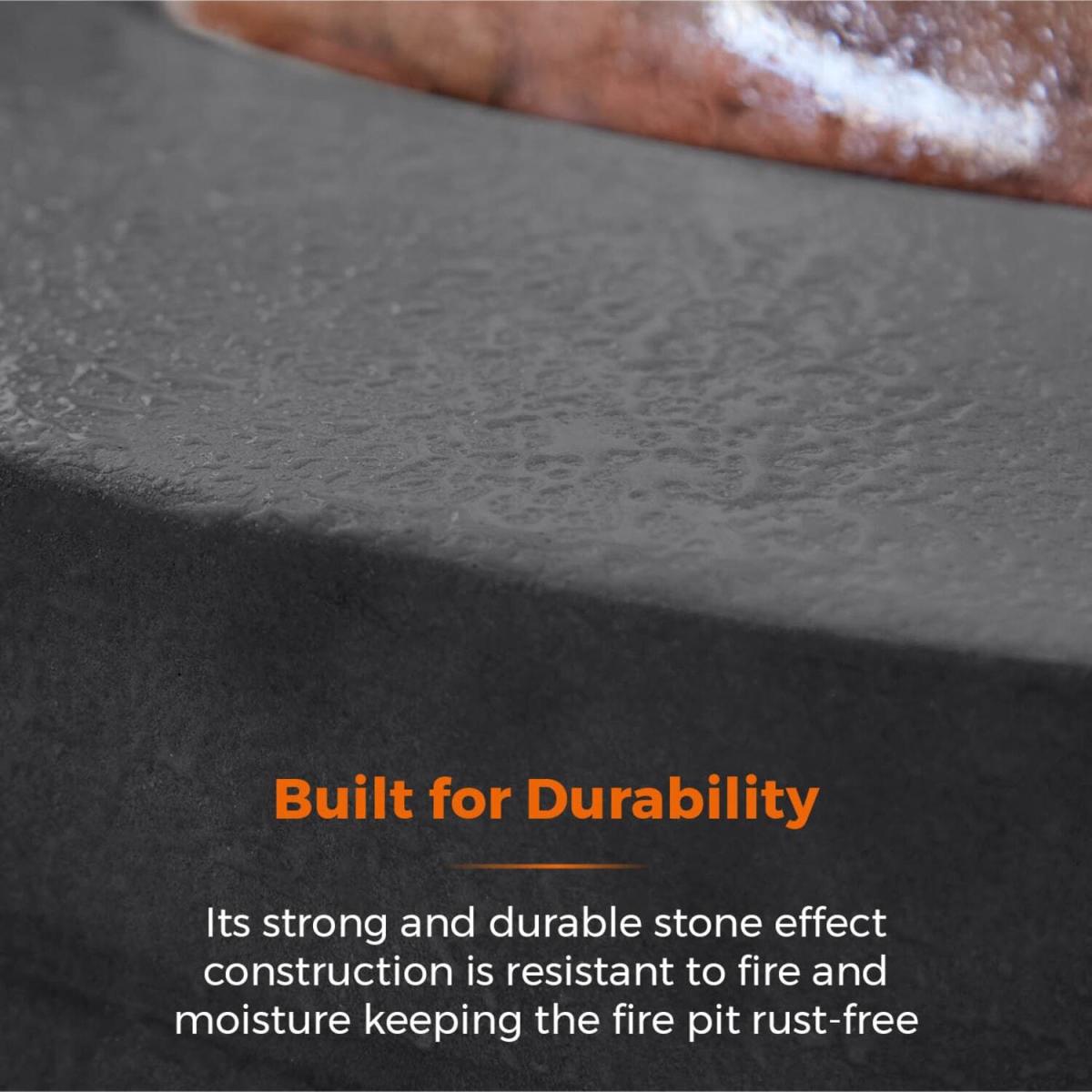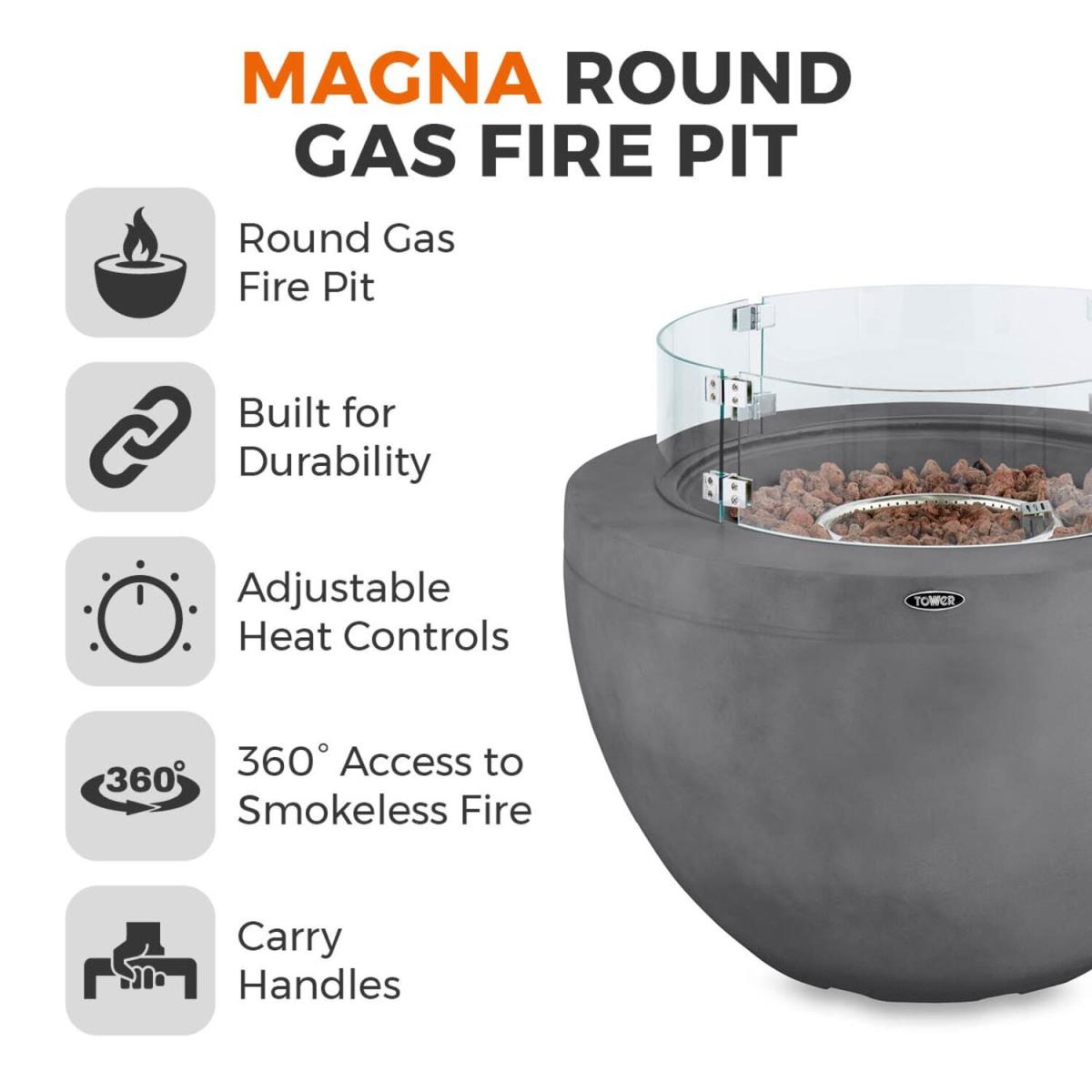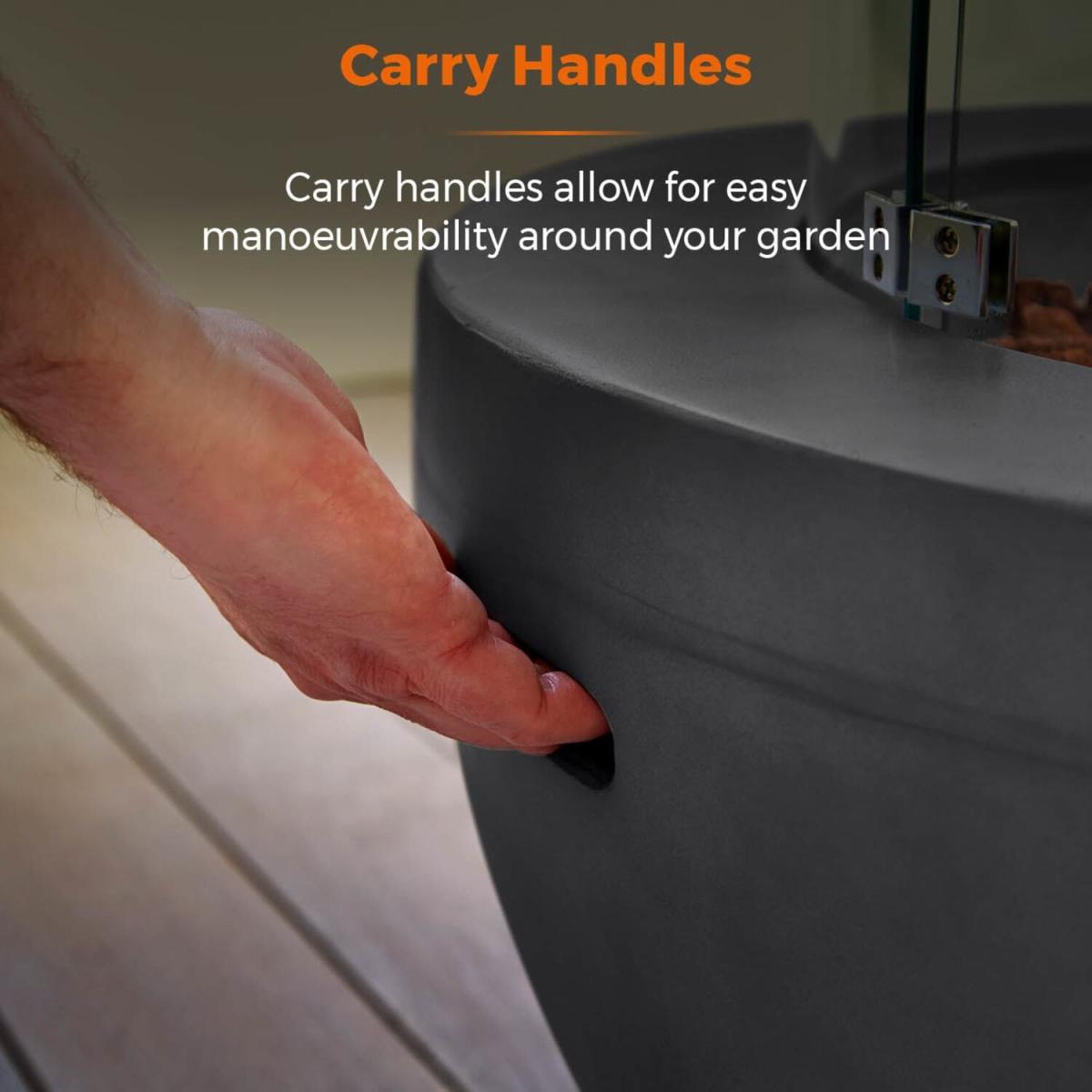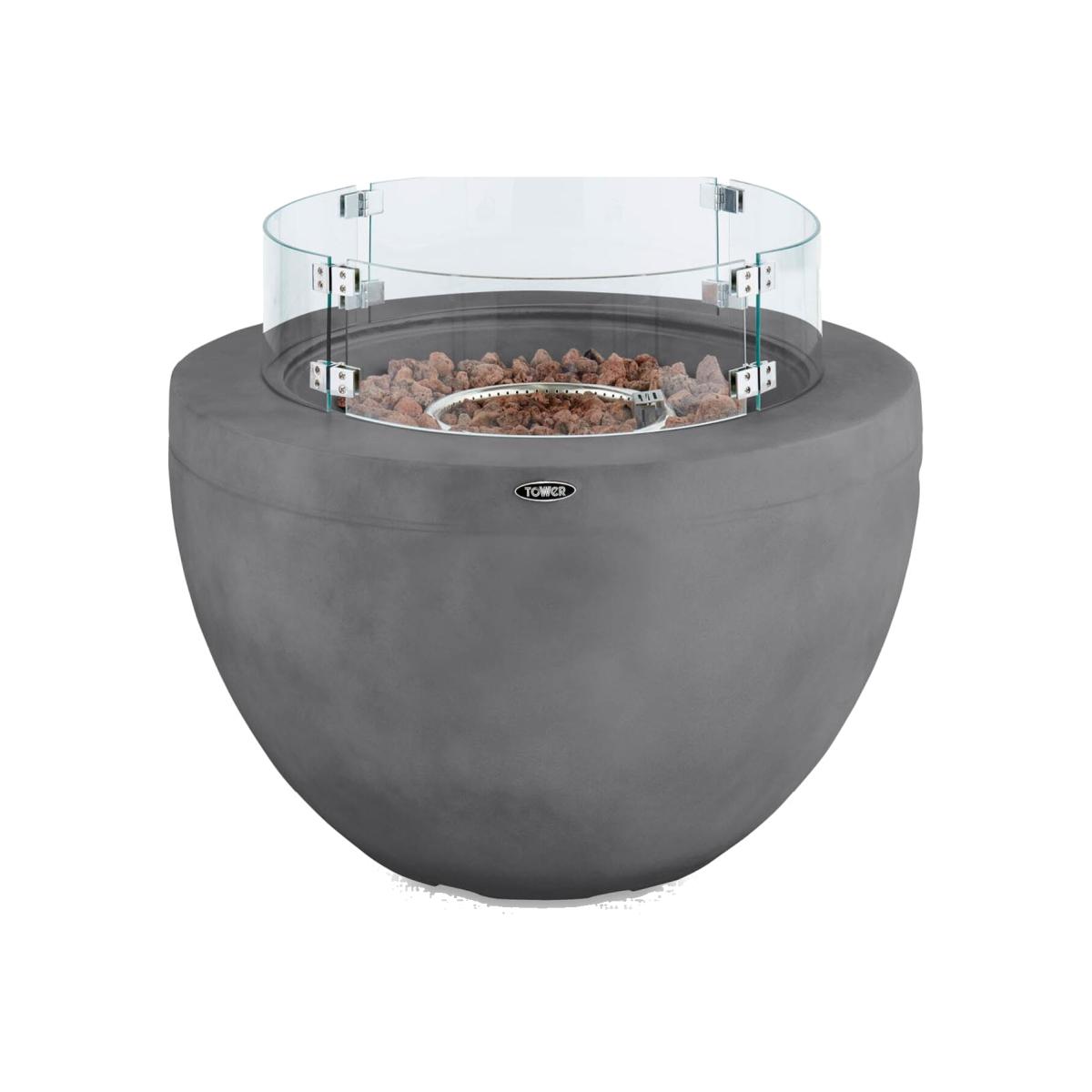 Keep yourself, friends and family toasty warm while spending time in the garden with Tower's natural stone designed round fire pit. The strong and durable stone effect construction is fire and moisture resistant, meaning the pit can withstand high temperatures and all sorts of weathers without causing any damage. In addition, the magnesium oxide construction is a high thermal conductor, warming the pit up quickly and efficiently meaning you and your guests will feel its benefits in rapid speed. The adjustable heat dial allows you to select the ideal temperature for you, reaching up to 400. C when running for just 5 minutes, and can reach temperatures of up to 600. C when running for 30 minutes! Its 360 access provides even heat emission and distribution while fuelled by gas, meaning it does not emit smoke, producing less air pollution and is more environmentally friendly.