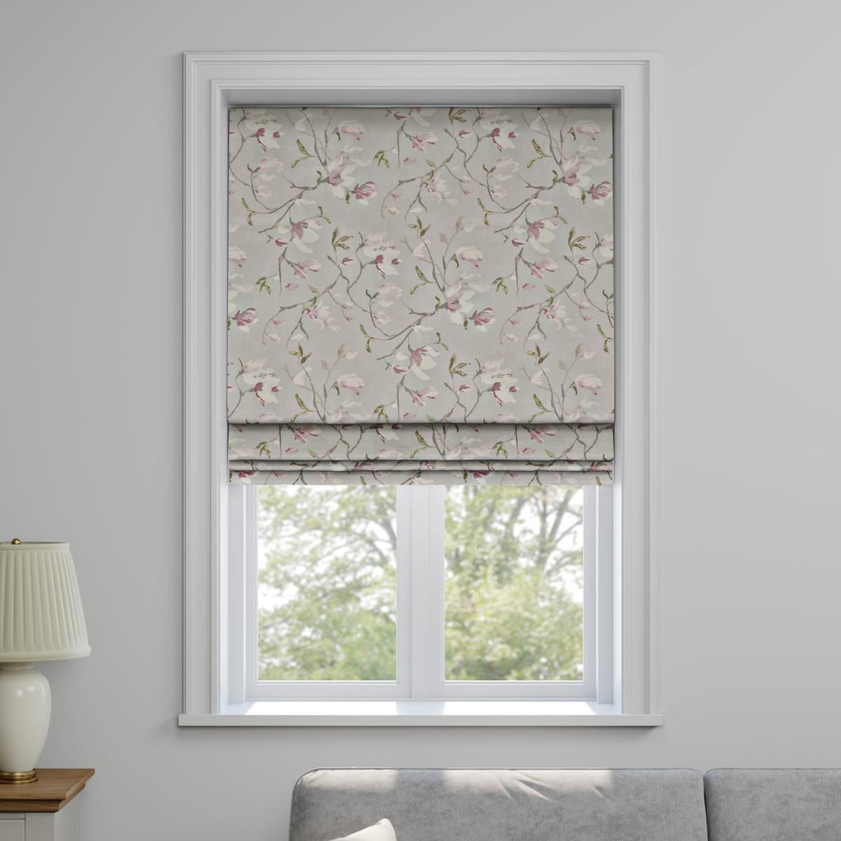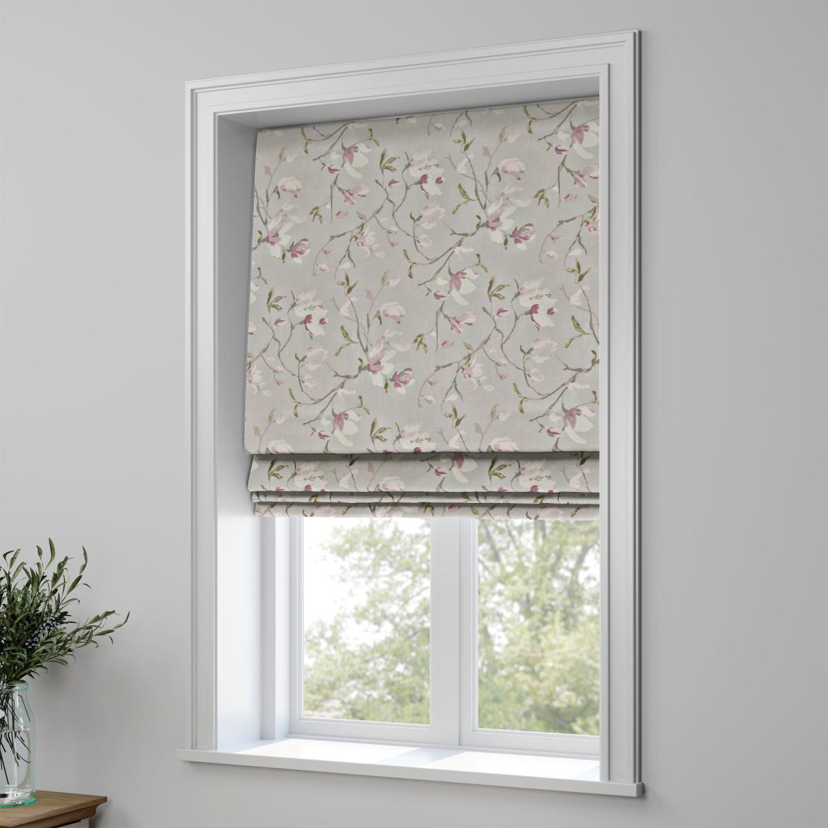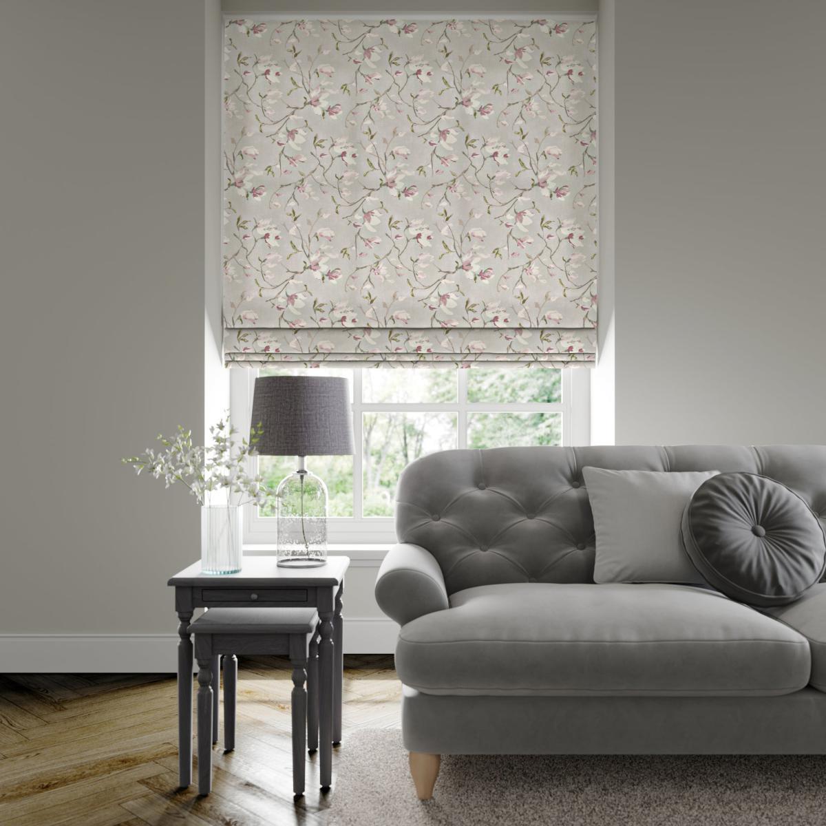 * Choose from 3 linings* Select your fitting type* Pick a side for the operating chain The Magnolia range of Roman Blinds are available in different colourways and offer a delicate printed floral design to help welcome a personal touch into your home.**Choosing your lining:*** Blackout provides minimal light disturbance in your home making it perfect for bedrooms. * Thermal helps to keep the warmth in and the cool air out meaning it’s great for family rooms or lounges. * Our Standard Lining is perfect if you like the glow of natural light whilst your curtains are closed whilst still maintaining your privacy.**Choosing your fitting type:*** Inside the recess: this gives a tidy, snug finish as it’s made to fit your window exactly. * Outside the recess: this option is great if you don’t want the blind to be visible from the outside when it’s drawn up.**Choosing which side you’d like the operating chain:*** Think about where your blind will be situated and what furniture may be near it – choose the side that is easier for you to access.**Need help deciding or measuring?**Book a free appointment with one of our consultants! dunelm. com/category/made-to-measure/book-an-appointment).**Child Safety:**We add clips to the back of our roman blinds to attach the cords to the fabric. They also double up as a child safety feature. If pressure is exerted the clips will detach to prevent the risk of strangulation. Please read our [Blinds Safety Guide](https://www. dunelm. com/info/buying-guides/blinds-safety-guidance) for more information. If the clips detach accidentally during normal use, they can be easily re-clipped back into place. Please note: If your measured width is over 130cm your blinds may come with a fabric join to provide the full width required.