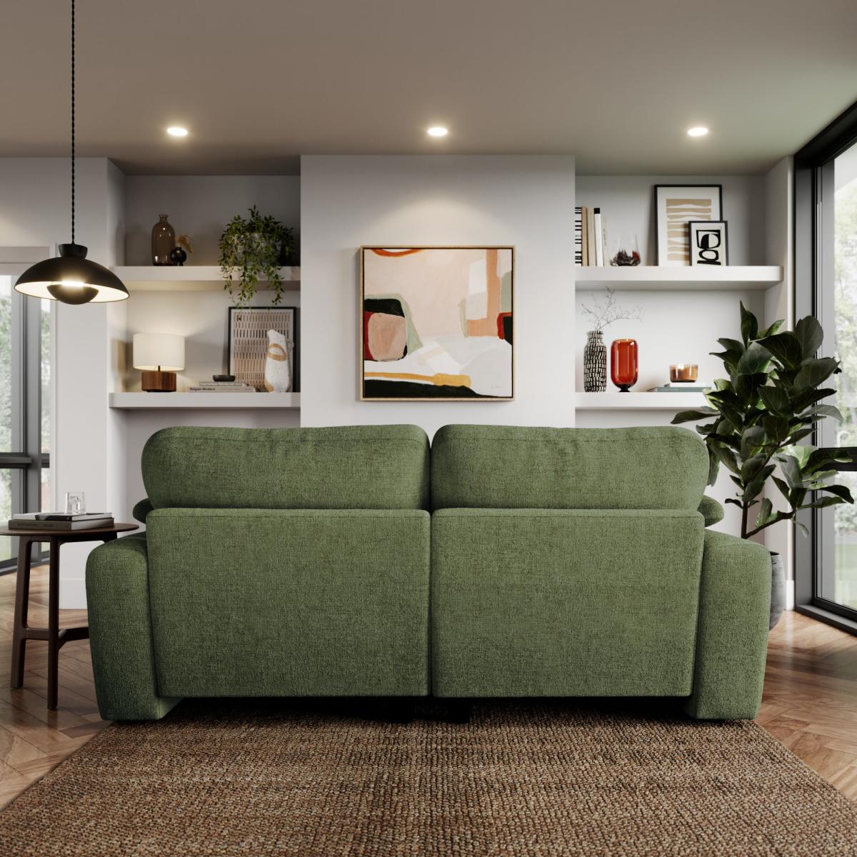 I love this corner sofa because of its soft textured chenille fabric, which adds a cosy, inviting feel to any interior. The soft green hue is versatile, working well in both modern and traditional living spaces, especially those looking for a colour refresh without being too bold. It’s a practical choice for family rooms or social areas due to its generous size and durable, tactile fabric. To style around it, consider adding cushions in complementary colours or textures, such as neutrals or muted patterns, to enhance its relaxed vibe. Pairing it with a neutral or wooden-toned coffee table and some ambient lighting will complete a welcoming, contemporary look.