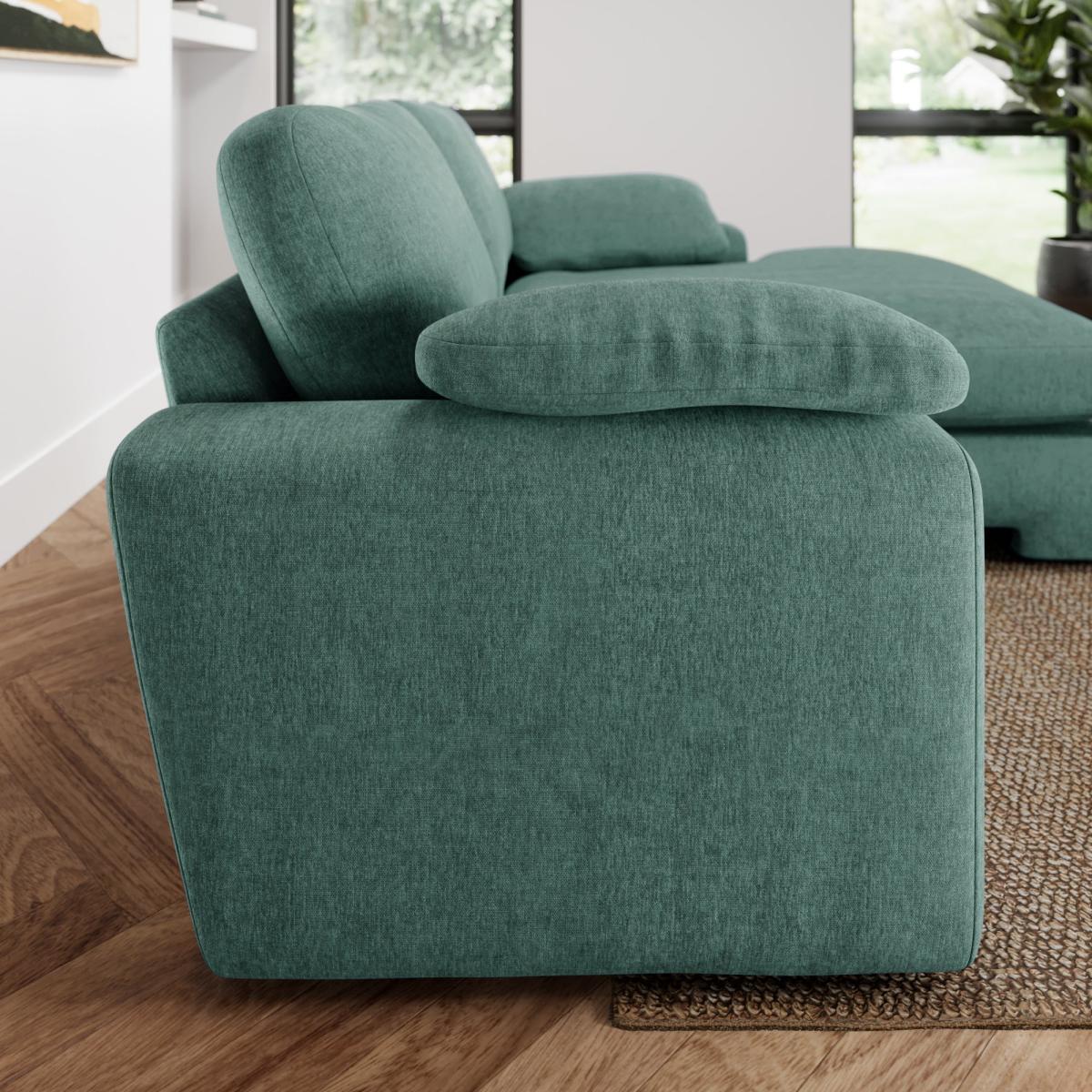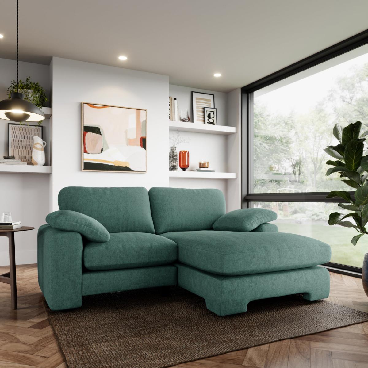 I love this corner sofa for its versatility and tactile appeal; the vintage chenille fabric adds a subtle texture that makes it feel inviting and cosy. The aqua hue works particularly well in contemporary interiors, offering a pop of colour that can be balanced with neutral tones or complemented by other colourful accessories. It suits both modern and retro-inspired spaces, especially when paired with wooden or metallic accents for a balanced look. Practical styling tips include layering with throw cushions in different textures and shades, and placing a statement rug underneath to anchor the seating area. Its generous size makes it ideal for relaxed living rooms or open-plan spaces where comfort is key.