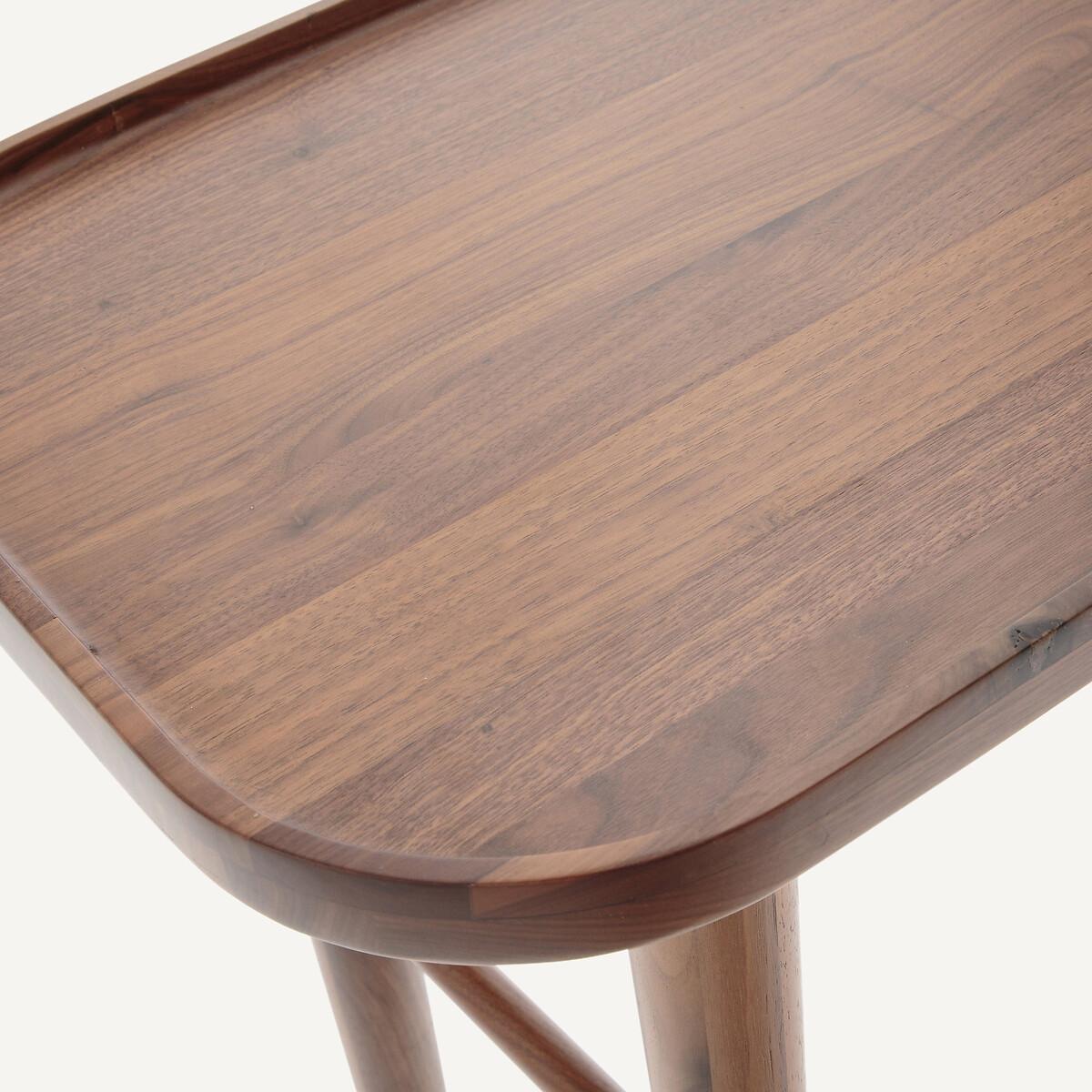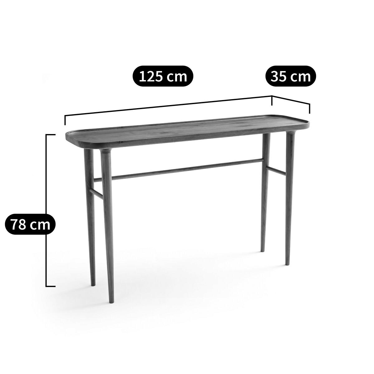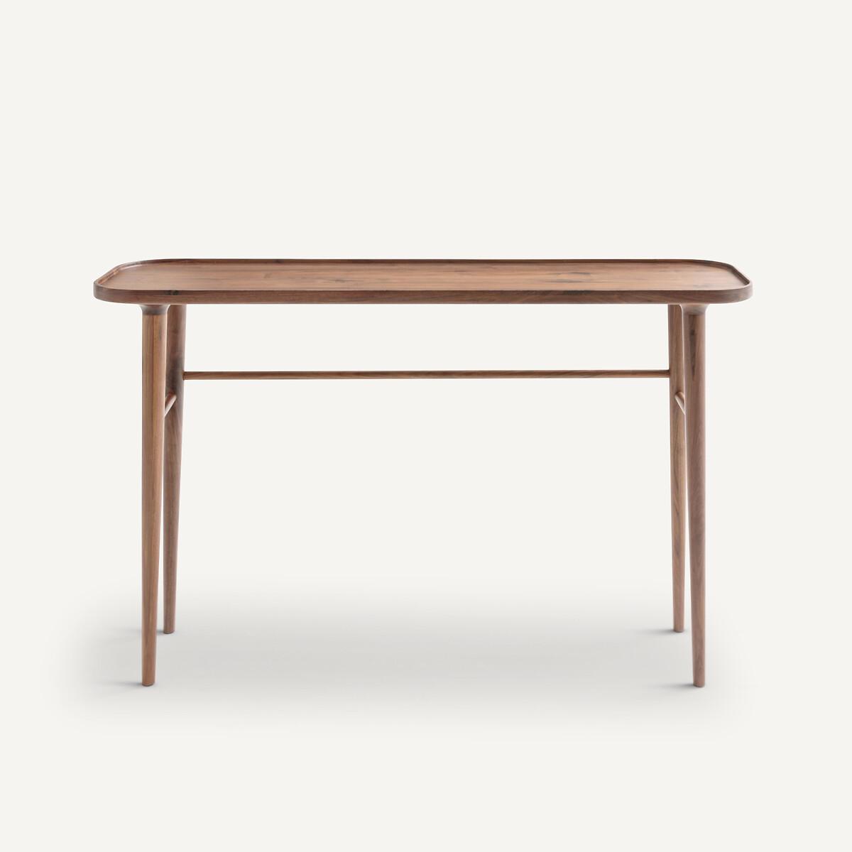 Magosia console. Stiletto feet, end tray and realization in solid walnut, this narrow console will be perfect in an entry or behind a sofa. Product Details • Solid walnut with a polyurethane finish • Sleek tapered legs. • Delivered screw-on feet, instructions attached. Dimensions • L125 x H78 x D35cm. Delivery: • This product will be delivered to your home. Note! Please check that all access points are large enough to accommodate your delivery (doors, stairs, lifts). Dimensions and weight of parcel:L132.5 x H18 x D42cm, 15kg.
