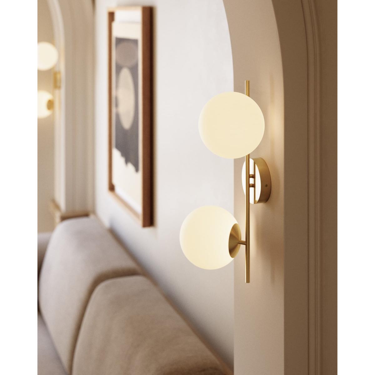 This wall light is a clever blend of industrial chic and modern elegance, making it a versatile piece that enhances a range of interiors. I love the brass finish-it adds warmth and a touch of sophistication, while the frosted glass spheres provide a soft, diffused glow that isn’t overpowering. It works particularly well in contemporary spaces, but can also add an interesting contrast in more traditional or eclectic settings. Practical styling tips include installing it alongside a mirror or above a console to create a layered lighting effect, or using a pair on either side of a statement piece for symmetry. Its sculptural form makes it a strong visual element on its own, so keep surrounding décor simple to let the light fixture stand out.
