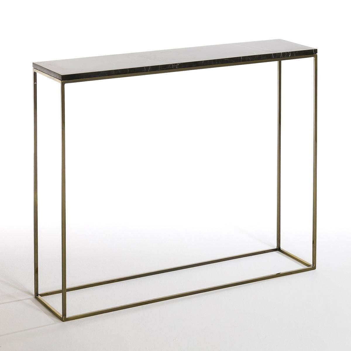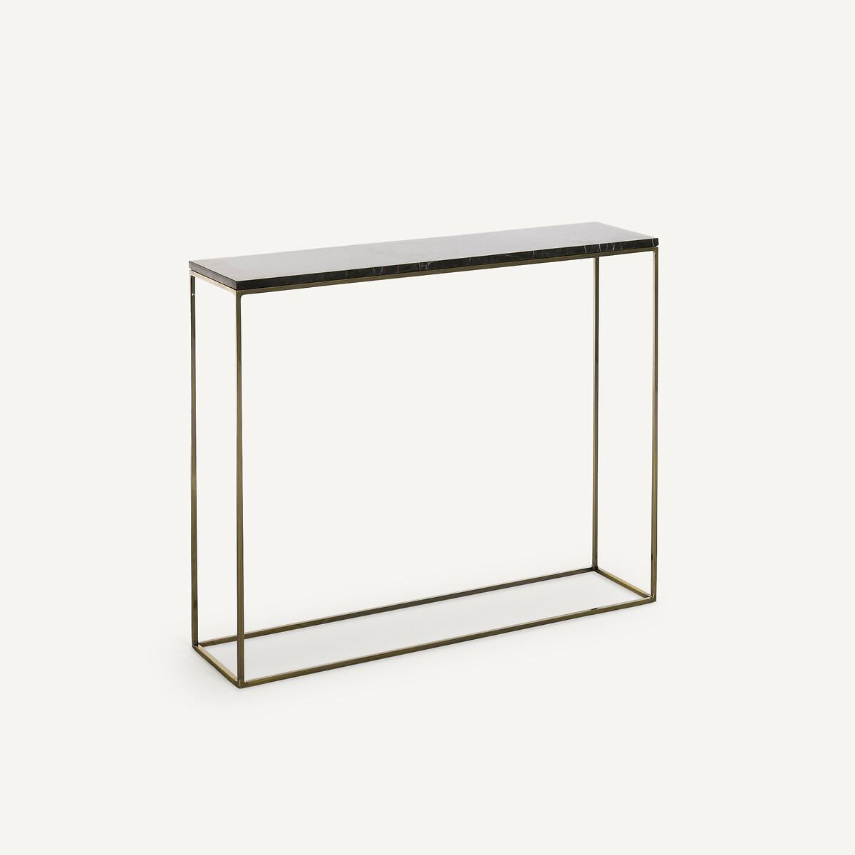 Mahaut console table. Marble is a timeless material that somehow seems to radiate quality. With these small yet playful touches. you'll easily find room in your home for this decorative and functional slimline console table. Product Details • Antique brass effect metal structure • 2 finishes for the top: brown or white top in real high-quality Carrara marble. Each piece is unique so the marbled effect may vary. Care Advice. Marble is a naturally porous material that is susceptible to stains. To keep it in good condition, follow the maintenance advice below: • Avoid placing hot objects on the surface, use coasters and trivets. • Immediately wipe up any spilled liquid with a white cloth dipped in lukewarm water and wrung out. • Maintain your marble regularly with products from our partner Akemi® • We advise you to use Akemi® Crystal Clean Spray for your daily maintenance and, at least once a month, Akemi® Triple Effect Spray to clean and protect your marble surface.. This will reinforce the initial treatment and its water-repellent effect will prevent dirt from easily penetrating the stone.. • If you want to use products other than those of our partner Akemi®, choose only p. H-neutral cleaners • Acid, anti-limescale or bleach-based products are not recommended. Dimensions • L90 x H75 x D22cmDelivery. Available for home delivery. Dimensions and weight of parcel2 parcels • L97 x H23 x D83cm, 12kg • L104 x H16 x D37cm, 17kg