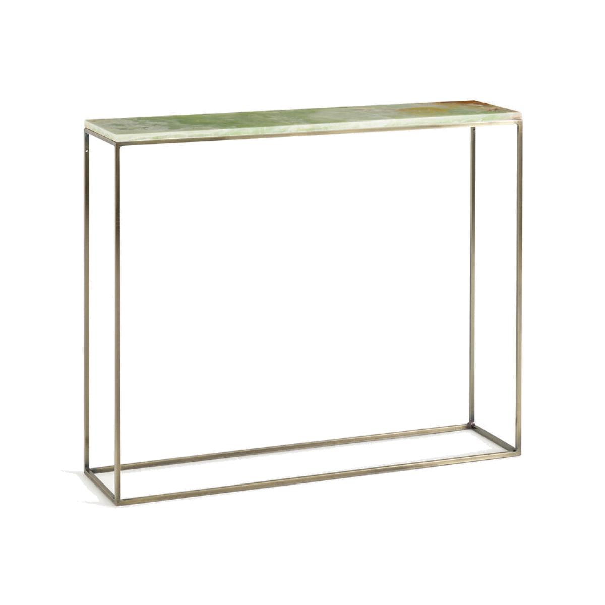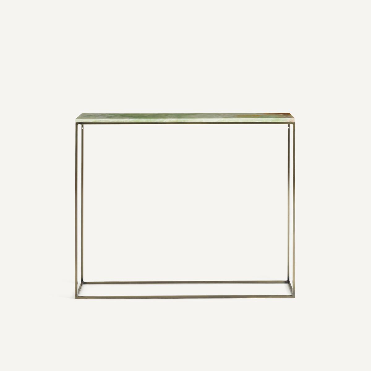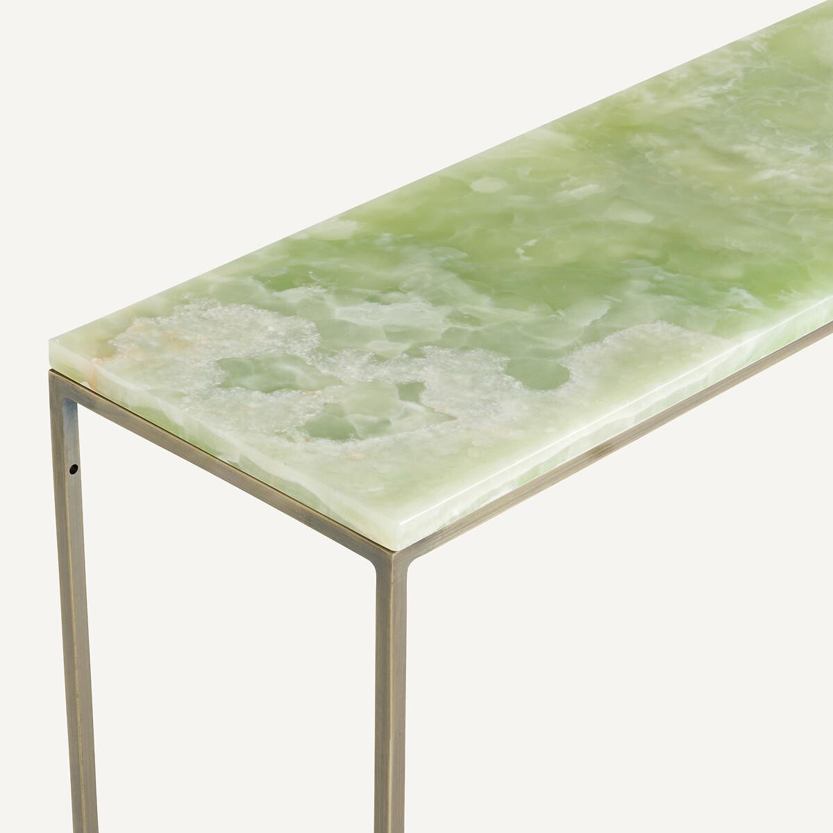 The Mahaut console is distinguished by its polished jade stone top. Between green and brown, the random colour of the top reveals the original character of the material.