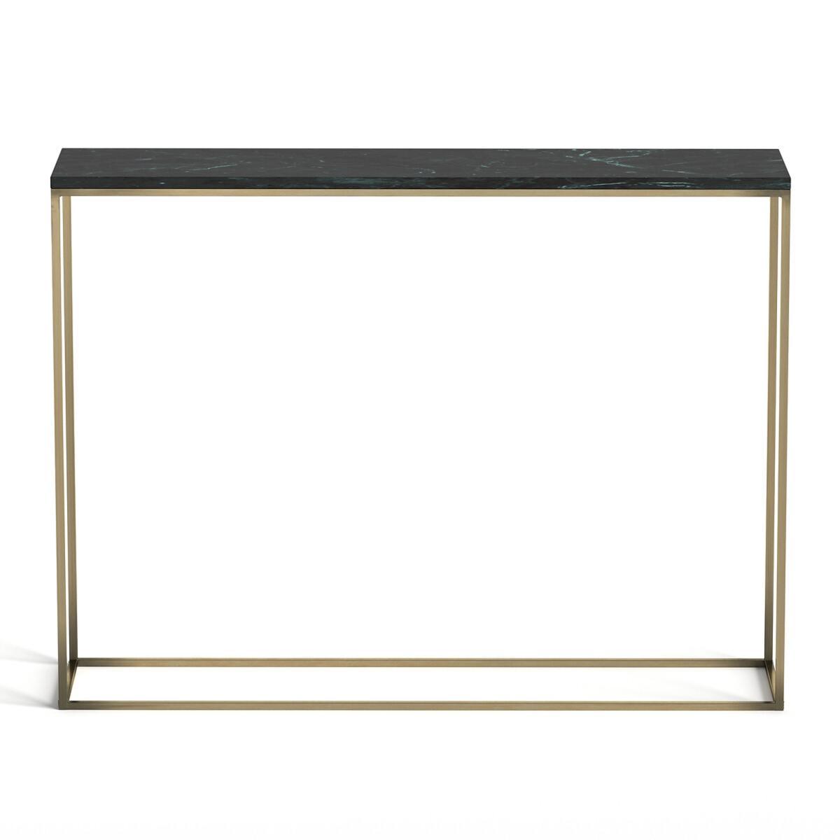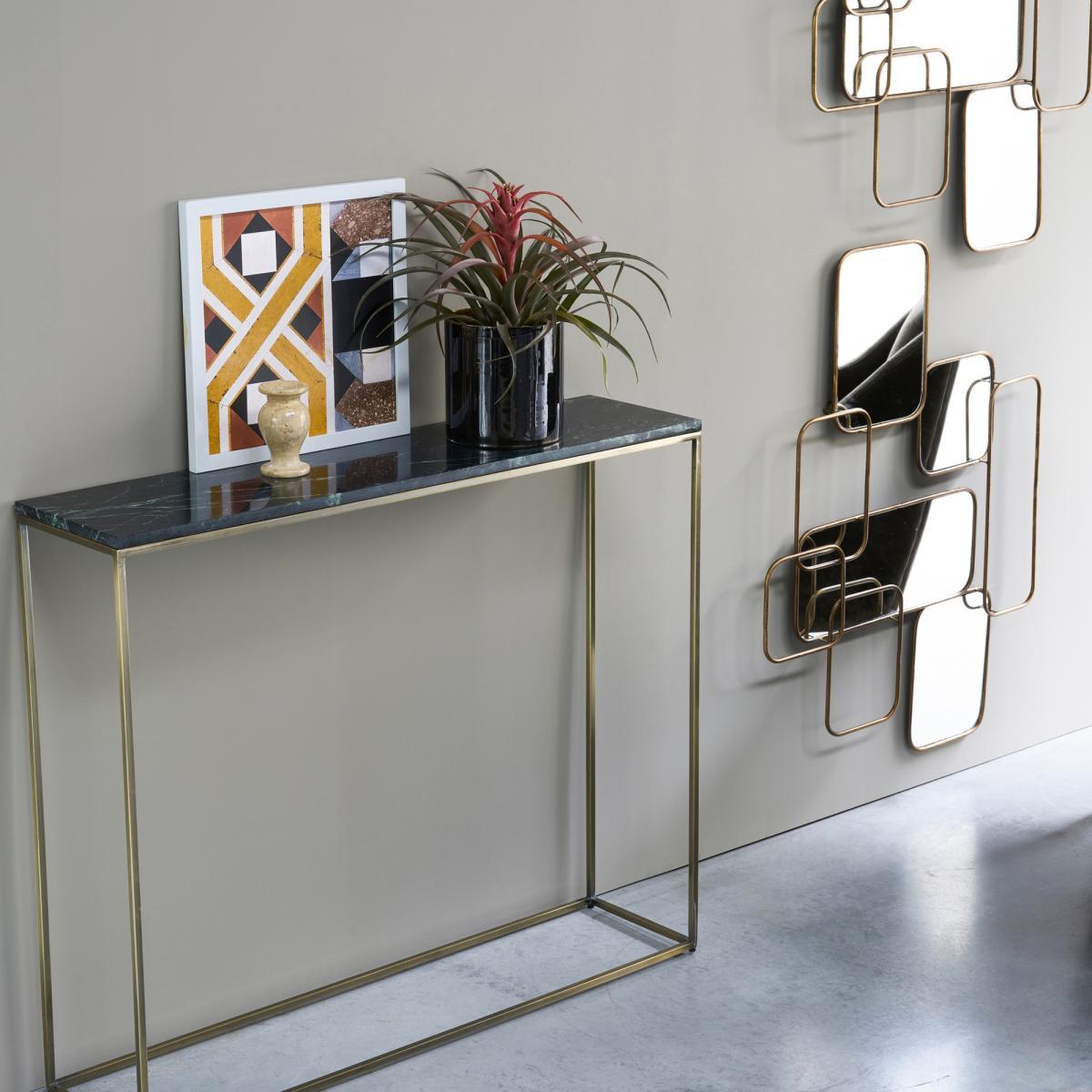 Mahaut console table. Marble is a timeless material that somehow seems to radiate quality. With these small yet playful touches. you'll easily find room in your home for this decorative and functional slimline console table. Product Details. Antique brass effect metal structure. Green marble top. Each piece is unique so the marbled effect may vary. Dimensions. Length 90 x Height 75 x Depth 22 cm. Home delivery:Your Mahaut console table will be delivered to your door ! Note! Please check that all access points are large enough to accommodate your delivery (doors, stairs, lifts).Dimensions and weight of parcel2 parcels. L97 x H23 x D83cm - 11.64 kg. L104 x H16 x D37 cm - 17.09 kg.