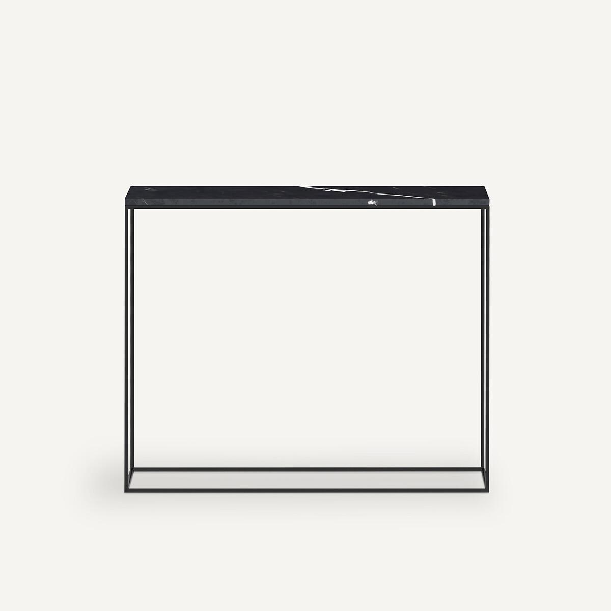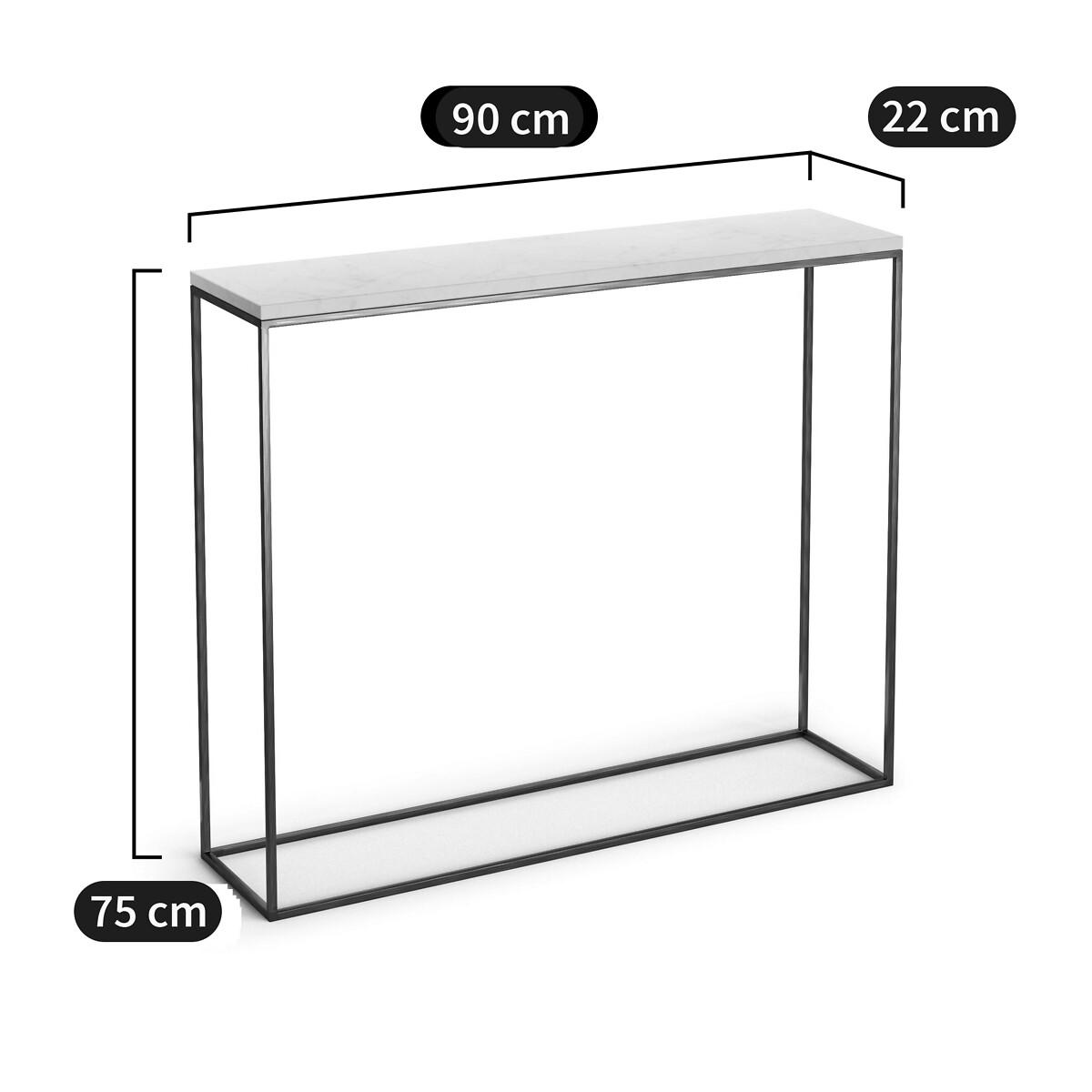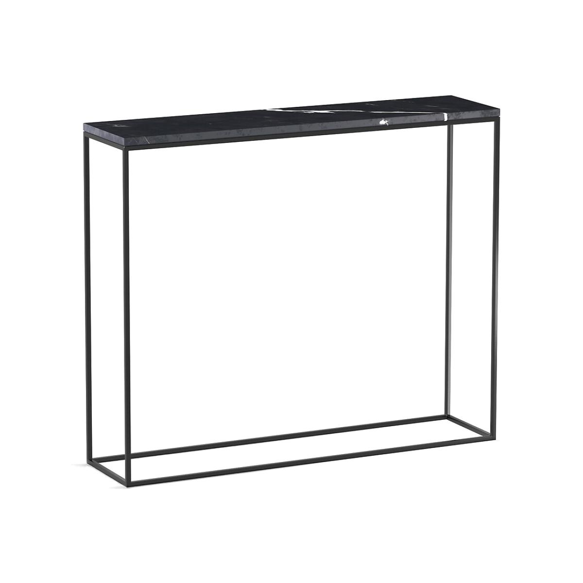 The Mahaut marble console table. Marble is a timeless material that somehow seems to radiate quality. With these small yet playful touches. you'll easily find room in your home for this decorative and functional slimline console table. Product Details • Tabletop in black marble (18mm thick). each piece is unique so the marbled effect may vary. • Structure in black metal epoxy finish • Shallow depth. Care Advice. Marble is a naturally porous material that is susceptible to stains. To keep it in optimum condition, follow the maintenance tips below: • Avoid placing hot objects on the surface, use coasters and trivets. • Immediately wipe up any spilled liquid with a white cloth dipped in lukewarm water and wrung out. • Maintain your marble regularly with products from our partner Akemi® • We advise you to use Akemi® Crystal Clean Spray for your daily maintenance and, at least once a month, Akemi® Triple Effect Spray to clean and protect your marble surface.. This will reinforce the initial treatment and its water-repellent effect will prevent dirt from easily penetrating the stone.. • If you want to use products other than those of our partner Akemi®, choose only p. H-neutral cleaners. • Acid, anti-limescale or bleach-based products are not recommended. Dimensions • L90 x H75 x D22cmDelivery:. The marble aspect of this Mahaut product is delivered to install yourself on the assembled structure. Available for home delivery. Dimensions and weight of parcel2 parcels • L97 x H83 x D23cm - 11.7kg • L104 x H16 x D37cm - 18.5kg