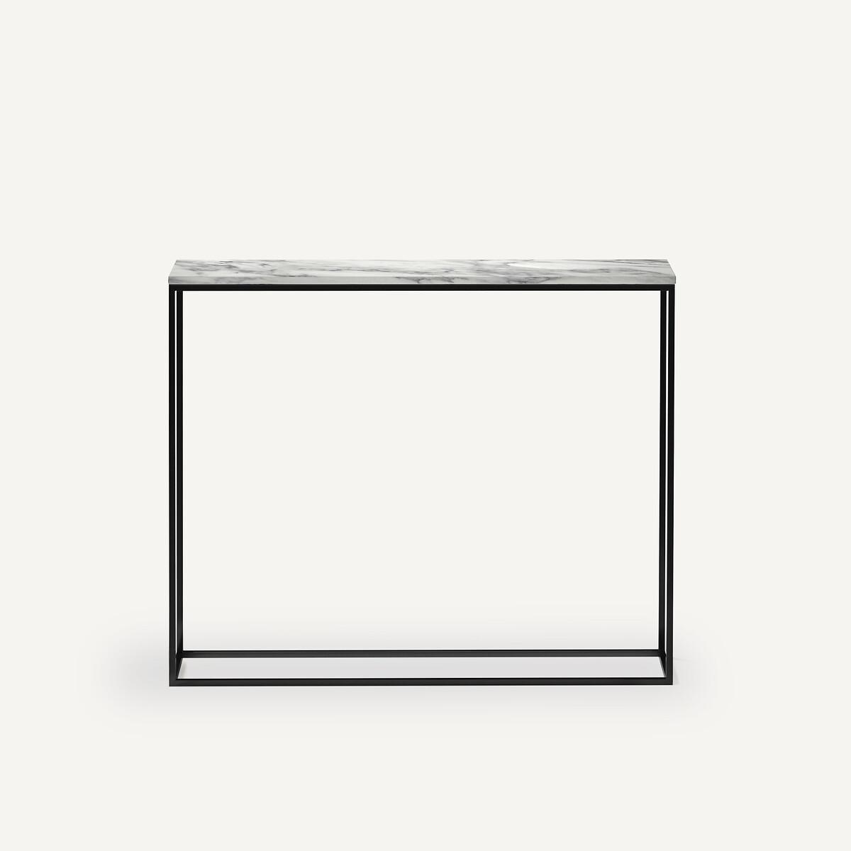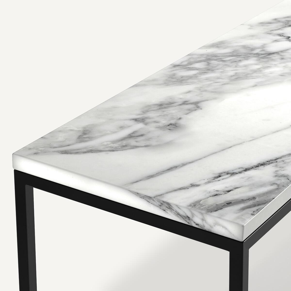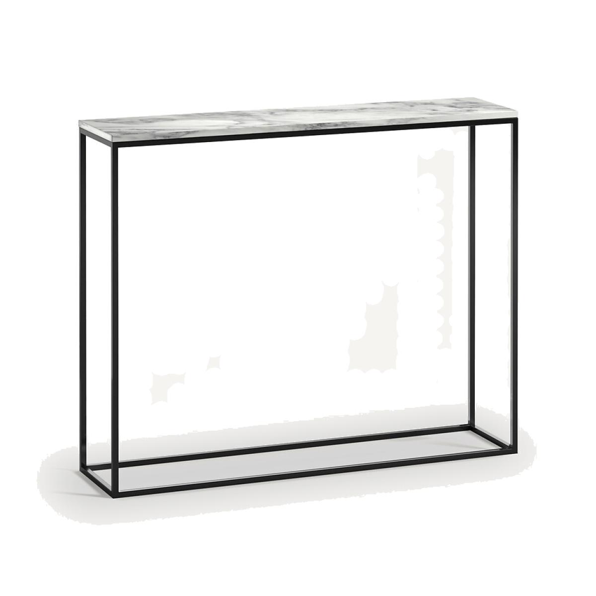 Mahaut console table. Marble is a timeless material that somehow seems to radiate quality. With these small yet playful touches. you'll easily find room in your home for this decorative and functional slimline console table. Product Details • Black metal frame, matte black epoxy finish • White Arabescato marble top, each piece is unique, the marbling is more or less marked. Care Advice. Marble is a naturally porous material that is sensitive to stains. To keep it in optimum condition, follow the maintenance tips below: • Avoid placing hot objects on the surface, use coasters and trivets. • Immediately wipe up any spilled liquid with a white cloth dipped in lukewarm water and wrung out. • Maintain your marble regularly with products from our partner Akemi® • We advise you to use Akemi® Crystal Clean Spray for your daily maintenance and, at least once a month, Akemi® Triple Effect Spray to clean and protect your marble surface.. This will reinforce the initial treatment and its water-repellent effect will prevent dirt from easily penetrating the stone. • If you want to use products other than those of our partner Akemi®, choose only p. H-neutral cleaners. • Acid, anti-limescale or bleach-based products are not recommended. Dimensions • L100 x D23 x H75.5cm. Home Delivery. Your console will be delivered to your home. Note! Please check that all access points are large enough to accommodate your delivery (doors, stairs, lifts).Parcel dimensions and weight • L100 x H23 x D75.5cm • 21kg