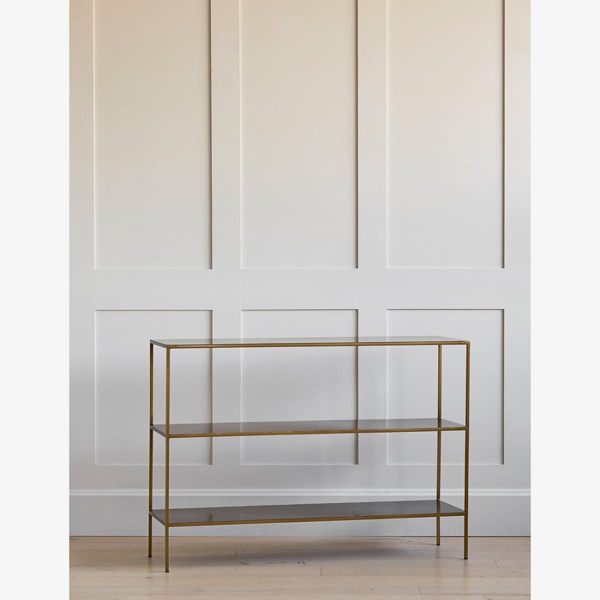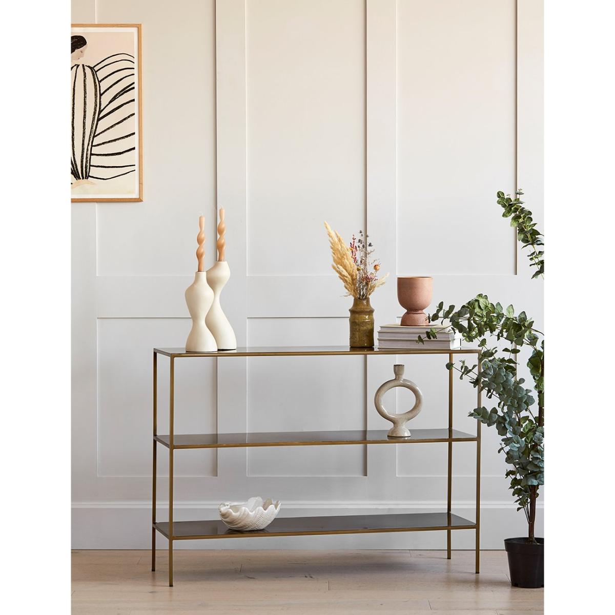 I love this console for its sleek, minimalist design and warm antique brass finish, which adds a touch of sophistication to any space. It’s incredibly versatile, working well in both modern and classic interiors-think hallway accents, entryway statements, or behind a sofa. Practical styling tips include using it to showcase a collection of decorative objects, plants, or framed photographs. Keep accessories streamlined and avoid overcrowding to let the elegant metal frame shine. It’s also a great size for small to medium spaces, offering both function and style without overwhelming the room.