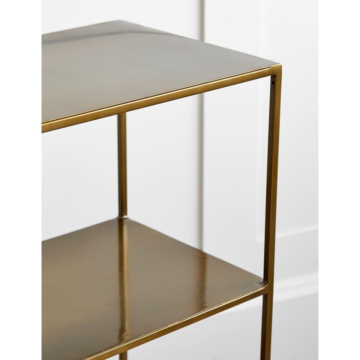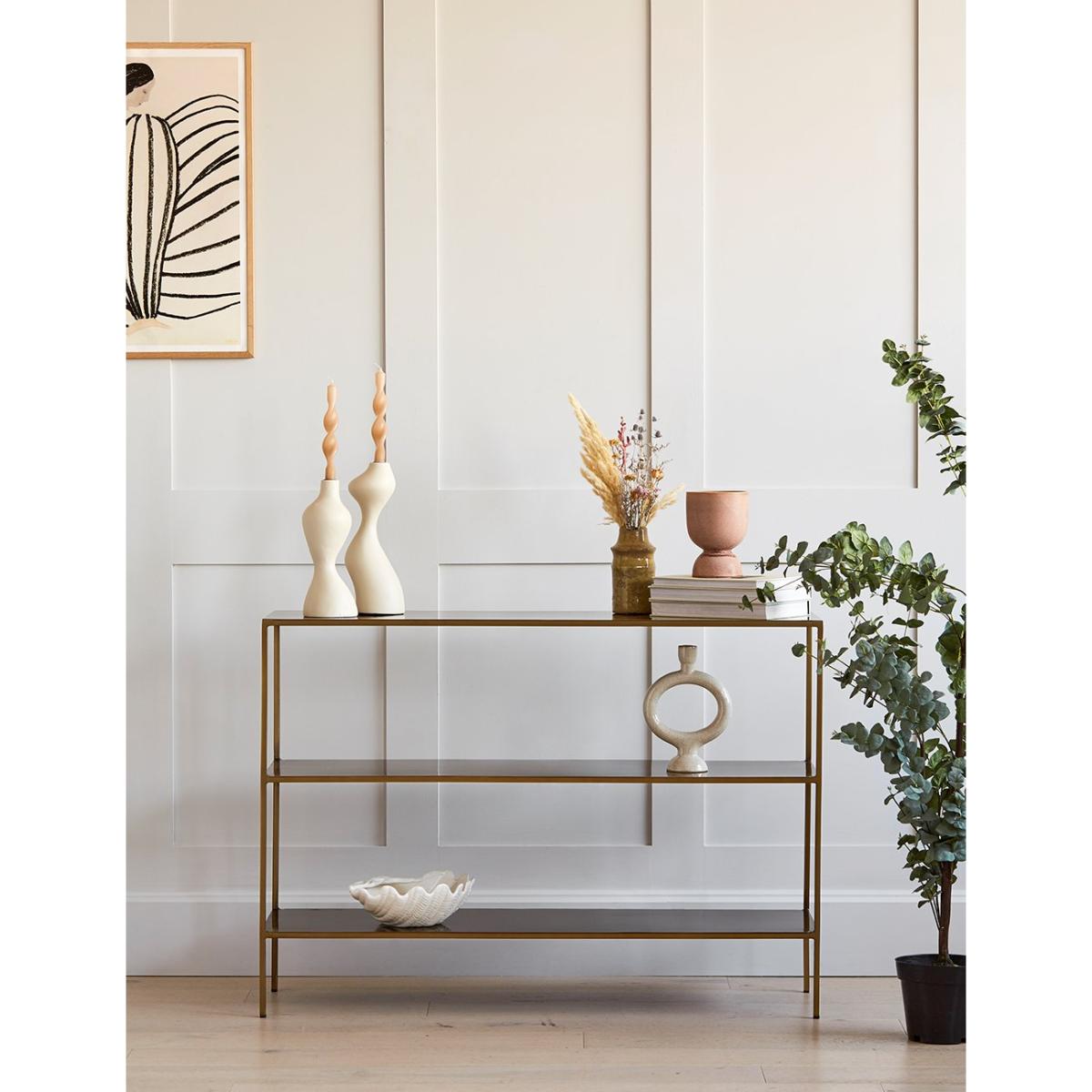 We love the simplicity and elegance of the Mahi furniture collection. This console table features an antique brass-effect frame and shelves. Place this in your hallway or in a reception room and use to display your favourite objects with a beautiful vase of flowers on the top. Matching shelves are also available - choose from a wide or narrow design.