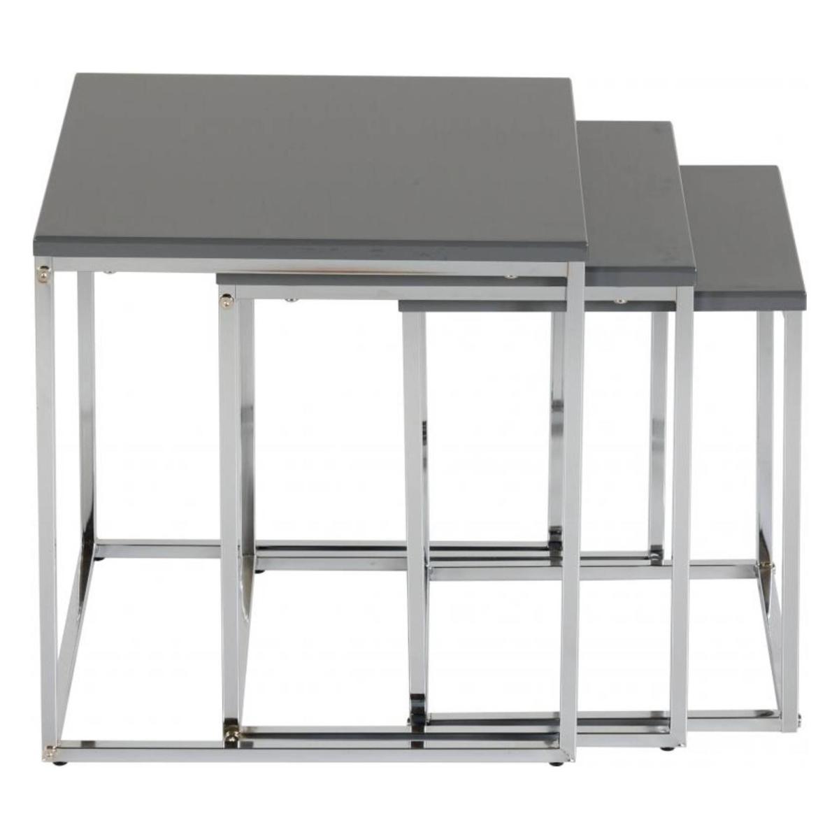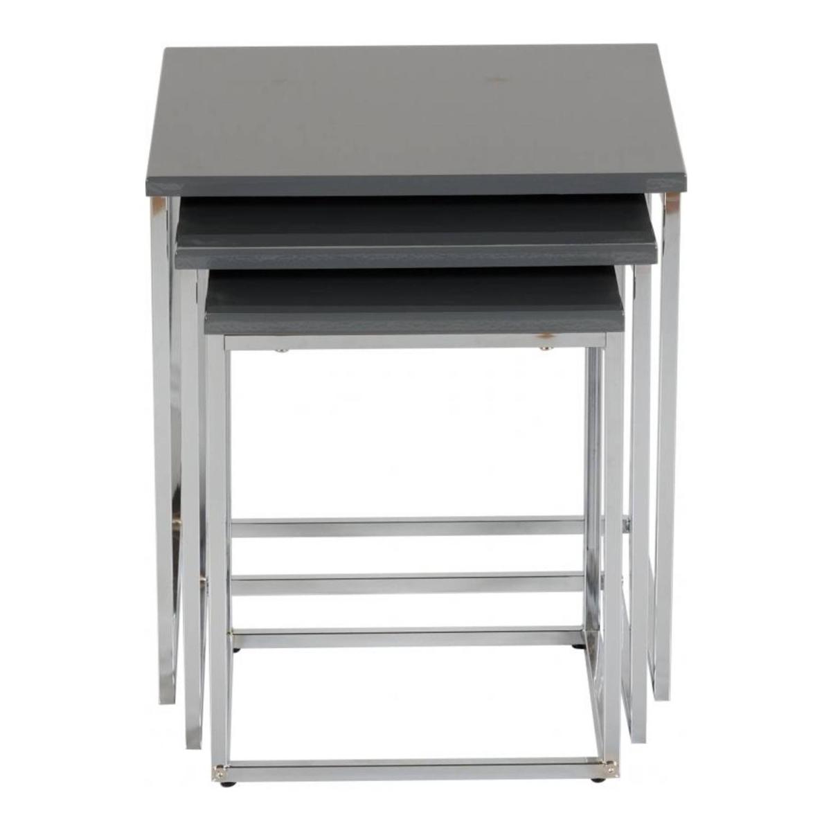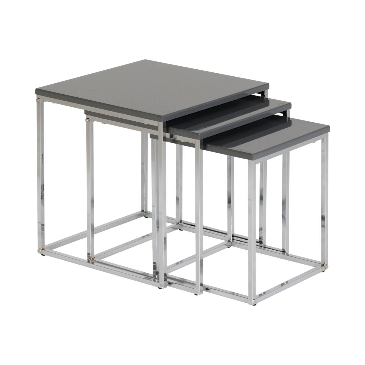 Contemporary set of tables boasting a grey gloss finish. Large Table. Medium Table. Small Table. A stylish addition to your home, this nest of tables is part of the Maiden range. This elegant set comes includes 3 tables, each boasting an acrylic table top with a grey gloss finish. Supporting each table top is a metal, box shaped frame, with a chrome finish. They are perfect for use in lounges, hallways and dining rooms.
