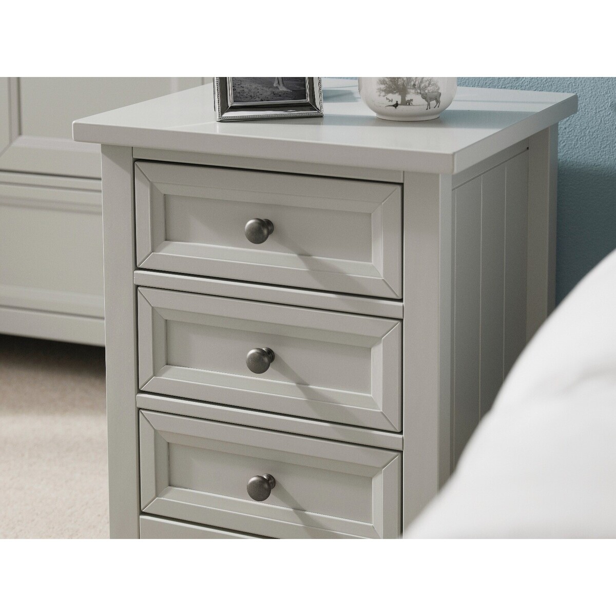 The Maine Three-Drawer Bedside Cabinet finished in a delicate dove grey lacquer brings contemporary elegance to your bedroom. With feature side panelling and classic chamfered cabinetry, this bedside table has a simple, gentle elegant which coordinates with many modern homes. Combines beautifully with the much larger Maine Bedroom Collection by Julian Bowen Delicate pewter handles finish the classic look Beautiful dove grey lacquer creates a modern look New England style panelling is both traditional and timeless