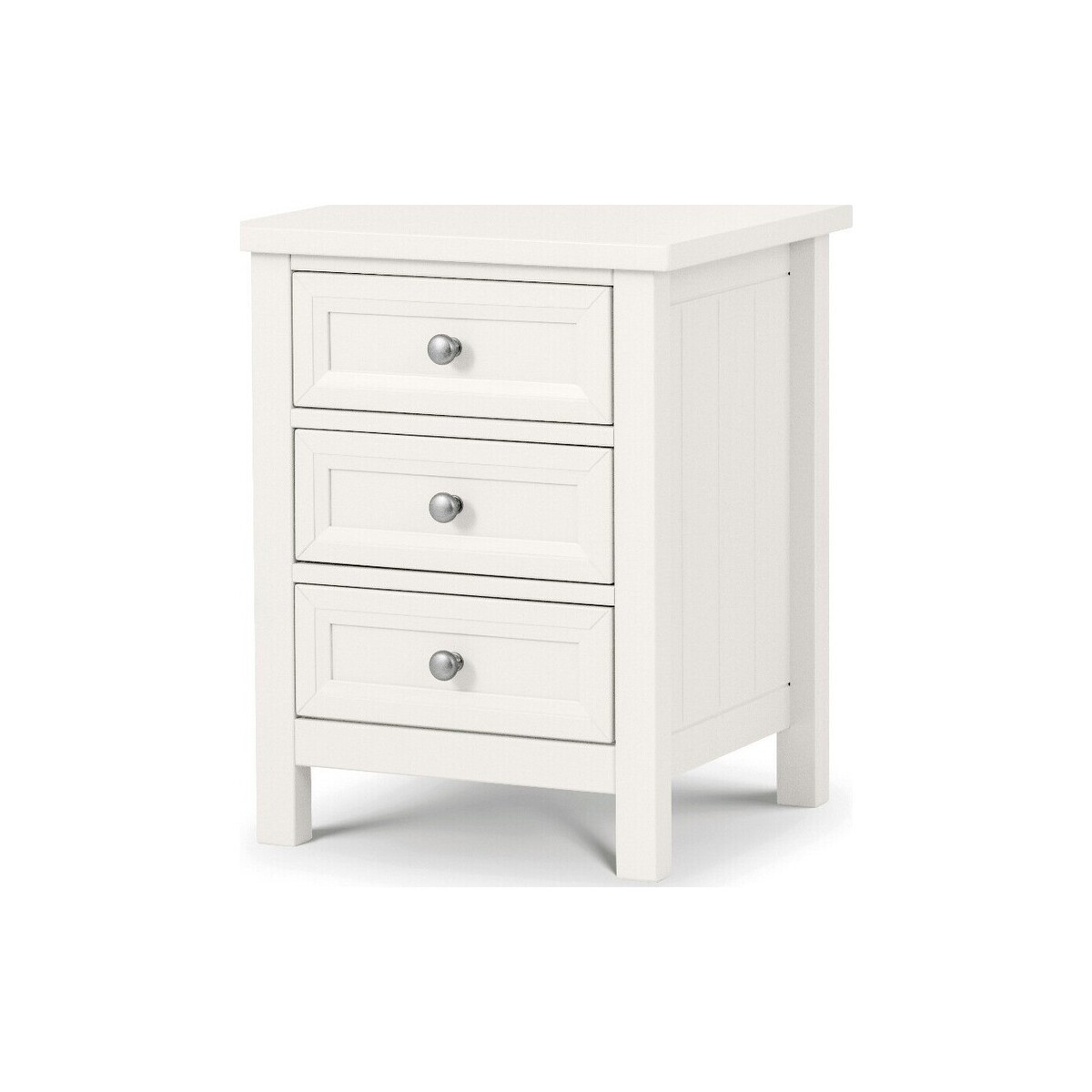 The Maine Three-Drawer Bedside Cabinet is a traditionally designed and beautifully elegant storage solution for the modern bedroom. Designed to sit alongside other pieces in the Maine Collection by Julian Bowen, each cabinet features classic side panelling and chamfering which complete the traditional look. Beautiful surf white lacquer finishes the piece in elegant style. New England style bedside cabinet MDF construction with elegant surf white lacquered finish Pewter handles add a delicate and refined touch Perfectly coordinates with the wider Maine Collection by Julian Bowen