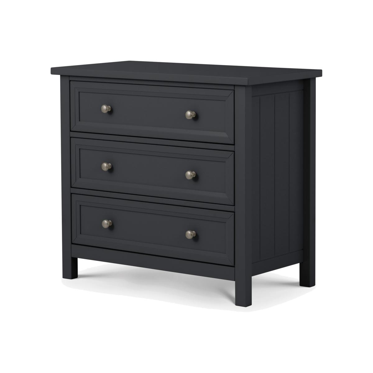 Maine is an elegant New England style range of bedroom furniture. The combination of exquisite anthracite lacquered finish with characteristic side panelling and detailed chamfered cabinetry makes for a soothing and refined aesthetic with timeless appeal, while delicate pewter handles add the perfect finishing touch. The Maine 3 drawer chest offers three large storage drawers.