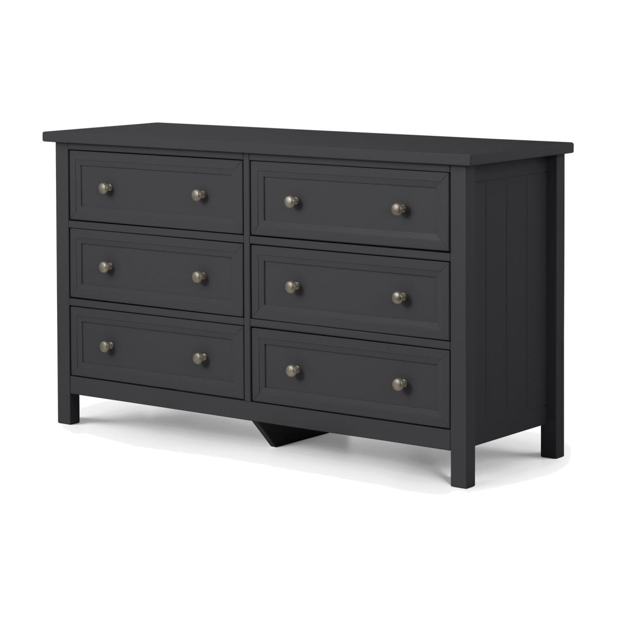 Maine is an elegant New England style range of bedroom furniture. The combination of exquisite anthracite lacquered finish with characteristic side panelling and detailed chamfered cabinetry makes for a soothing and refined aesthetic with timeless appeal, while delicate pewter handles add the perfect finishing touch. The Maine 6-drawer wide chest offers copious amounts of storage and can also be used as a dressing table