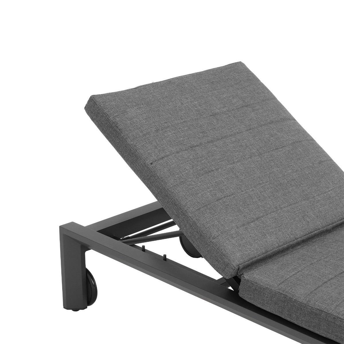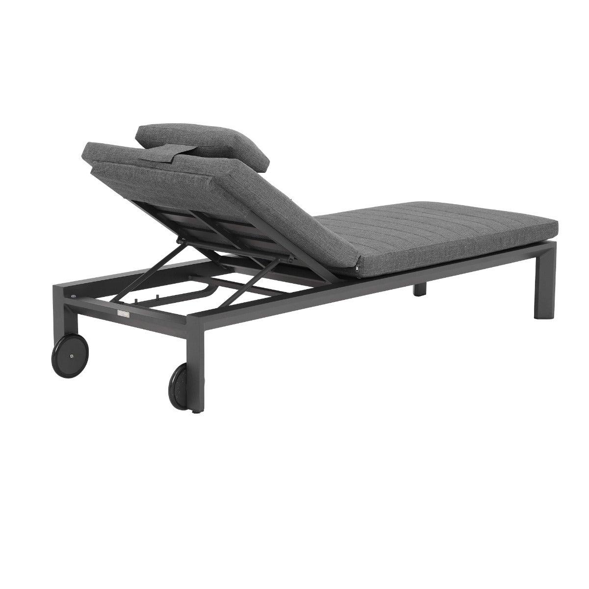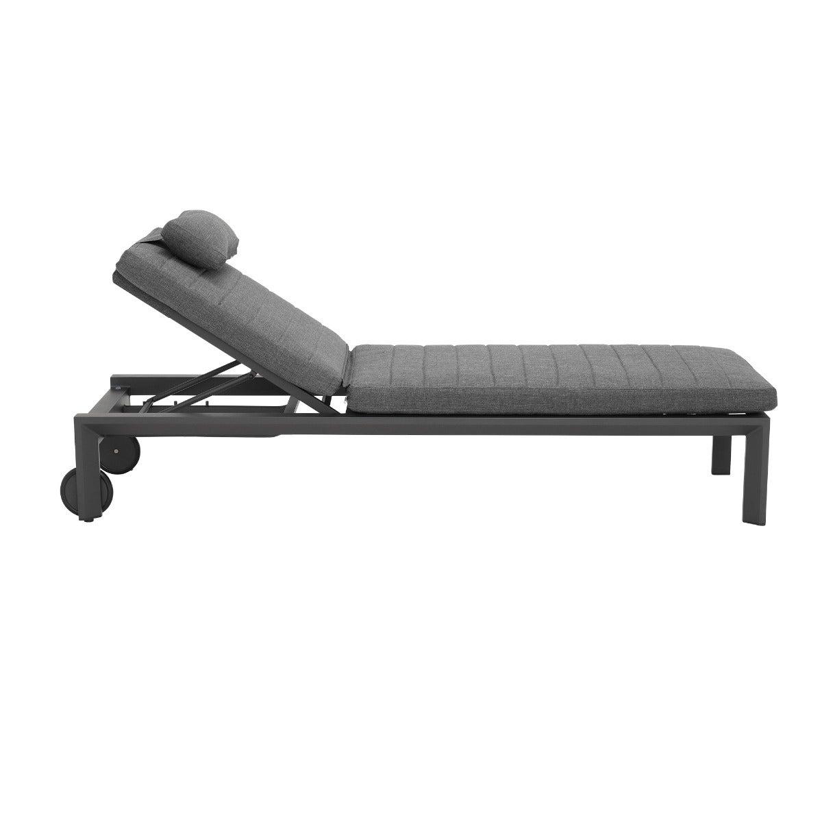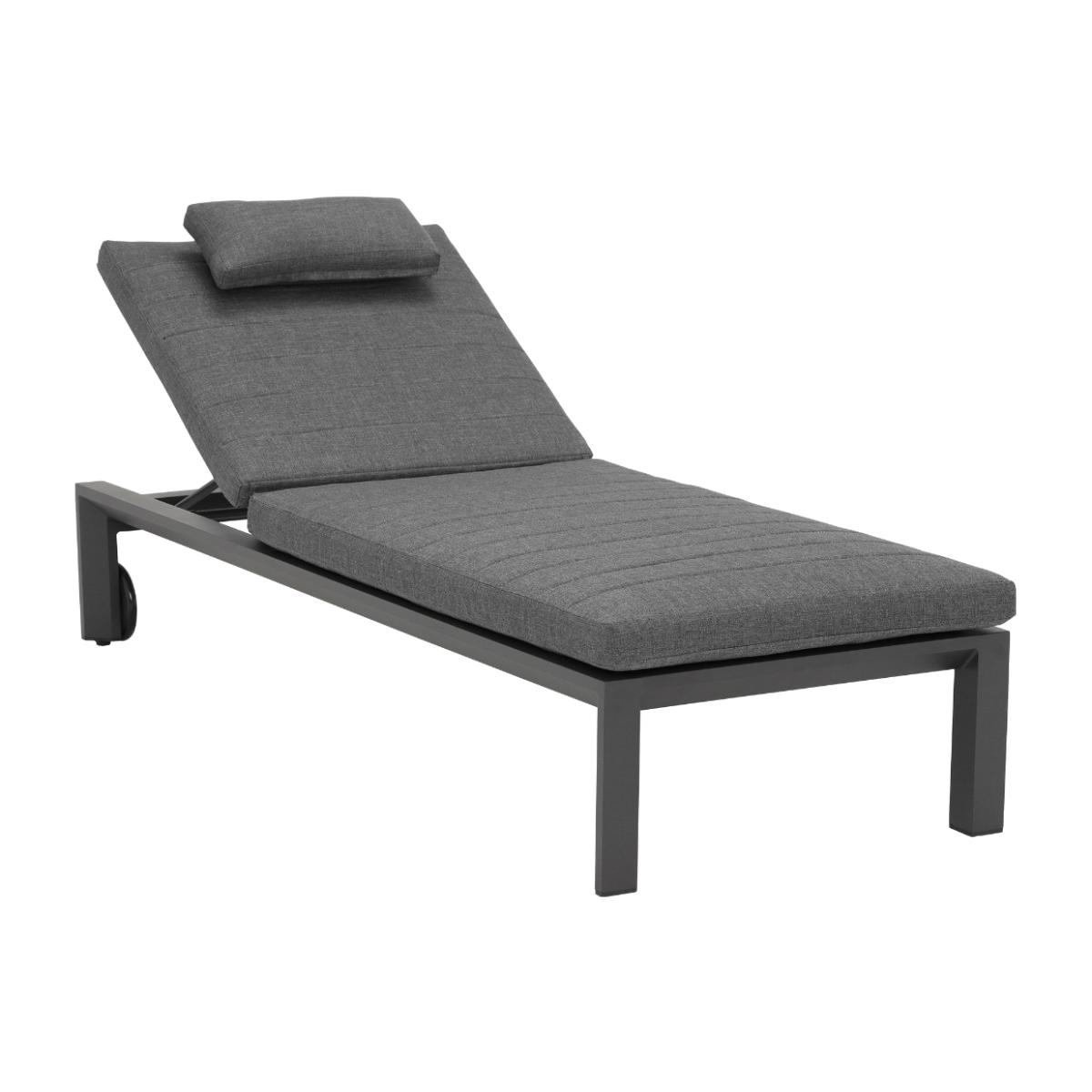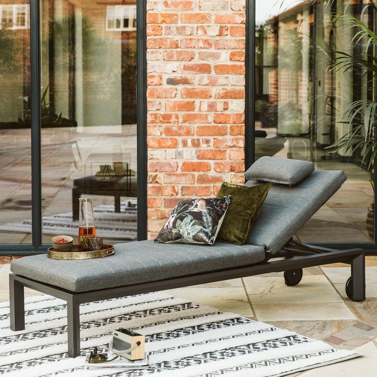Design. A sleek and stylish way to soak up those summer rays, the Maine garden sun lounger features a contemporary metal frame and cushioned top in a trendy grey tone. Wheeled legs let you reposition the sun lounger with ease, while the specially developed fabric is quick drying and highly resilient. Complete with an additional head cushion for further comfort, this is a luxurious take on outdoor furniture.