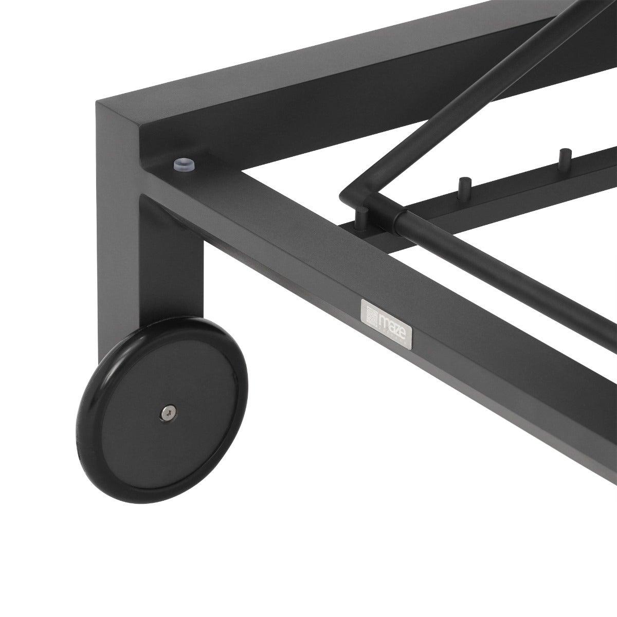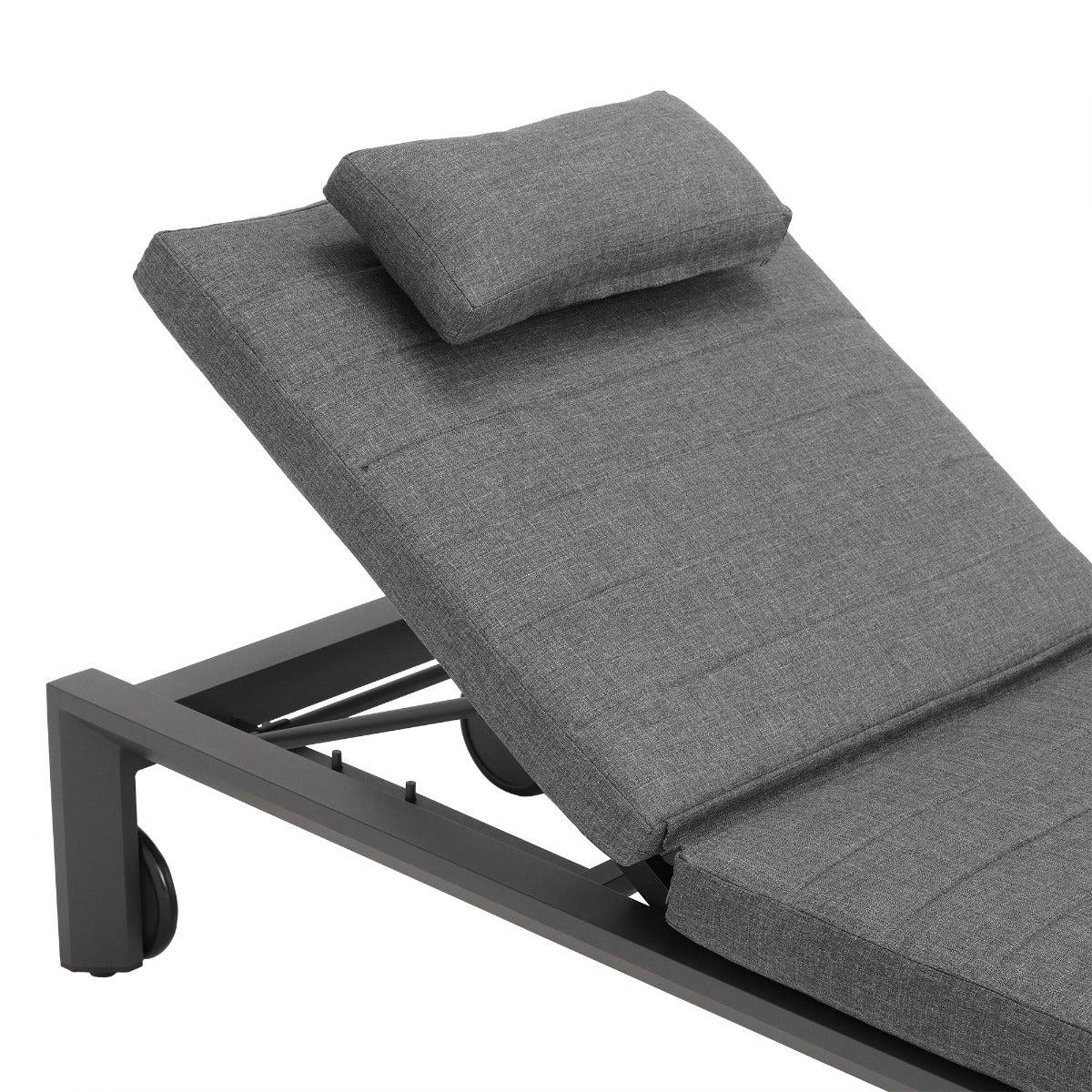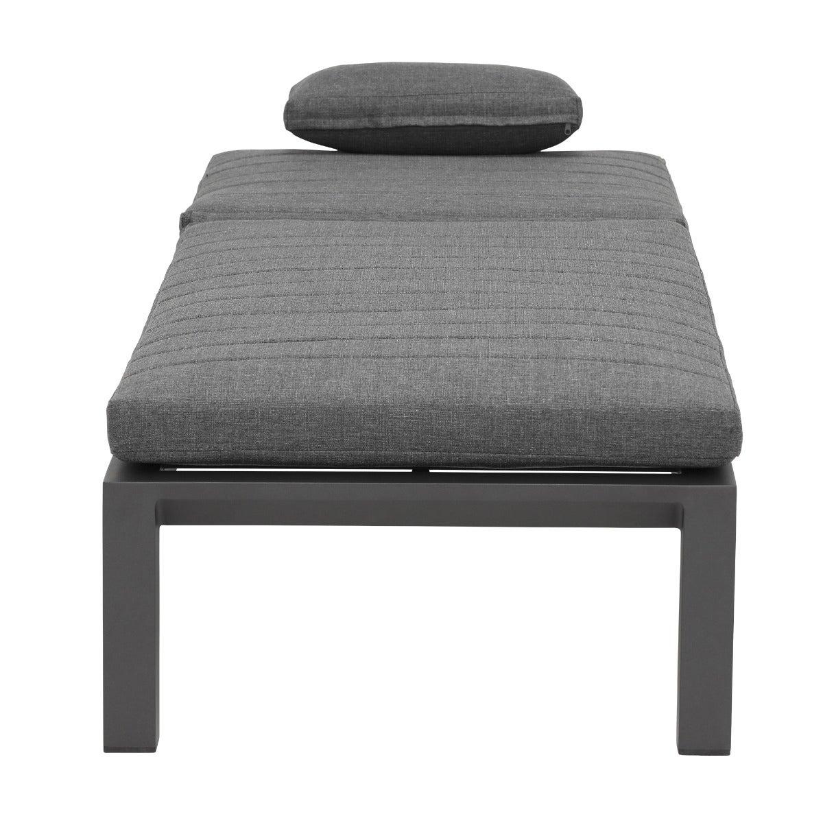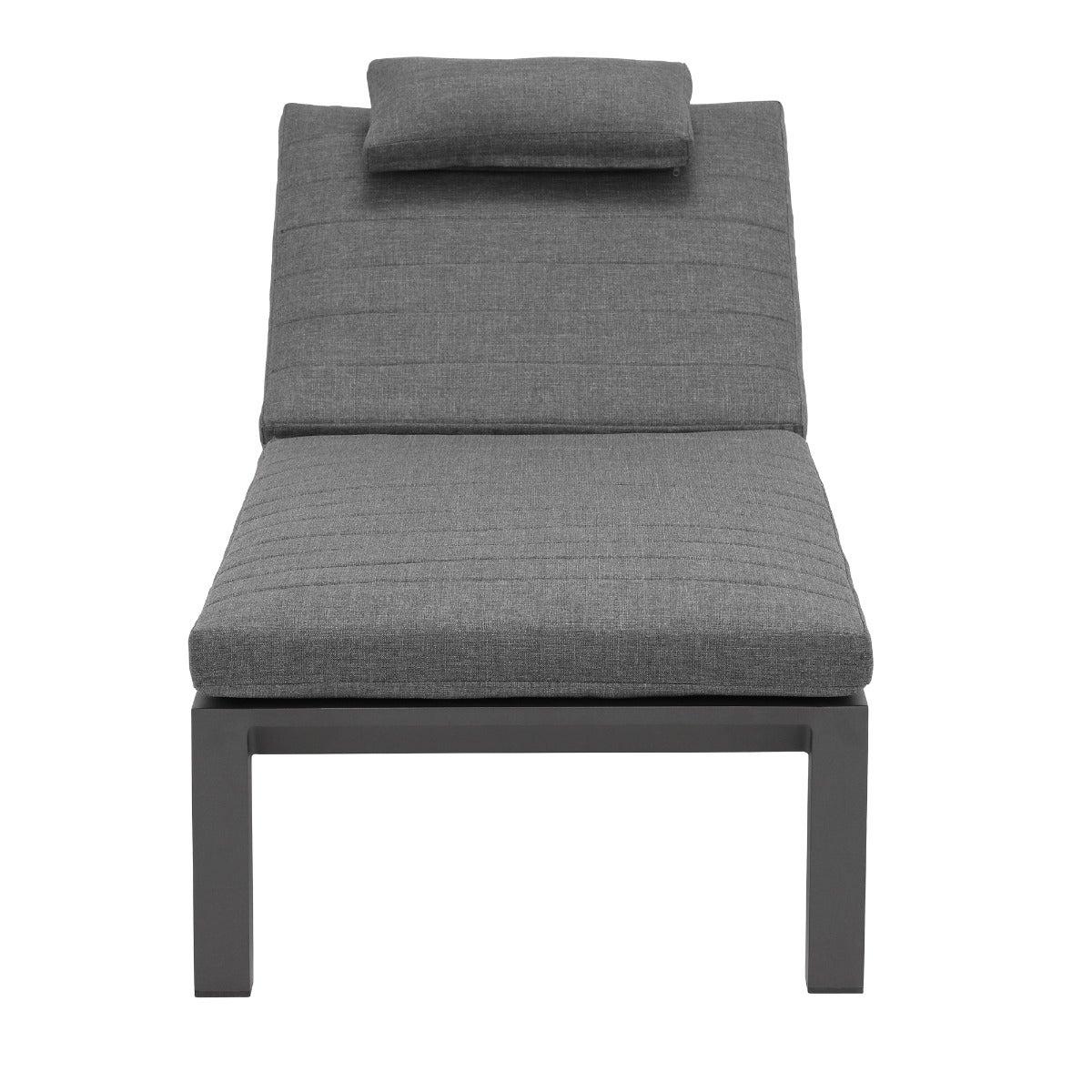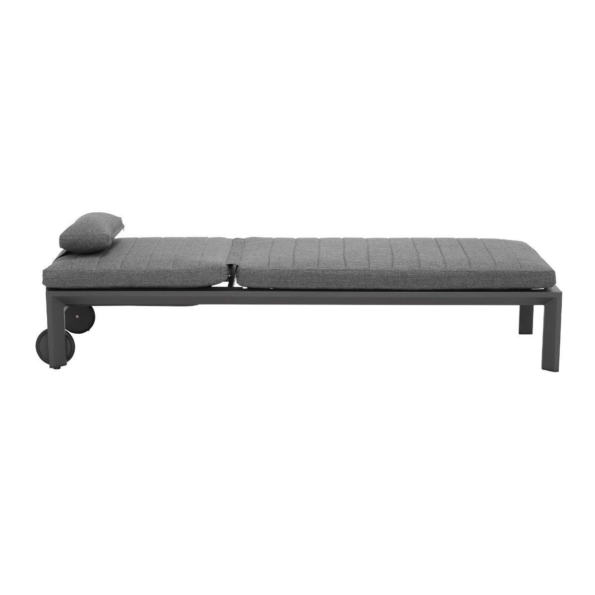 Design. A sleek and stylish way to soak up those summer rays, the Maine garden sun lounger features a contemporary metal frame and cushioned top in a trendy grey tone. Wheeled legs let you reposition the sun lounger with ease, while the specially developed fabric is quick drying and highly resilient. Complete with an additional head cushion for further comfort, this is a luxurious take on outdoor furniture.