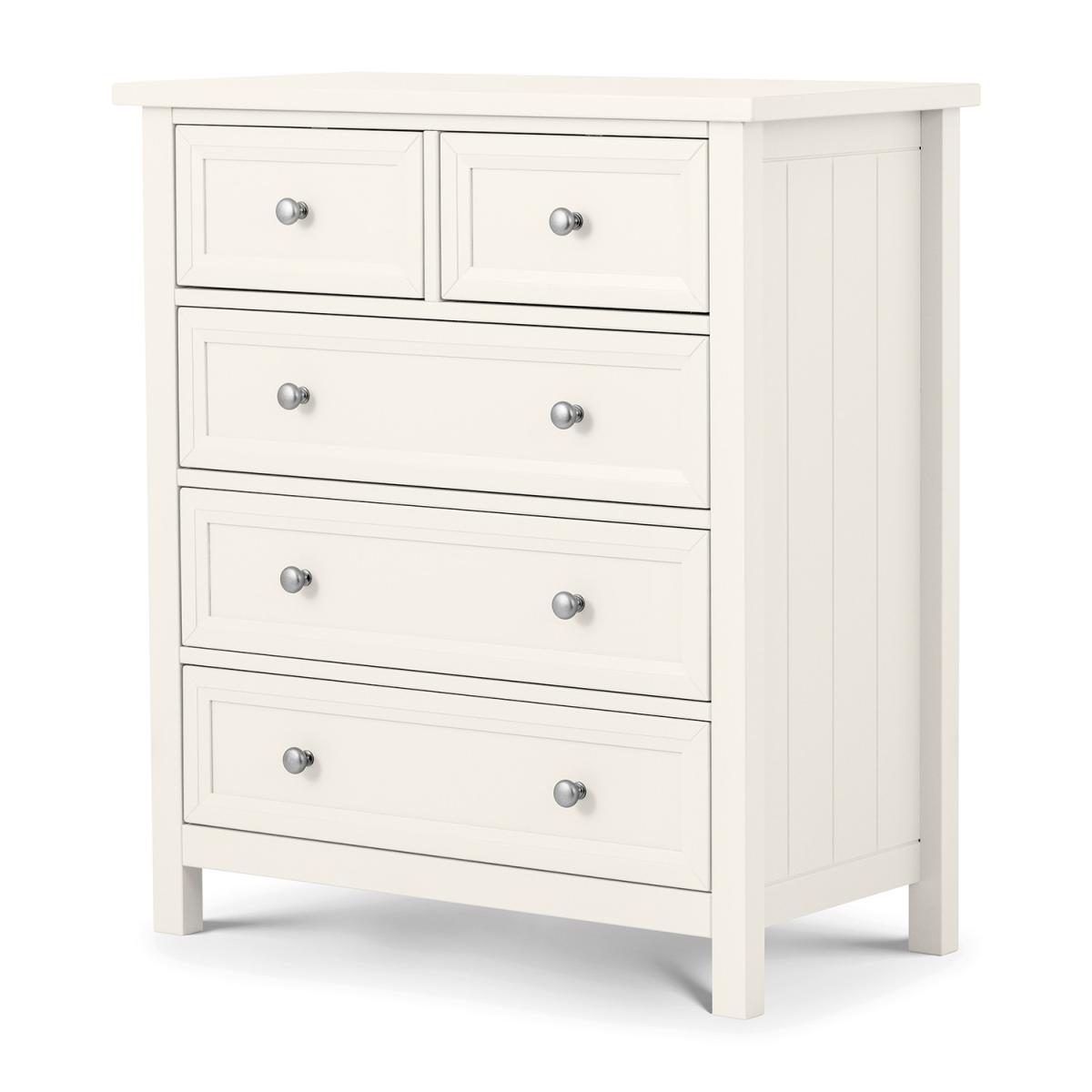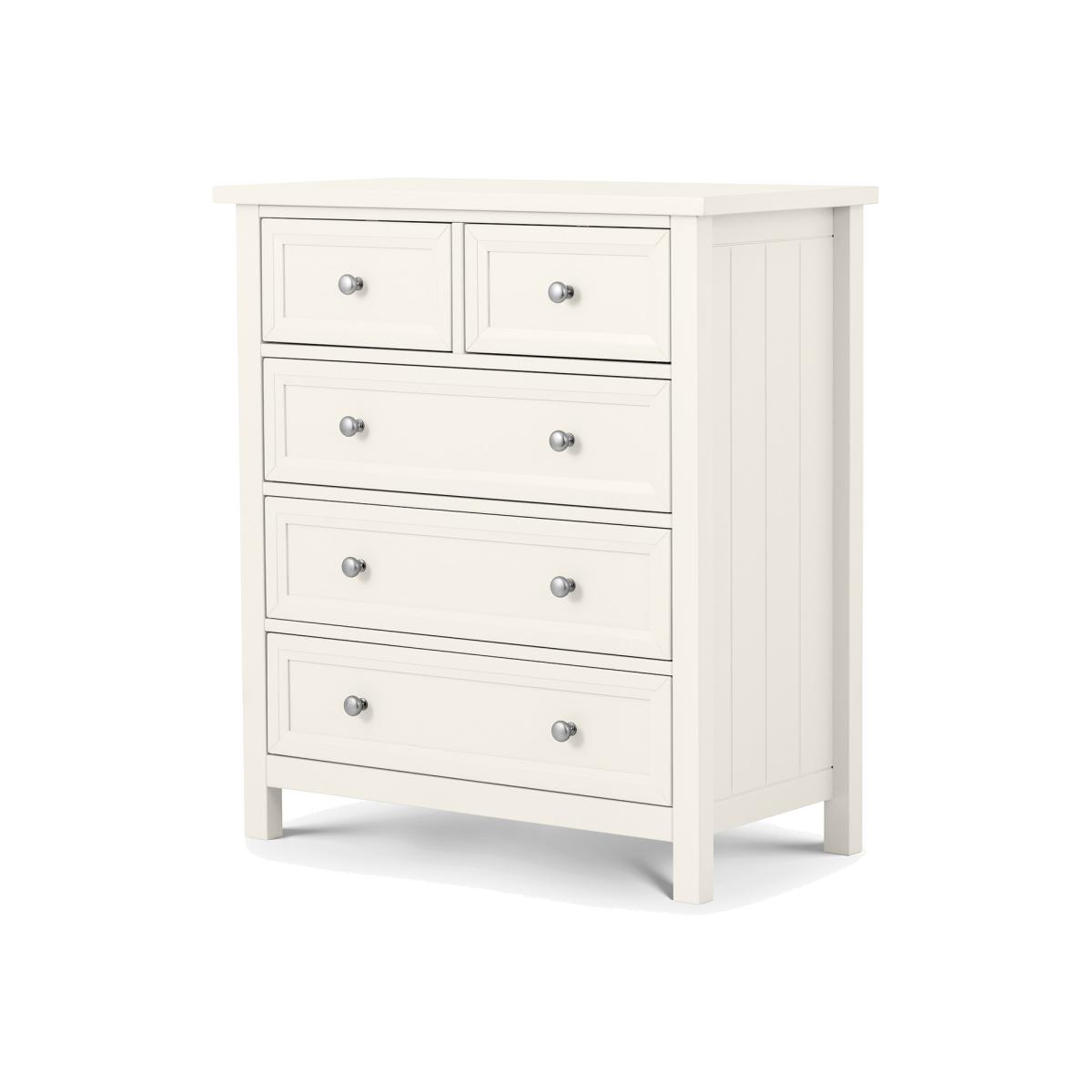 Taking classic elements from New England style, the Maine 2 Over 3 Drawer Chest is beautifully crafted with characteristic side panelling and chamfered cabinetry. Finished with a fresh white lacquer and delicate pewter handles, this chest of drawers has a refined aesthetic and a timeless appeal. Offering ample storage space with three large drawers and two smaller ones, this unit makes an elegant and practical addition to your bedroom.