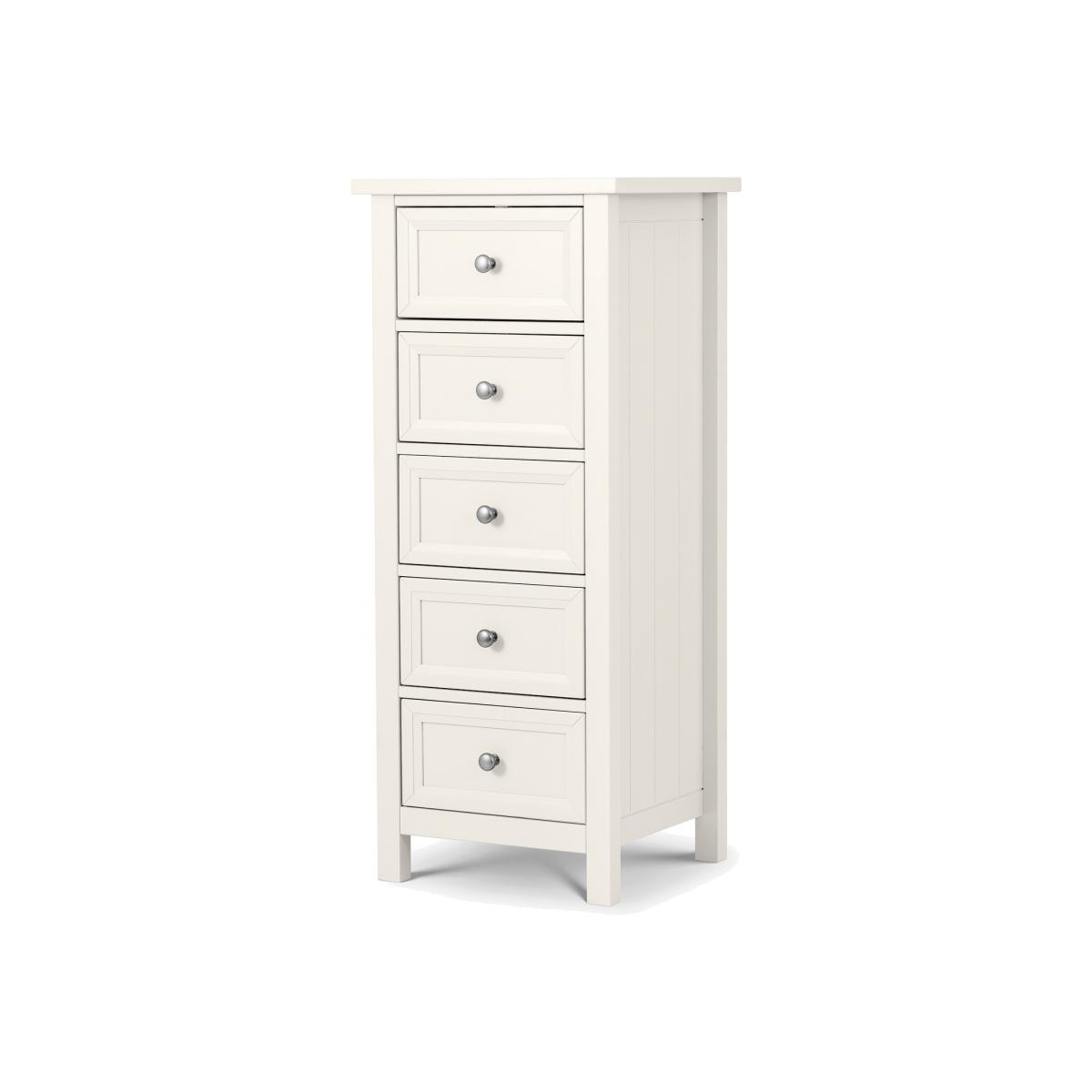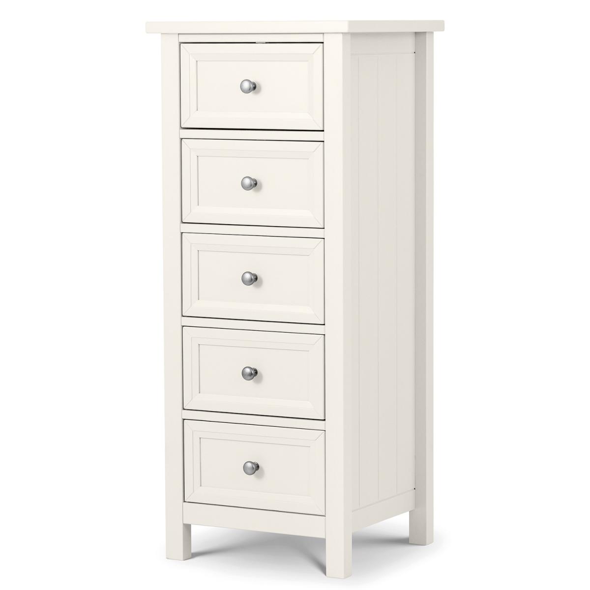 Inspired by the elegance of New England style, the Maine 5 Drawer Tall Chest is crafted with characteristic side panelling and detailed chamfered cabinetry which lend it a timeless appeal. Its compact footprint makes it a great storage solution for smaller bedrooms, while still offering ample space in its five drawers for your belongings. Combining an exquisite surf white lacquer with delicate pewter handles, this chest of drawers has a soothing and refined aesthetic that can be fully coordinated with other units from the Maine collection.