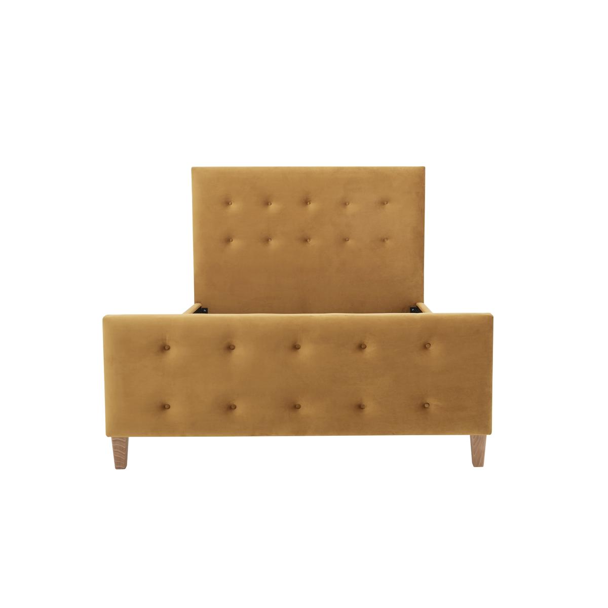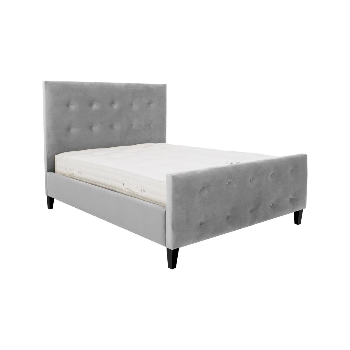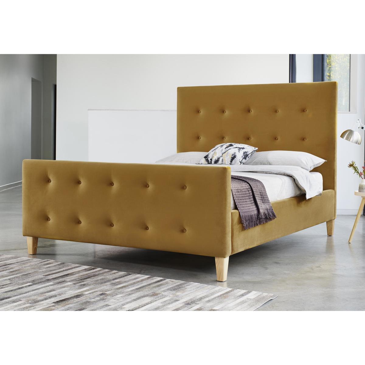 Our gorgeous Maisie bedframes combine luxurious contemporary style, distinctive details, and classic upholstery. High buttoned headboards are deeply cushioned, legs are modern and straight, and sprung beech wood slats ensure that you’re guaranteed to sleep comfortably as well as stylishly. Beautifully upholstered in soft velvet in a range of colours, Maisie is available with either a high or a low foot end. Handcrafted in Britain and only at Furniture Village. Headboard and footboard each come as one single piece. Mattress available separately. With its tall headboard and high foot end, the Maisie high foot end bedframe makes a grandly opulent addition to any bedroom. Yet from its imposing and square-edged headboard to the straight wooden legs, the details are quite contemporary. Even traditional buttoning gets a modern twist – there are just two rows of buttons, a minimal and restrained approach to embellishment. It’s also built for comfort. The soft velvet upholstery is available in a range of gorgeous contemporary colours, and sprung beech wood slats provide comfortable support to any standard mattress. Available with a light or dark wooden leg. The Maisie high foot end bedframe is handcrafted in Britain and is part of the Maisie collection of velvet bedframes. The Maisie bed frame is also available with a low foot end. Choose double, king or super king. A Furniture Village exclusive. Top Tip. To keep your fabric bedframe looking good, use a soft brush or vacuum with the curtain attachment weekly. Ideally clean professionally annually. Some fabrics can show wear on areas of more use or in direct sunlight.