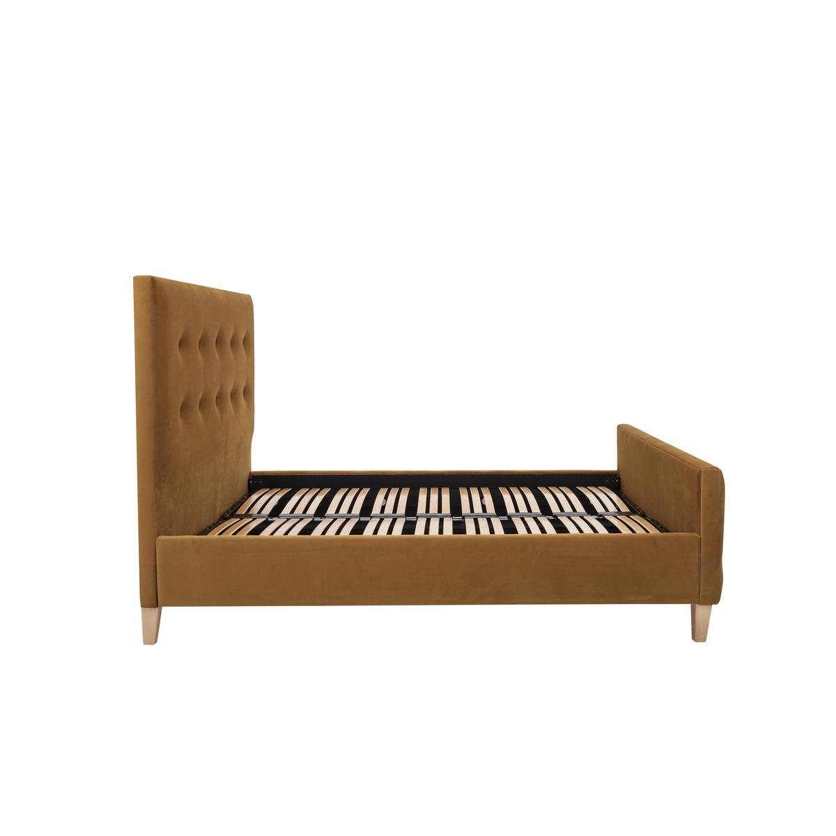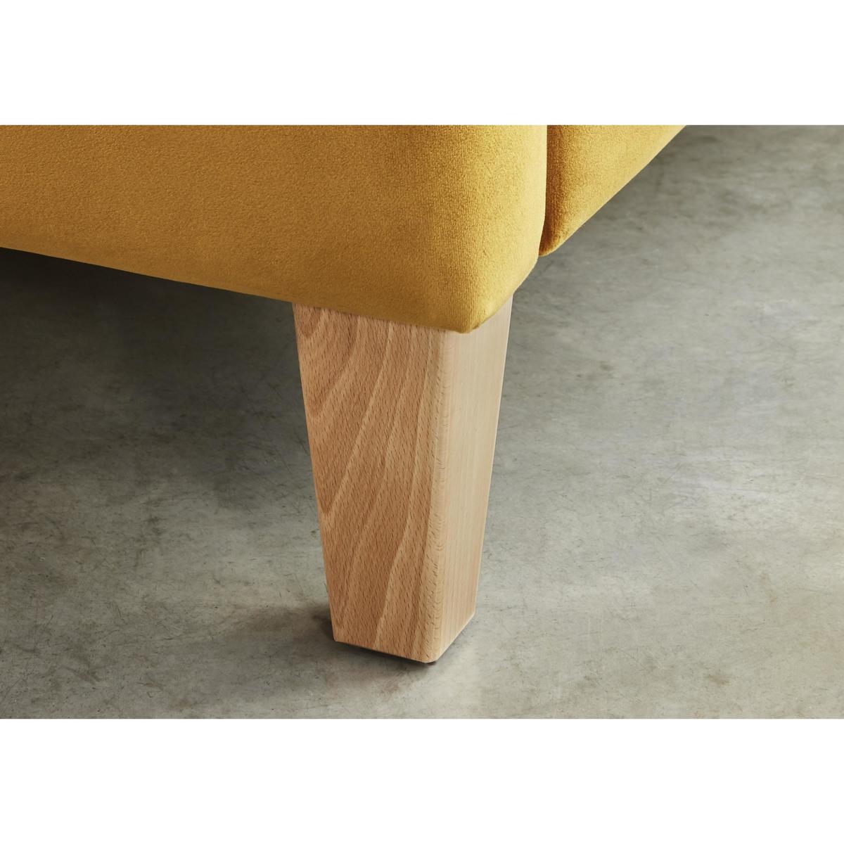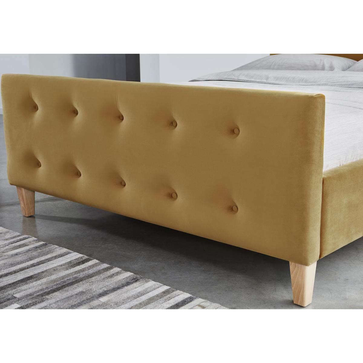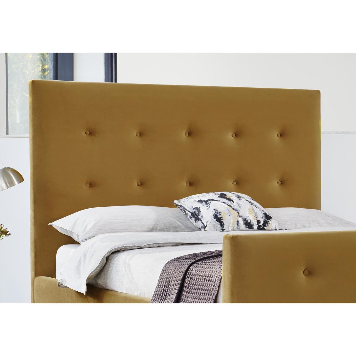 Our gorgeous Maisie bedframes combine luxurious contemporary style, distinctive details, and classic upholstery. High buttoned headboards are deeply cushioned, legs are modern and straight, and sprung beech wood slats ensure that you’re guaranteed to sleep comfortably as well as stylishly. Beautifully upholstered in soft velvet in a range of colours, Maisie is available with either a high or a low foot end. Handcrafted in Britain and only at Furniture Village. Headboard and footboard each come as one single piece. Mattress available separately. With its tall headboard and high foot end, the Maisie high foot end bedframe makes a grandly opulent addition to any bedroom. Yet from its imposing and square-edged headboard to the straight wooden legs, the details are quite contemporary. Even traditional buttoning gets a modern twist – there are just two rows of buttons, a minimal and restrained approach to embellishment. It’s also built for comfort. The soft velvet upholstery is available in a range of gorgeous contemporary colours, and sprung beech wood slats provide comfortable support to any standard mattress. Available with a light or dark wooden leg. The Maisie high foot end bedframe is handcrafted in Britain and is part of the Maisie collection of velvet bedframes. The Maisie bed frame is also available with a low foot end. Choose double, king or super king. A Furniture Village exclusive. Top Tip. To keep your fabric bedframe looking good, use a soft brush or vacuum with the curtain attachment weekly. Ideally clean professionally annually. Some fabrics can show wear on areas of more use or in direct sunlight.