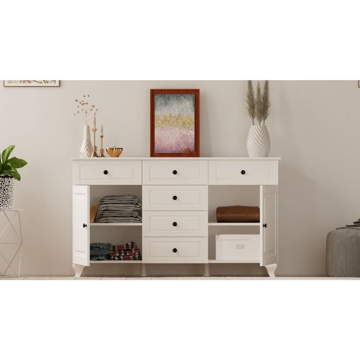 MASION represents the unique blend of modern furniture with the country furniture. With tapered legs, gunmetal black handles and a soft matte white finish this panelled design is characterful. Featuring 2 doors and 6 drawers of ample storage it can be a great addition to any living room, bathroom or bedroom. Colour: White. Material:Membrane coated MDF board, finished with CNC process. Metal handles. Dimensions: Width:130cm,Height:87cm,Depth:43cm. Delivered flat packed in :2x Boxes. Total Gross Weight:58.7kg. MPORTANT INFORMATION:Due to the size and the weight of this item, it is shipped out flat packed with 2MA N White Glove Guaranteeed Next Day Delivery Service to your room of choice with PANTHER logistics. After placing your order you can book your delivery by following the email instructions from PANTHER Logistics, once the item is dispatched from our warehouse , cancelation or change of delivery date is subject to GBP50 charge. Please note that items can not be left in a safe place or with a neighbour. If you are not happy with this service please let us know before item is dispatched and we will send your item with 7-10 days normal 2man delivery service instead of next day service.