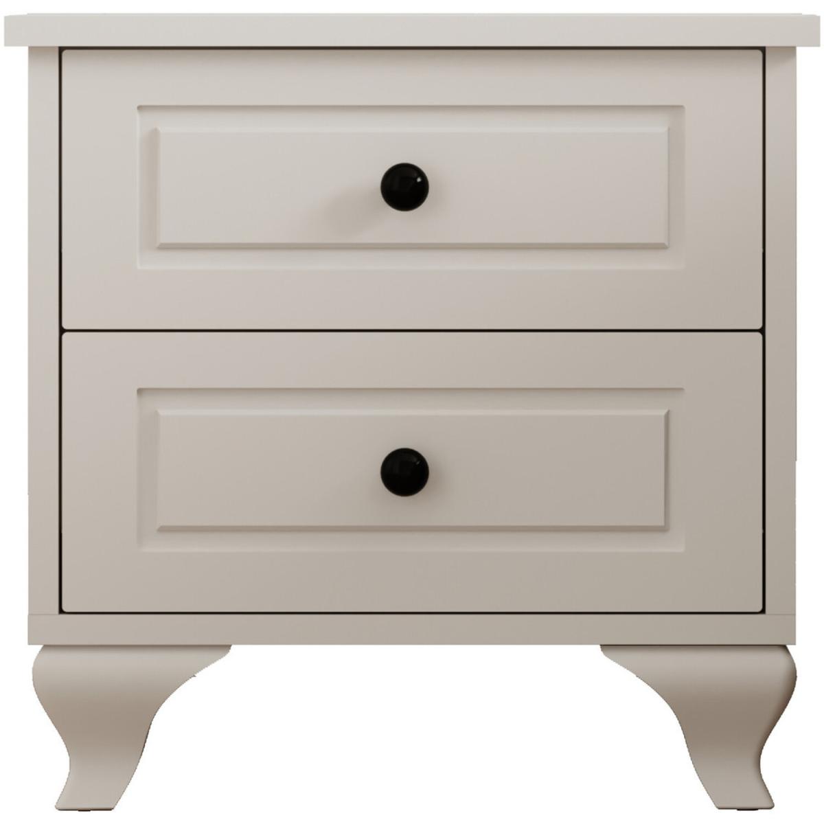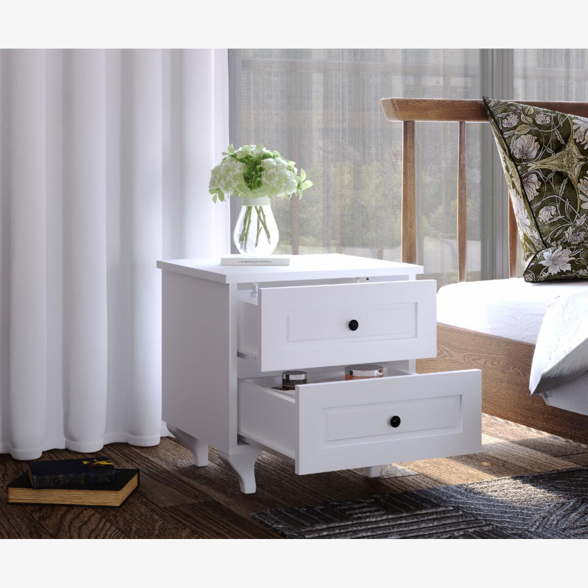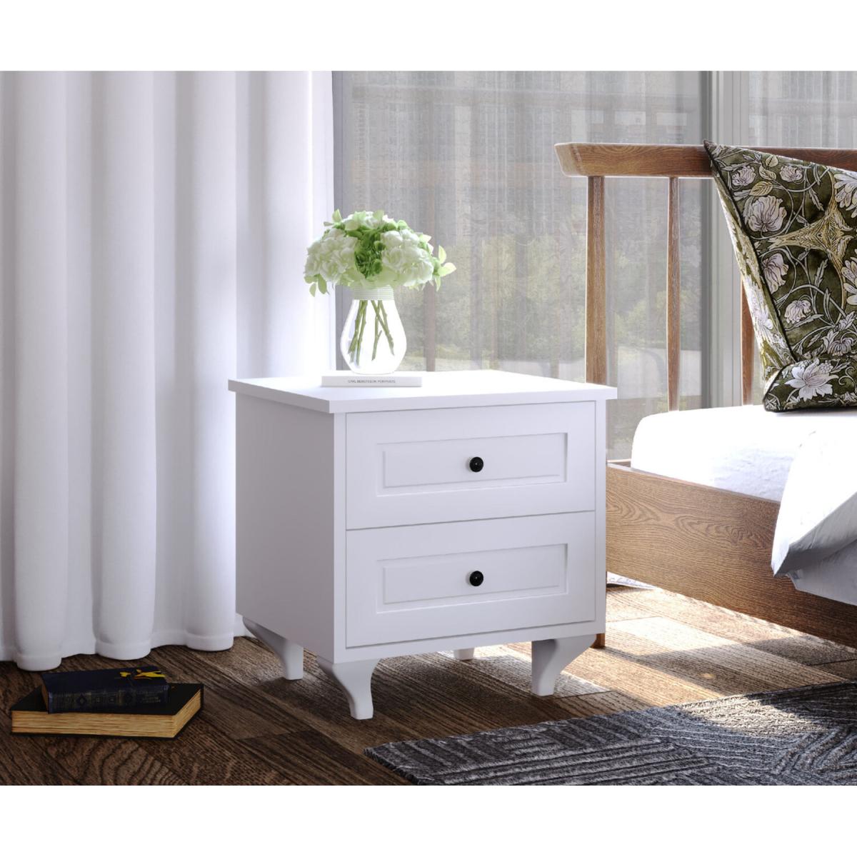 MAISON 2 Drawer Bedside Table, White Elegant yet modern MAISON bedside table is a practical storage solution for your bedroom. Featuring two deep drawers it has tapered feet and finished with gunmetal black handles. Colour White Material Membrane coated MDF board, finished with CNC process. Dimensions Width45cm,Height45cm,Depth40cm.Delivered flat packed in 1x Box..Total Gross Weight12.3kg.