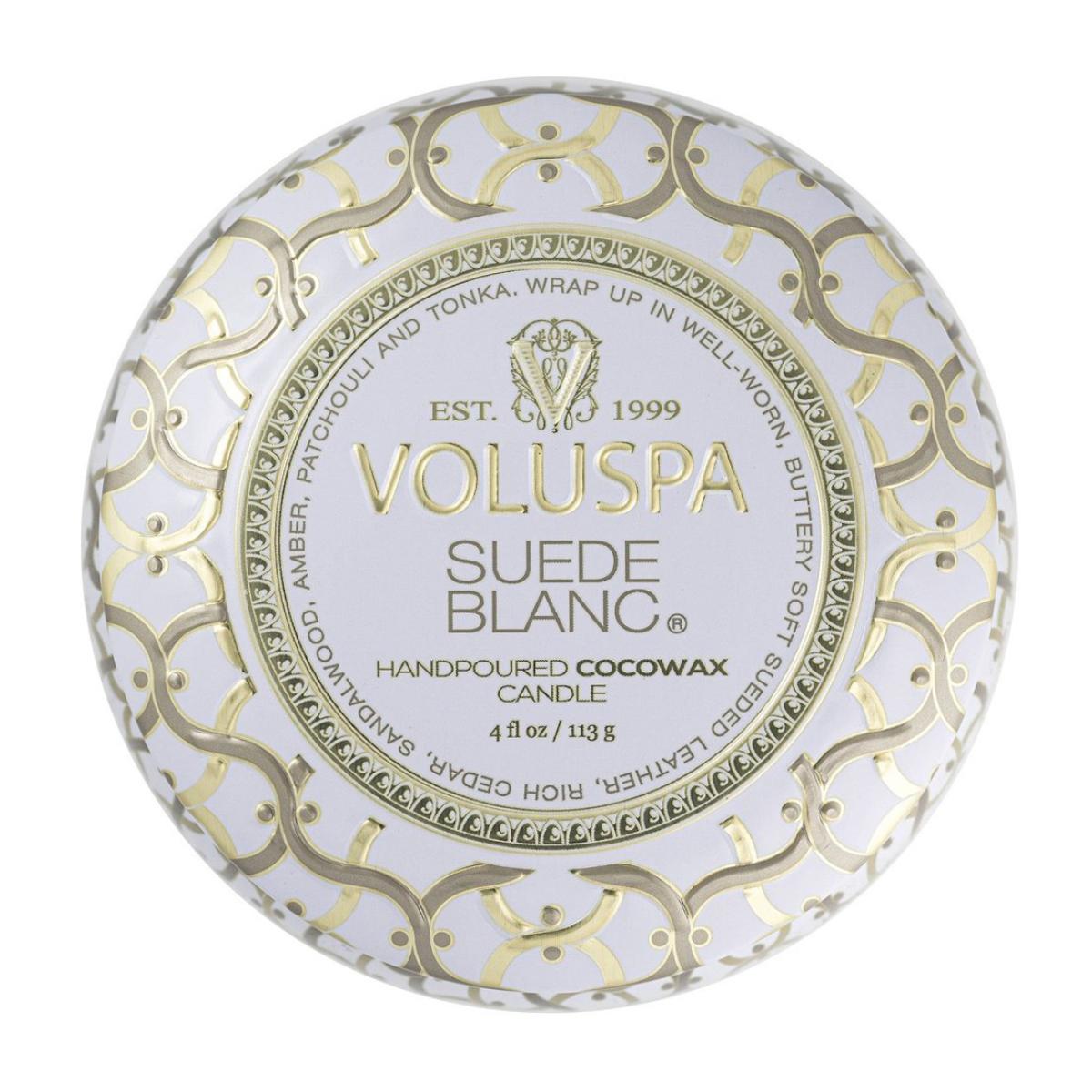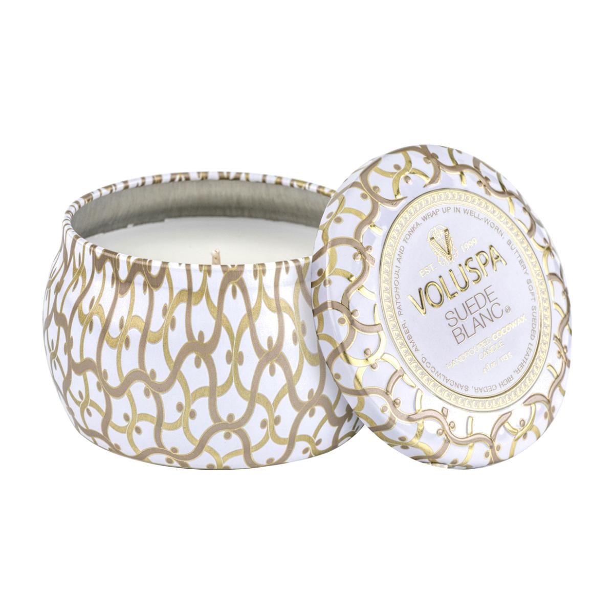 Voluspa Maison Blanc Mini Tin scented 25 hours Suede Blanc