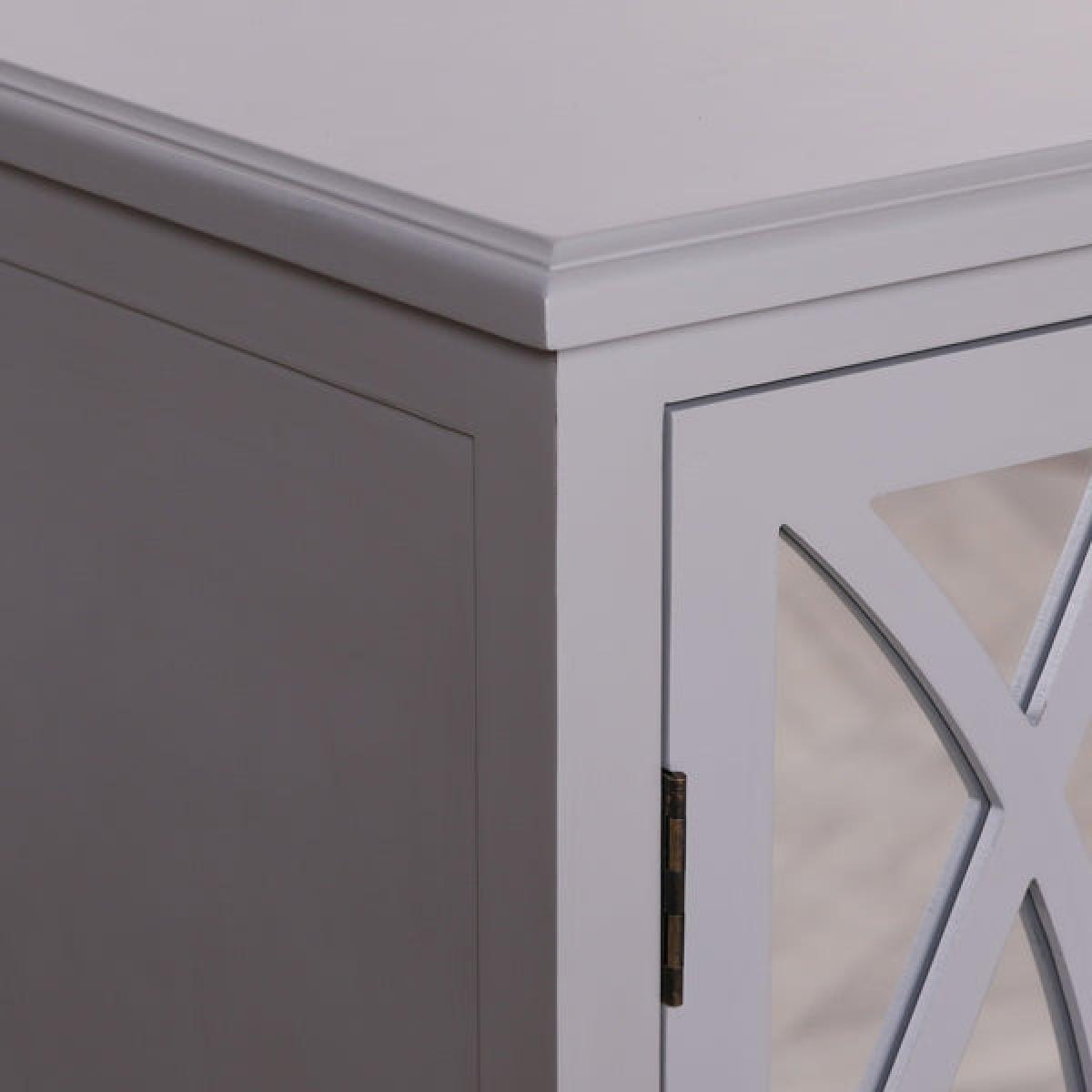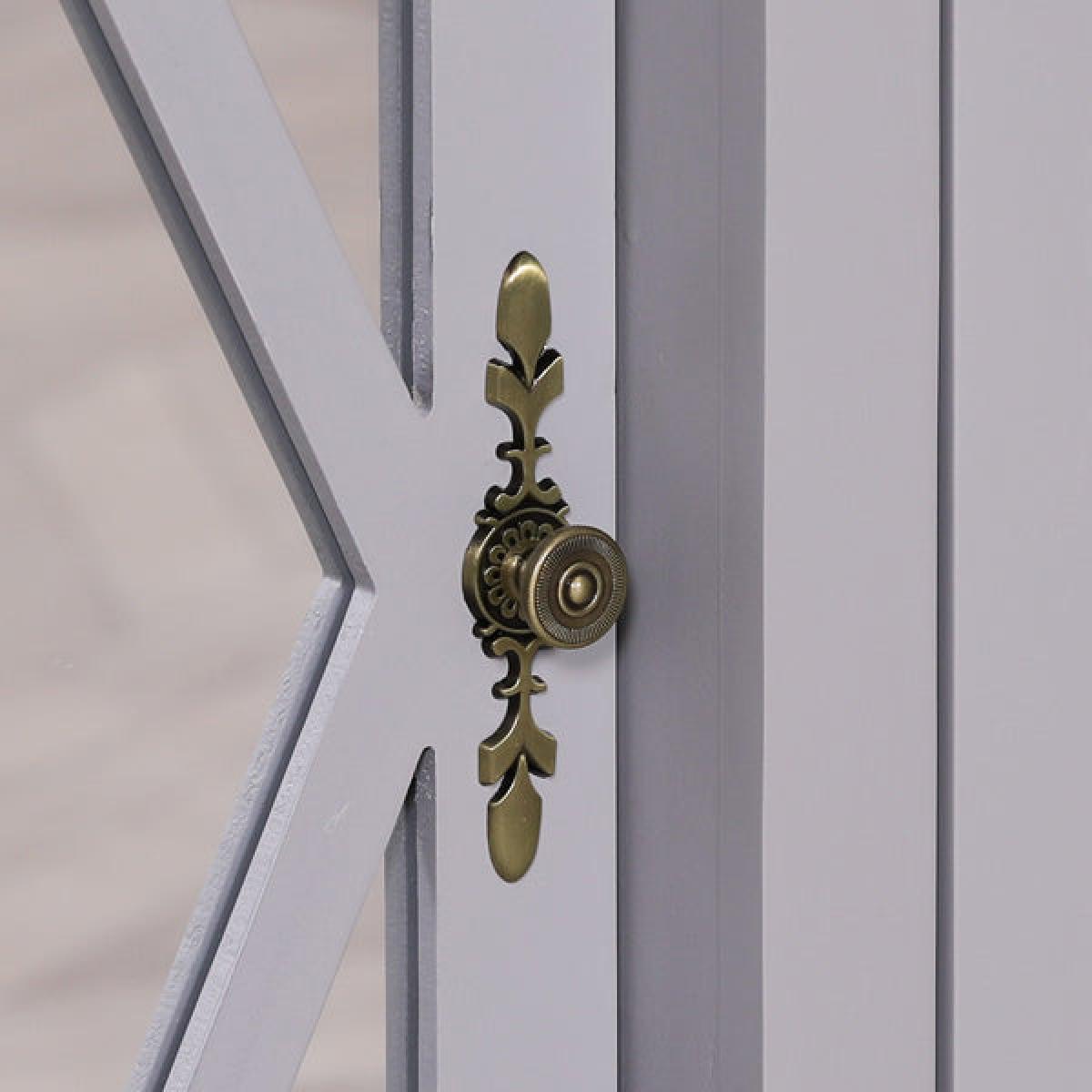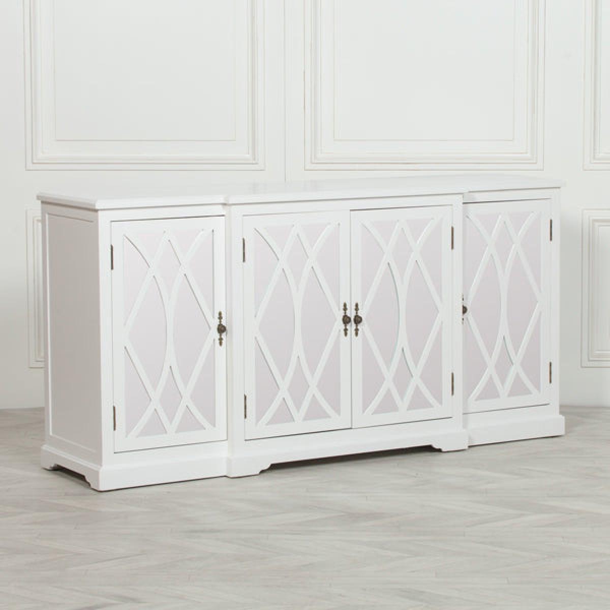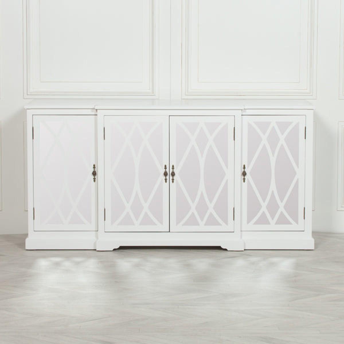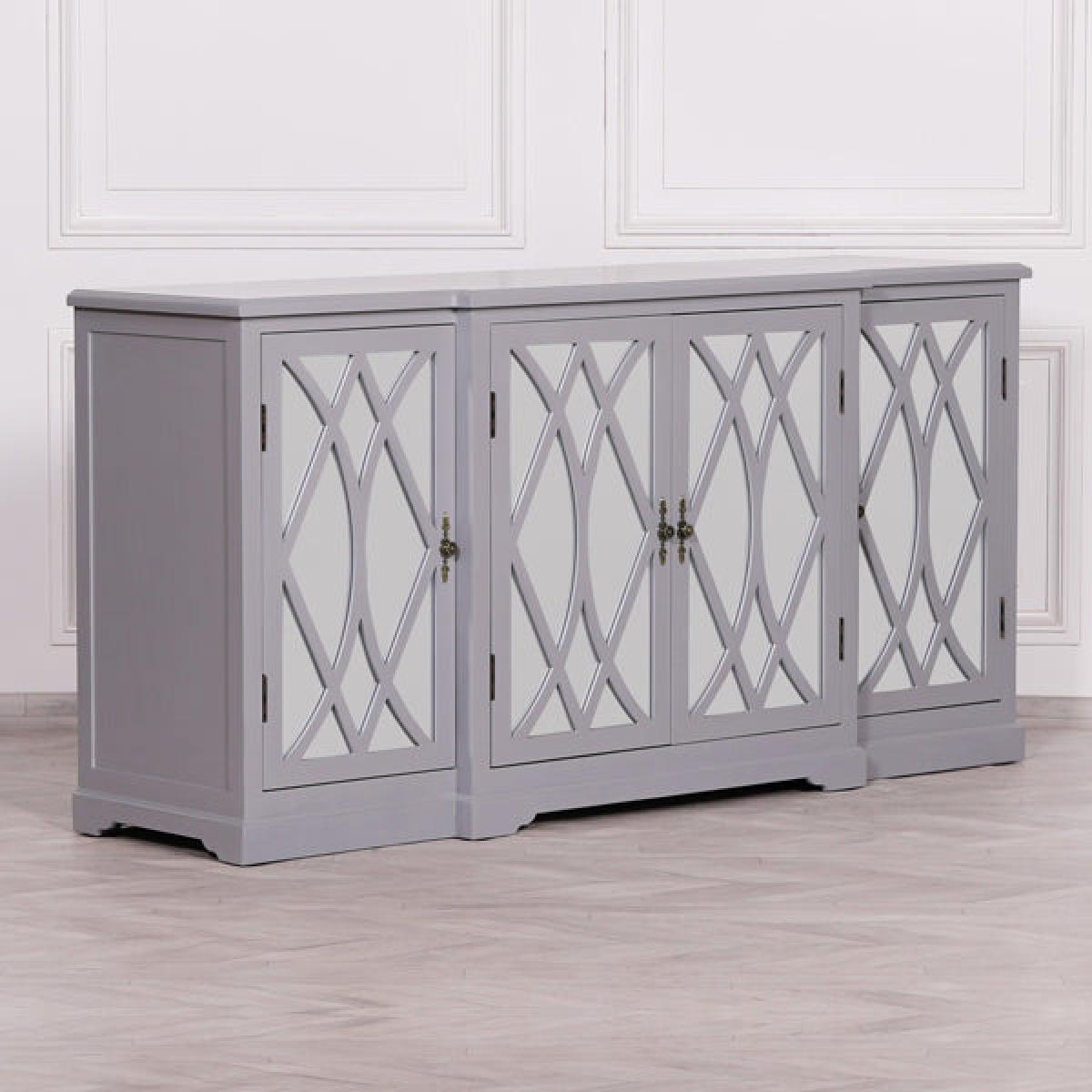 The beautiful Maison Reproductions Breakfont mirror front sideboard offers a chic and stylish upgrade to your old, dated sideboard. Finished in silver/grey, which will effortlessly match any interior décor in your home, the iconic pattern of the sideboard provides an interesting break for your eyes, swirling over the mirrored surface with elegant curves and stylish angles. The four generously-sized cupboards each feature a solid shelf, with the ornate dark-gold handles adding a sense of timeless style to this functional unit. The doors swing easily open on gold hinges, with its large size making this sideboard a perfect addition to any home.