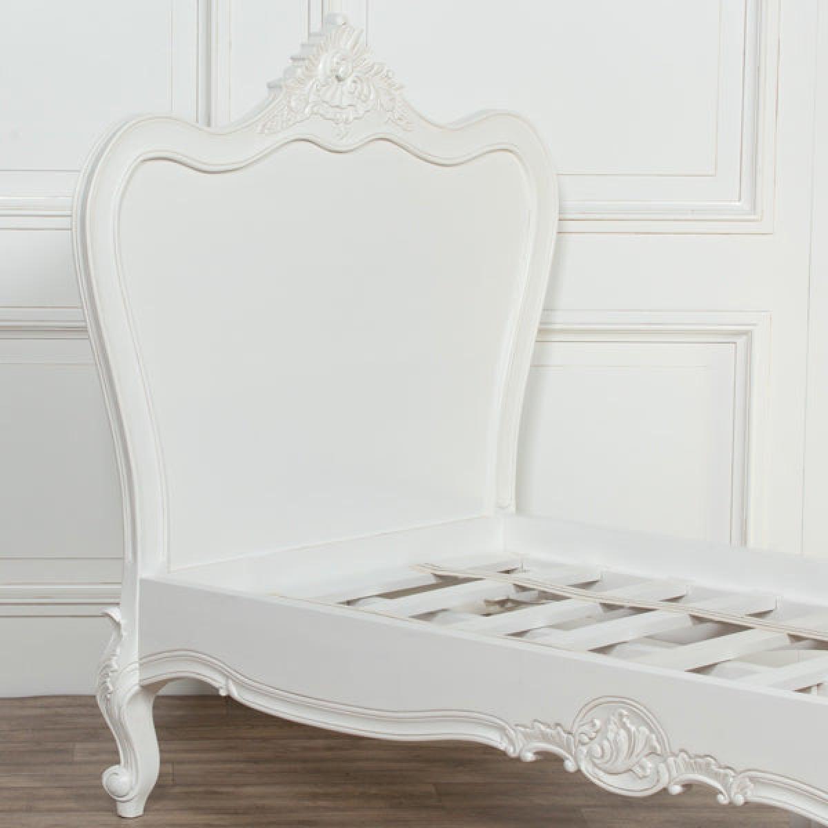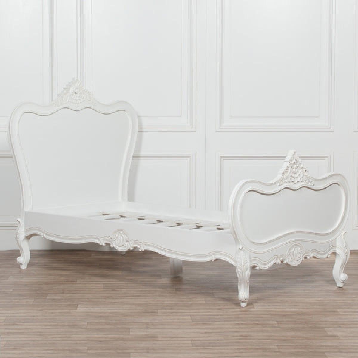The Maison Reproductions French Chateau painted bed is exquisitely ornate. Made entirely of magnificent mahogany, this beautiful bed is painted ivory white to complete its chic provincial aesthetic. Available in single (121cm wide, 205cm diameter, 128cm high), double (160cm wide, 202cm diameter, 146cm high) and king-size (160cm wide, 210cm diameter, 146cm high) and festooned with intricate detail, such as a sublime leaf motif along the base, this bed delivers a rustic aesthetic that decorating dreams are made of. A wonderful, evocative addition to your home, guest or child’s bedroom, this painted bed is perfect for displaying splashes of modern colour or sumptuous French fabrics. H:146 x W:160 x D:202 cm. H:128 x W:121 x D:205 cm.