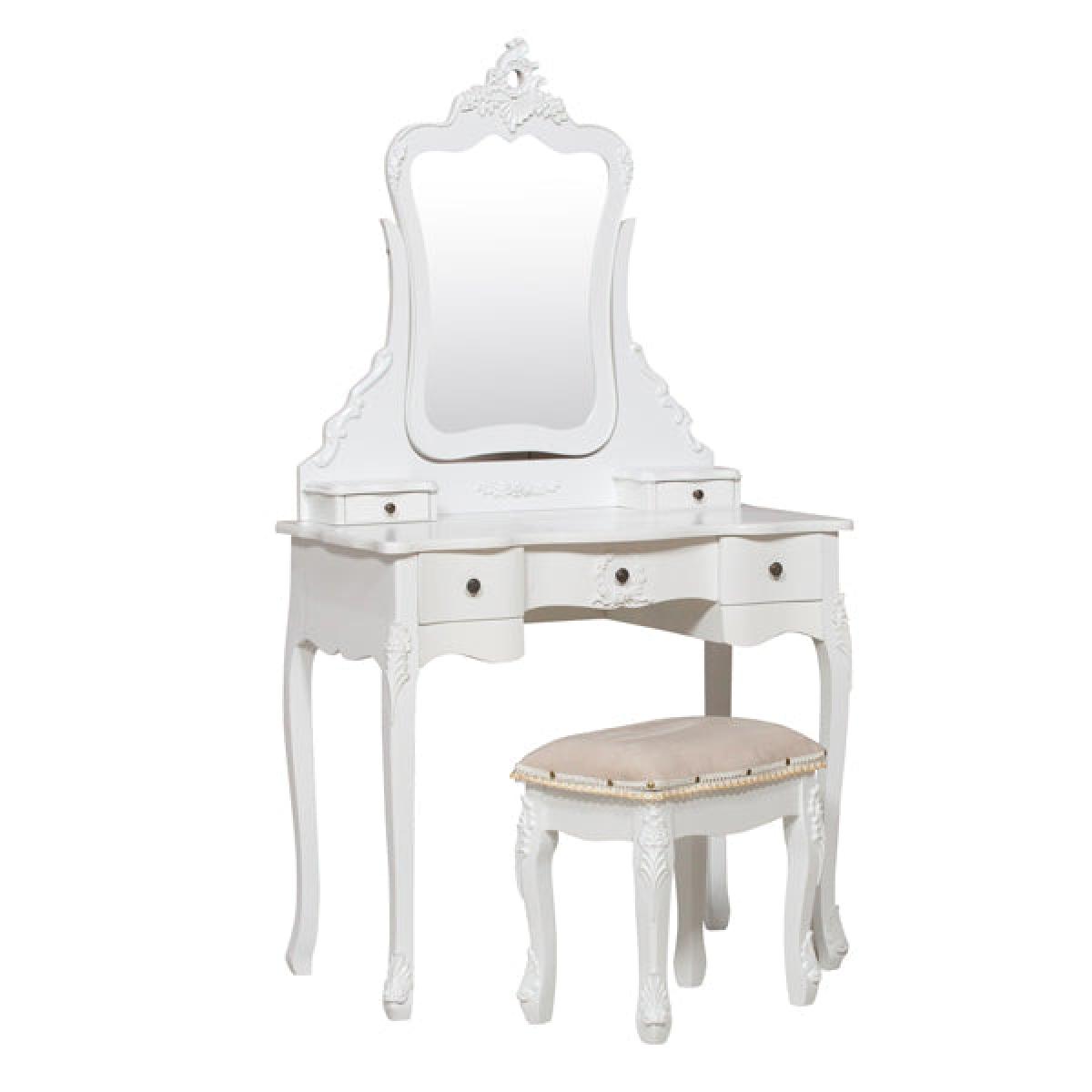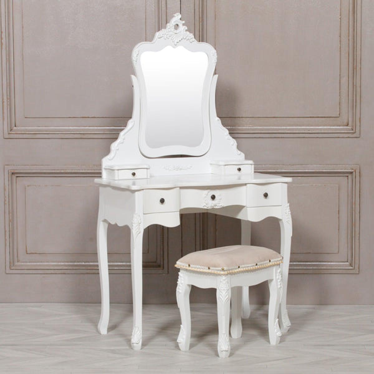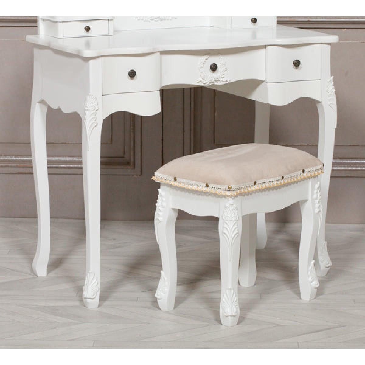 A fabulous feature piece for any boudoir, this eye-catching Maison Reproductions French dressing table with its large Louis XVI-style mirror and matching stool is a must-have for your bedroom. The beautifully curved legs taper down to classically styled feet, with both adorned with floral scrollwork that is replicated on the luxuriously padded stool. The detailing on the shoulders and top of the mirror is exquisite, with further scrollwork showcasing the curved drawers and delicate antiqued handles. Available in white, cream, silver or gold, choose the colour that most closely ties with your aesthetic and watch this piece shine in your home.