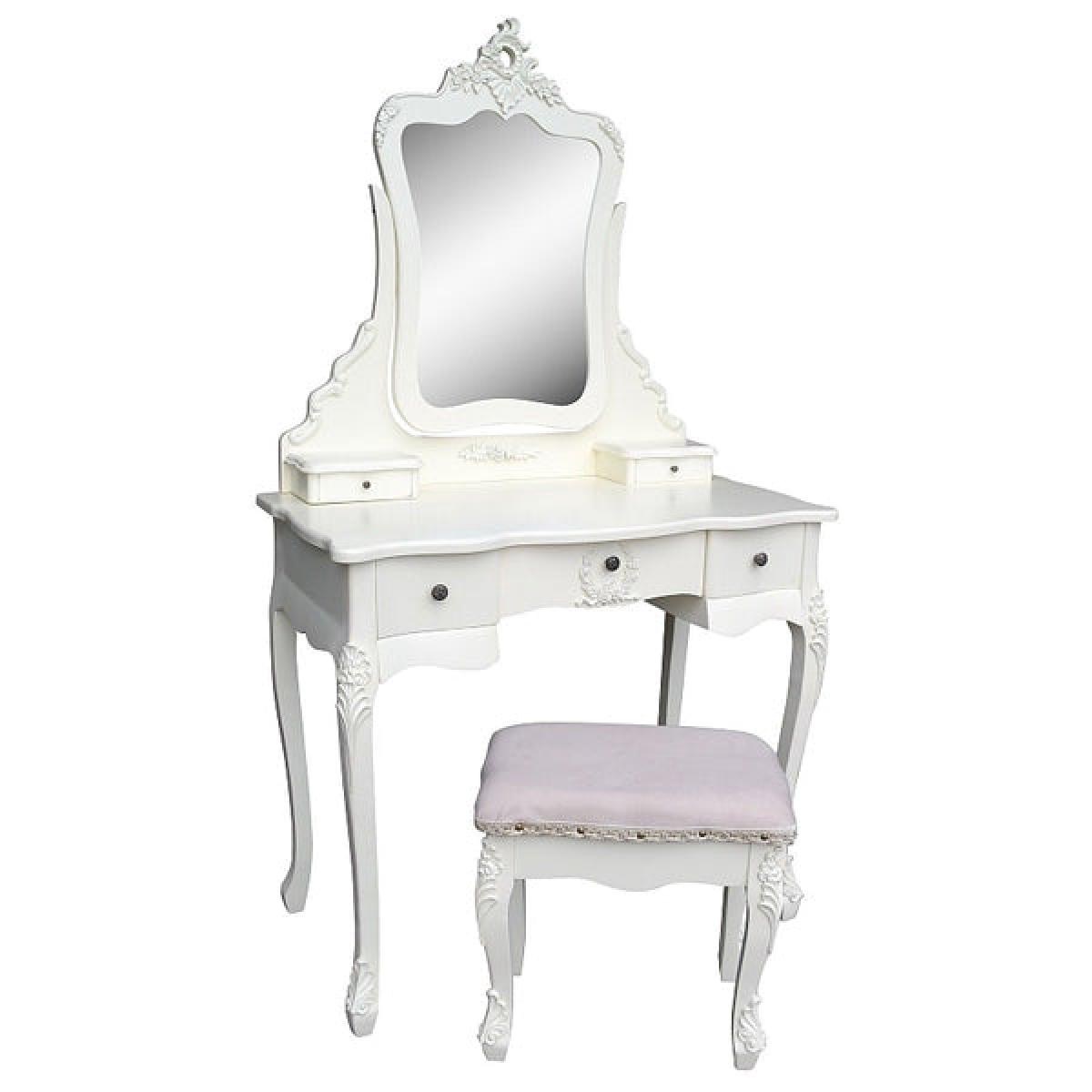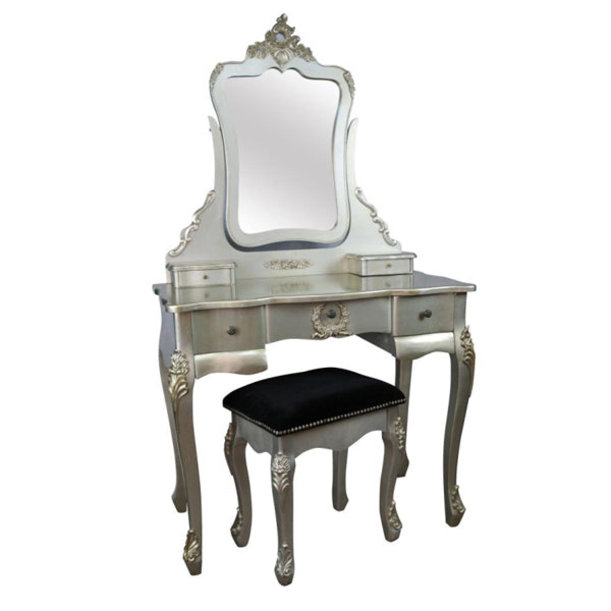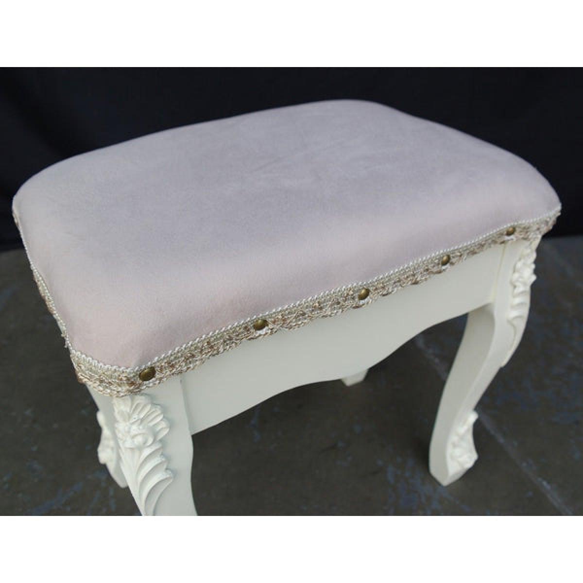 A fabulous feature piece for any boudoir, this eye-catching Maison Reproductions French dressing table with its large Louis XVI-style mirror and matching stool is a must-have for your bedroom. The beautifully curved legs taper down to classically styled feet, with both adorned with floral scrollwork that is replicated on the luxuriously padded stool. The detailing on the shoulders and top of the mirror is exquisite, with further scrollwork showcasing the curved drawers and delicate antiqued handles. Available in white, cream, silver or gold, choose the colour that most closely ties with your aesthetic and watch this piece shine in your home.
