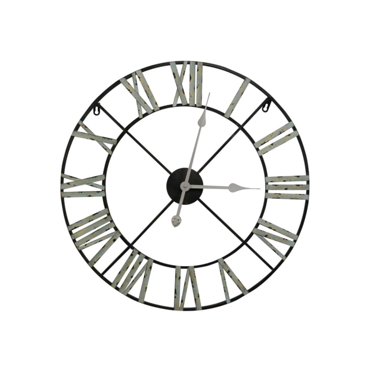 This Maison Reproductions medium vintage metal wall clock offers a touch of classic, vintage style for your home. This open face wall clock is made from high quality metal, with a striking hour hand and a minute hand, helping you to track the time with a set of Roman numerals. The metal is distressed for a traditional vintage look and the clock’s neutral grey and black colours mean that it will suit your bedroom, living room or office whatever your interior decoration style. The clock’s dimensions are H:60 x W:60 cm, meaning it is large enough to easily see from a distance.