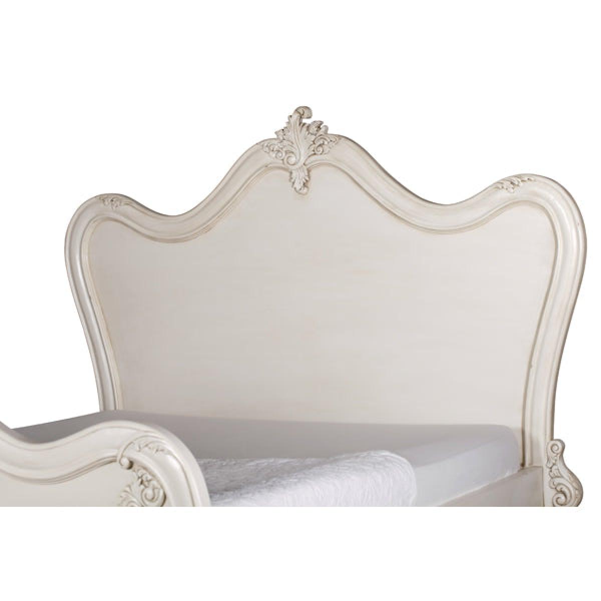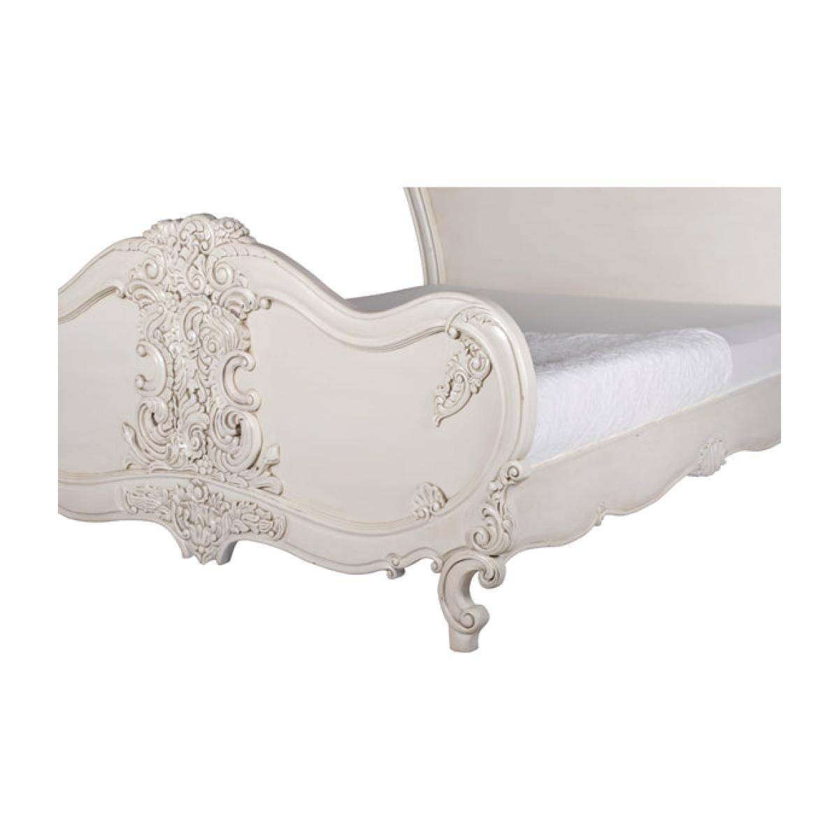 If you’re looking to create a boudoir fit for royalty, this bed will make the perfect statement. Combining elegance with extravagance, this ornate bed frame features ornate detailing on the headboard and footboard with short, curved legs holding the bed above the ground. The large headboard features three elegant curves with subtle detailing along the top and leaf-style detailing at the highest point. The footboard follows the same shape as the headboard without coming as high and is more extravagantly designed with ornate detailing coming down the outer centre and matching leaf detailing in the corners. The base of the bed also features elegant curves.