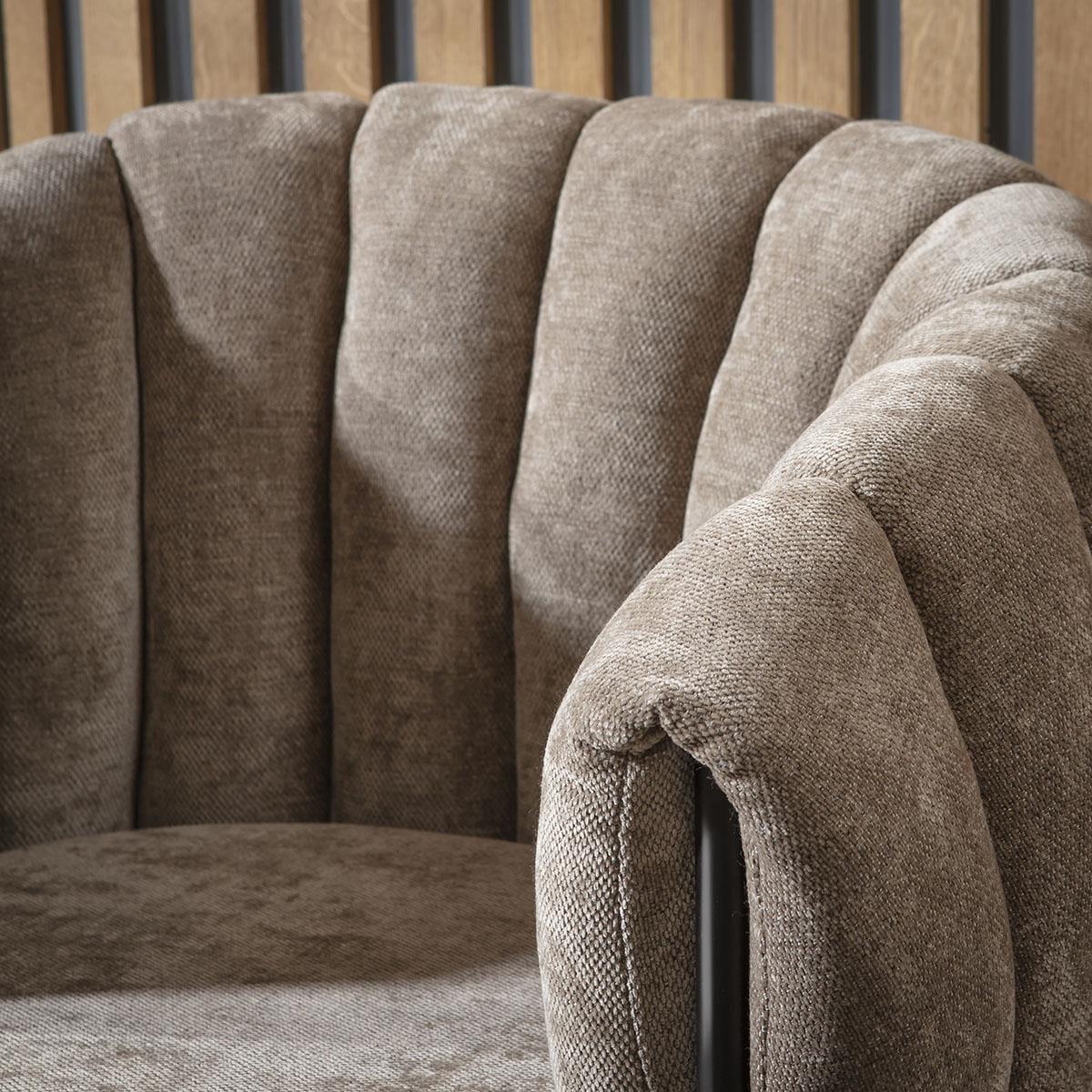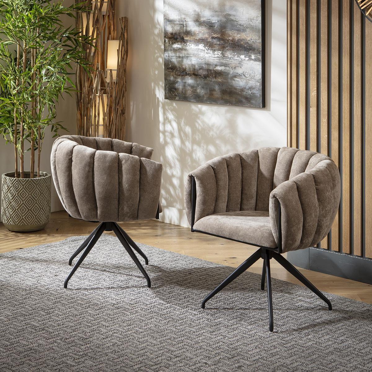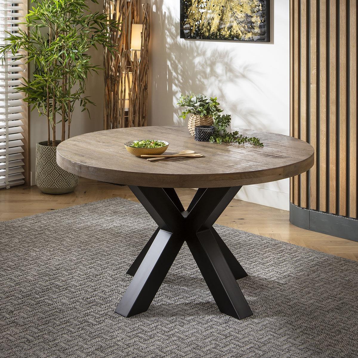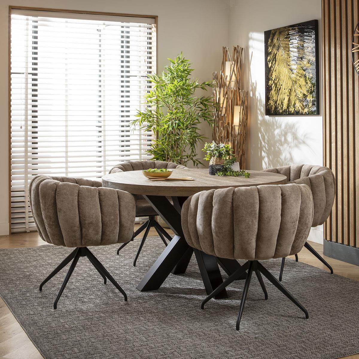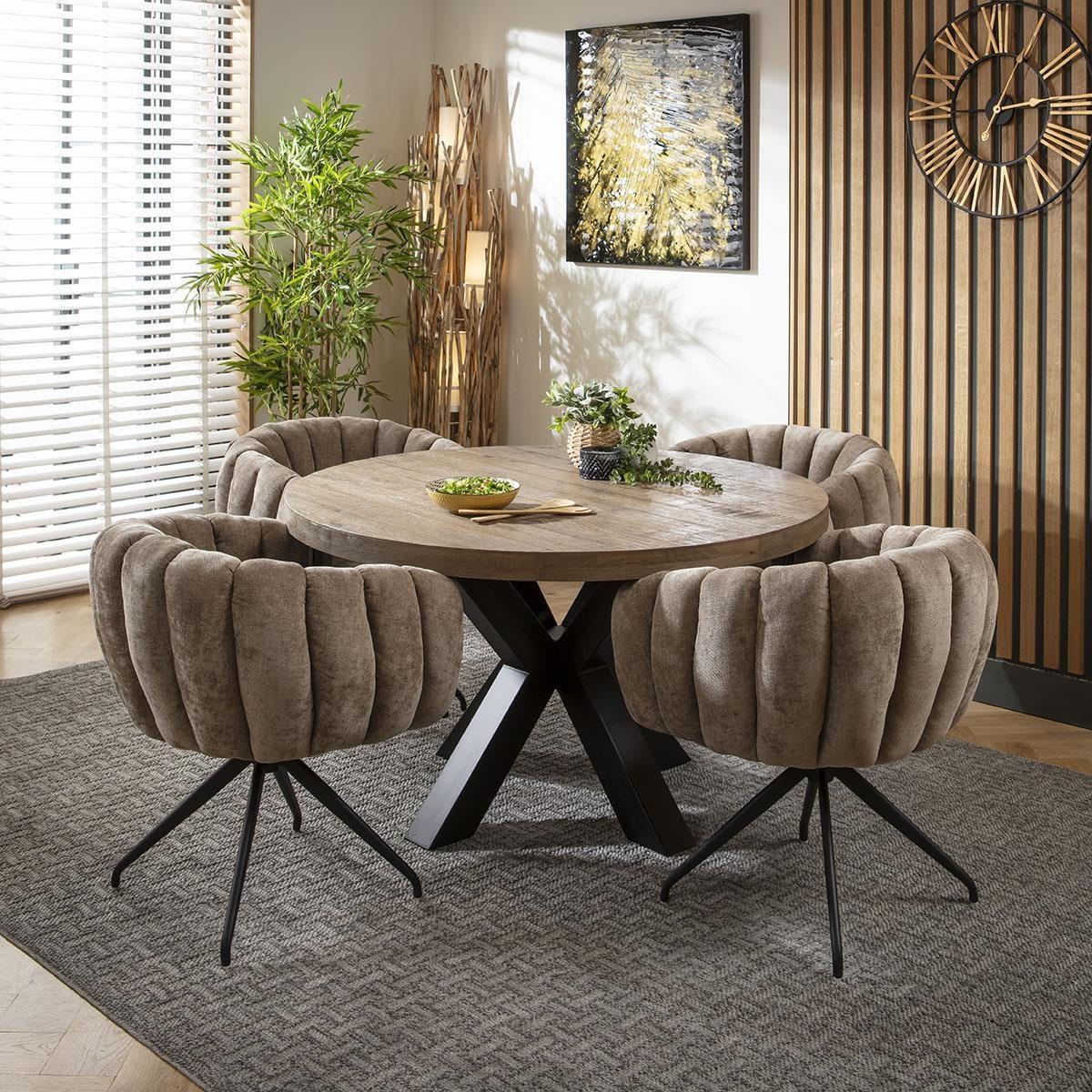 This 4 seater dining table and chairs set includes golden brown fabric swivel dining chairs, featuring a wide backrest, high arms and a metal frame, with a round dining table, showcasing a 130cm reclaimed oak top and a bold black metal star pedestal base. This modern dining set is crafted for durability and comfort. Upgrade your dining space with this modern round dining table, perfect for gatherings and meals. The 4 seater wooden dining table features a 130cm reclaimed oak tabletop and a bold black metal star pedestal base, combining industrial style with premium quality for any dining room or kitchen. Upgrade your space with the 4 golden brown fabric swivel dining chairs included in this set. Featuring a wide, wrap-around backrest with high arms and a black powder-coated metal frame, this unique dining chair offers exceptional comfort and a chic aesthetic for contemporary dining rooms or kitchens. This 4 seater dining set combines modern Maisy chairs with the stunning Glasgow table. Whether you love the Maisy chairs and would like to purchase them individually, or you think the Glasgow table would complete your dining room decor better with another chair, you can easily mix and match our modern dining tables and chairs to curate something truly unique. Table Size W130cm D130cm H76cm Chair Size W66cm D84cm H82cm Modern Dining Table And Chairs Set For 4