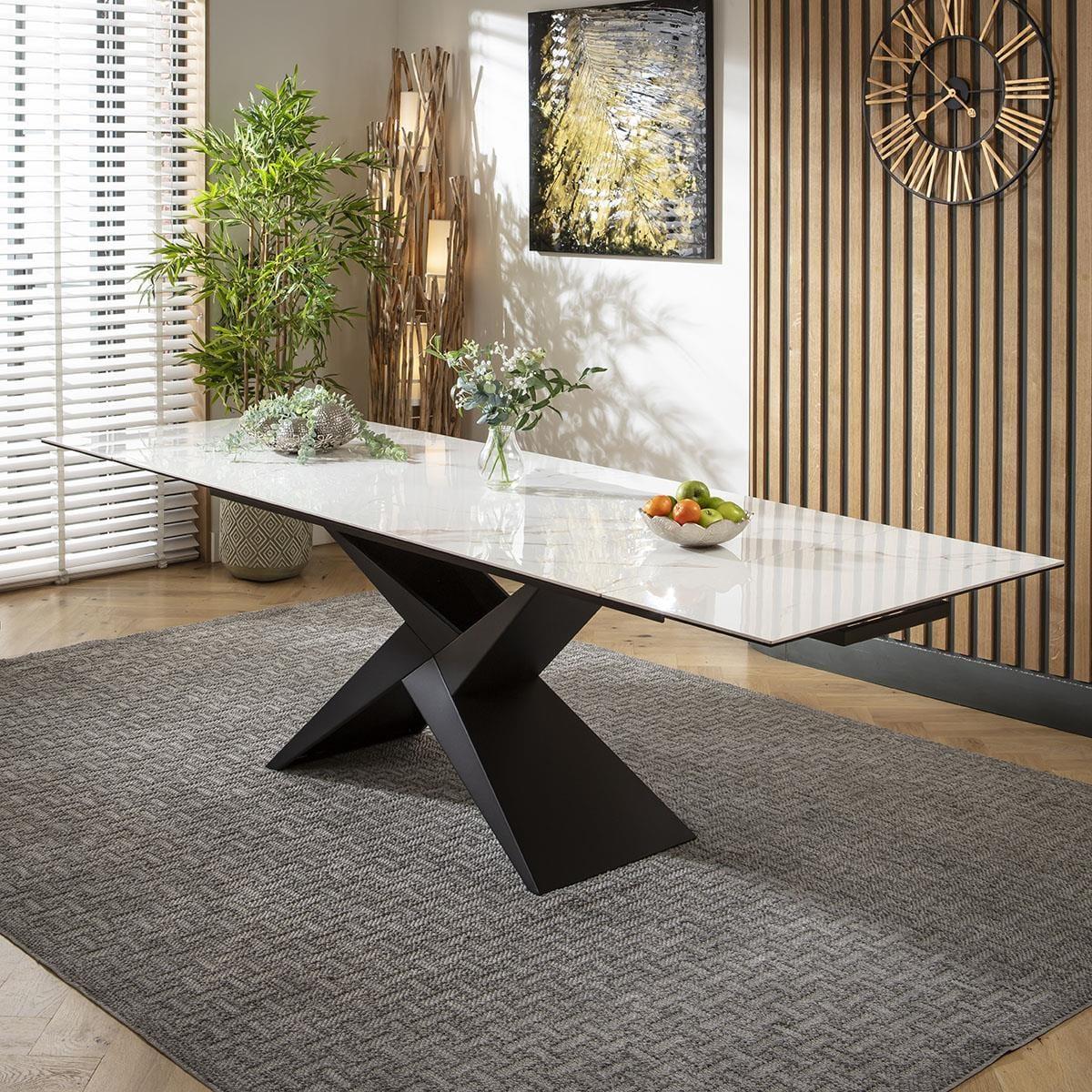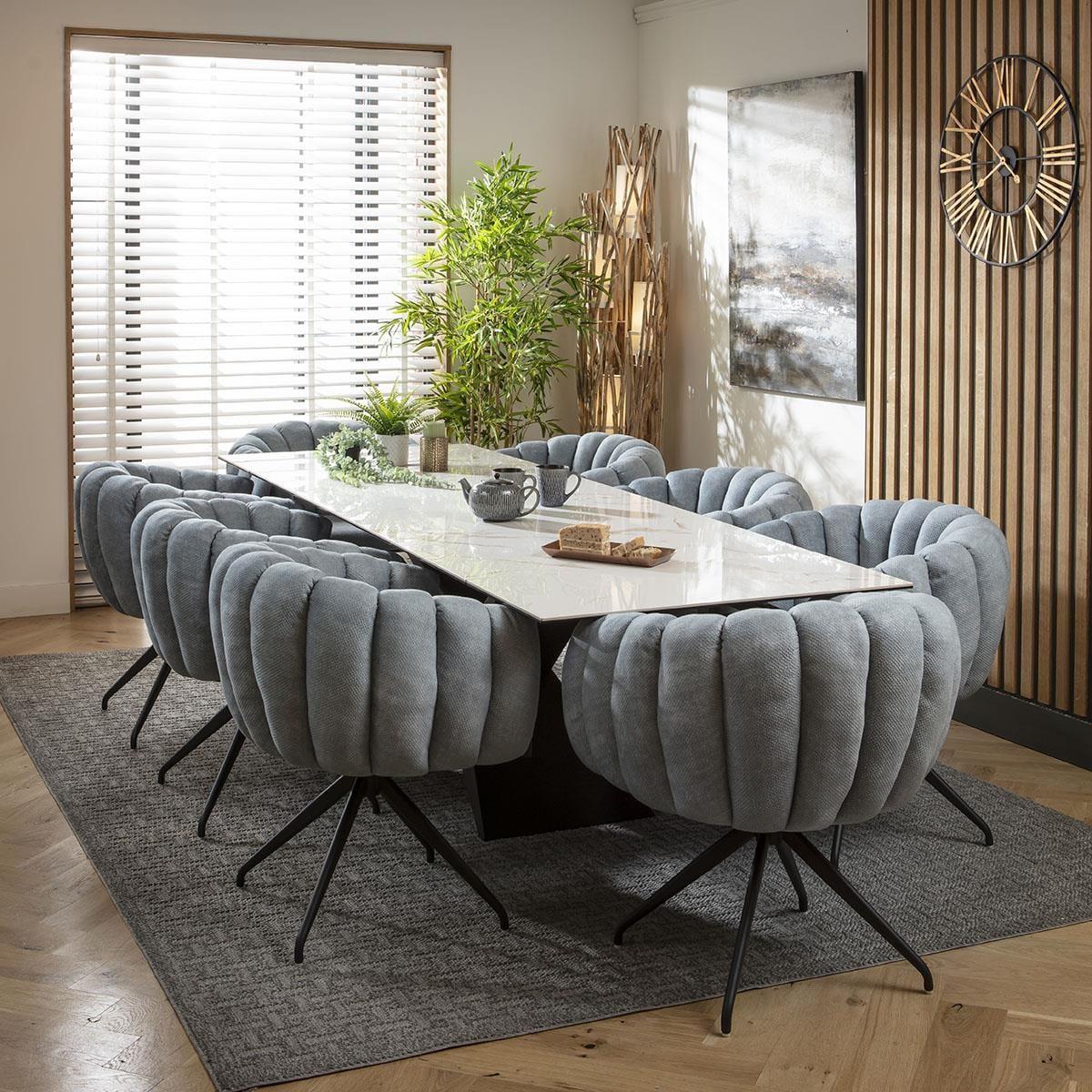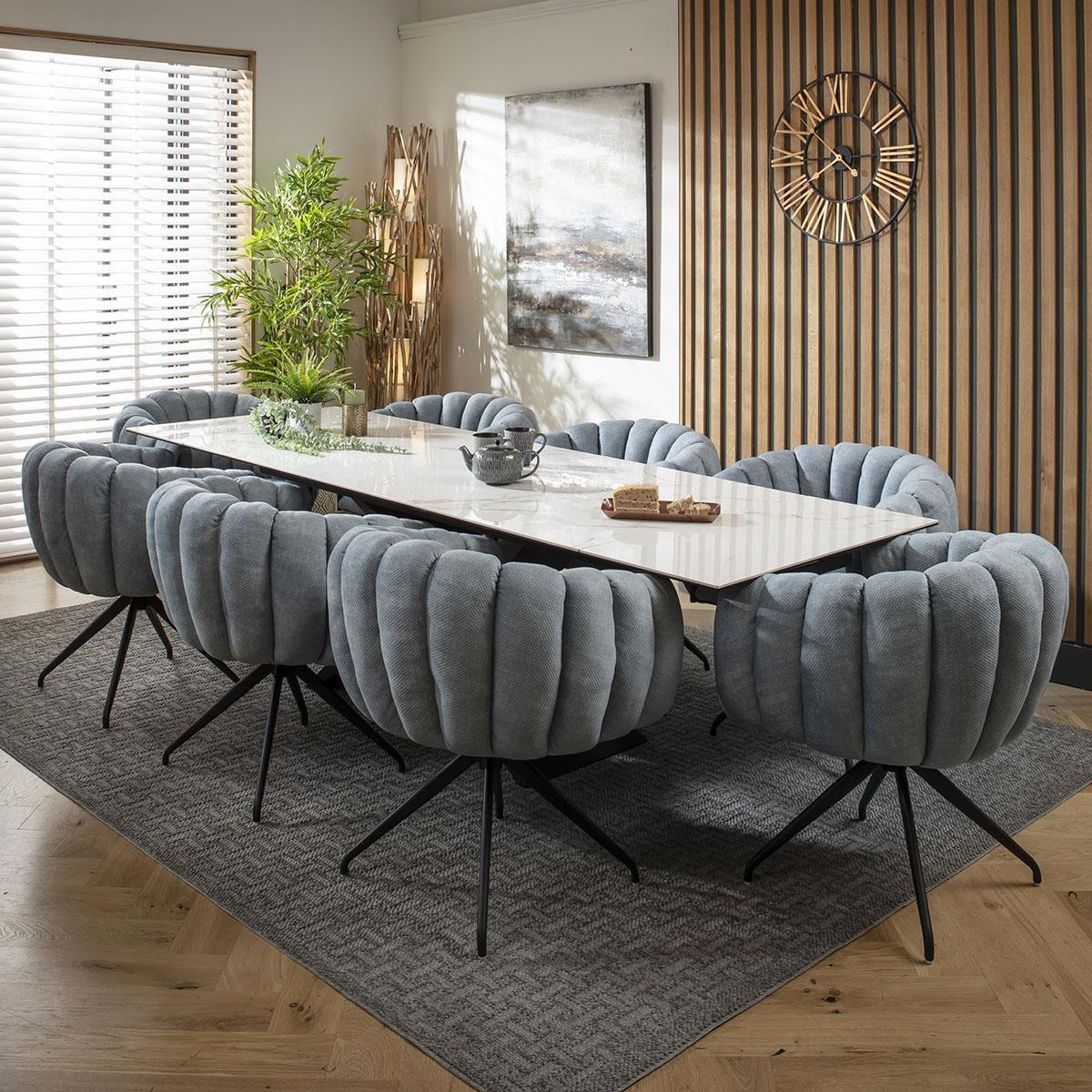 This 8 seater dining table and chairs set includes sky blue fabric swivel dining chairs, featuring a wide backrest, high arms and a metal frame, with an extendable dining table measuring 180cm up to 260cm, featuring a marble-effect ceramic tabletop. This modern dining set is crafted for durability and comfort. The modern extendable dining table features extension leaves at both sides, avoiding a middle gap. Measuring 180cm and extending to 260cm, it seats up to 8 people. With its white gold marble-effect ceramic tabletop and unique, ultra-modern base, this premium quality table is perfect for contemporary kitchens and dining areas. Upgrade your space with the 8 sky blue fabric swivel dining chairs included in this set. Featuring a wide, wrap-around backrest with high arms and a black powder-coated metal frame, this unique dining chair offers exceptional comfort and a chic aesthetic for contemporary dining rooms or kitchens. This 8 seater dining set combines modern Maisy chairs with the stunning Emperor table. Whether you love the Maisy chairs and would like to purchase them individually, or you think the Emperor table would complete your dining room decor better with another chair, you can easily mix and match our modern dining tables and chairs to curate something truly unique. Table Size W180-260cm D90cm H76cm Chair Size W66cm D84cm H82cm Modern Dining Table And Chairs Set For 8