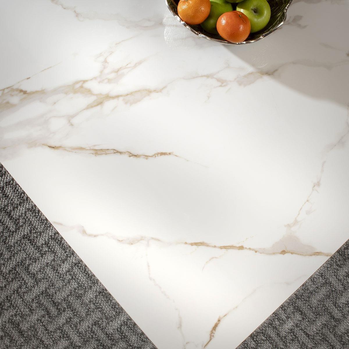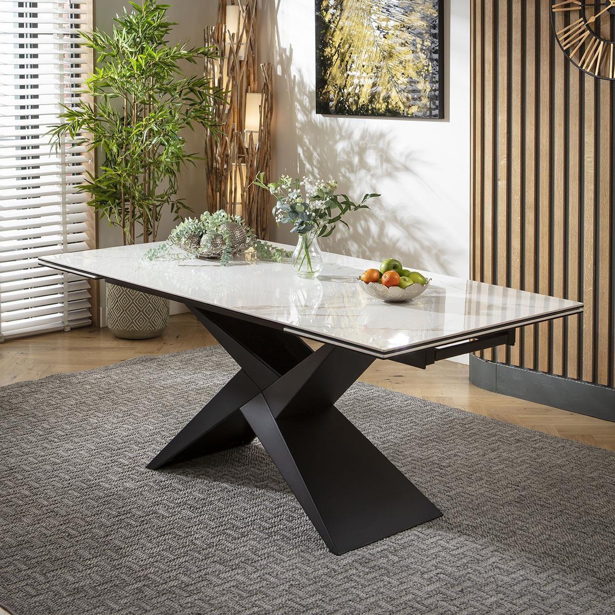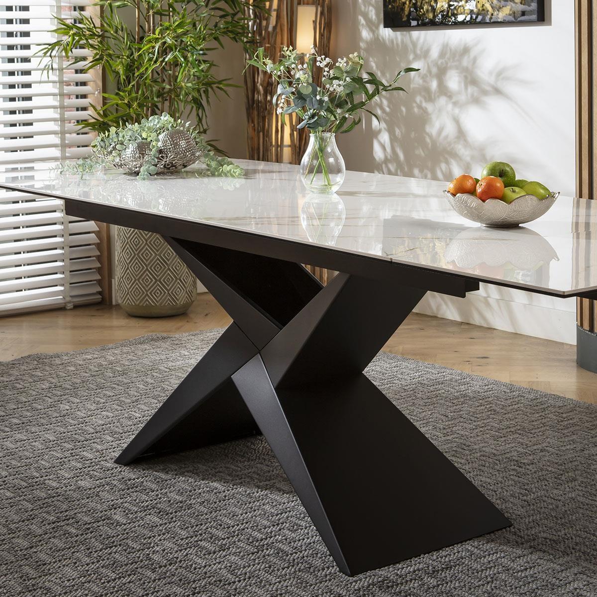 This 8 seater dining table and chairs set includes sky blue fabric swivel dining chairs, featuring a wide backrest, high arms and a metal frame, with an extendable dining table measuring 180cm up to 260cm, featuring a marble-effect ceramic tabletop. This modern dining set is crafted for durability and comfort. The modern extendable dining table features extension leaves at both sides, avoiding a middle gap. Measuring 180cm and extending to 260cm, it seats up to 8 people. With its white gold marble-effect ceramic tabletop and unique, ultra-modern base, this premium quality table is perfect for contemporary kitchens and dining areas. Upgrade your space with the 8 sky blue fabric swivel dining chairs included in this set. Featuring a wide, wrap-around backrest with high arms and a black powder-coated metal frame, this unique dining chair offers exceptional comfort and a chic aesthetic for contemporary dining rooms or kitchens. This 8 seater dining set combines modern Maisy chairs with the stunning Emperor table. Whether you love the Maisy chairs and would like to purchase them individually, or you think the Emperor table would complete your dining room decor better with another chair, you can easily mix and match our modern dining tables and chairs to curate something truly unique. Table Size W180-260cm D90cm H76cm Chair Size W66cm D84cm H82cm Modern Dining Table And Chairs Set For 8