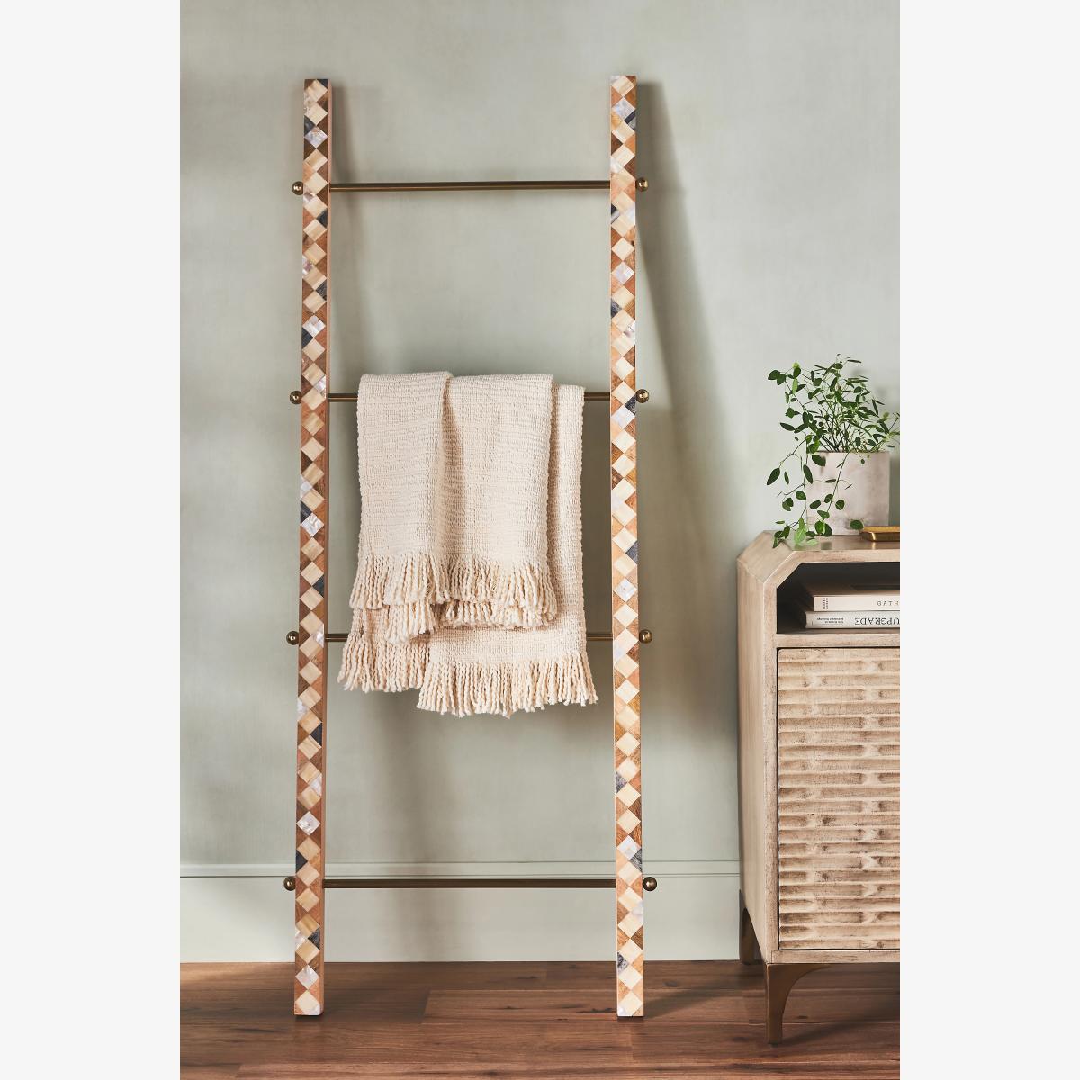 With a mixed-material design of natural tropical hardwood, iron, and mother-of-pearl detail, this ladder offers a decorative accent to a wall - and light storage for blankets, special wardrobe pieces, and linens. * For decorative and light storage usage only * Hand-painted Iron, Tropical Hardwood, Bone inlay, Mother-of-Pearl * Please note, due to the crafted nature of this item some variation may occur * This piece is intended for indoor use * Wipe clean with dry cloth * Some assembly required * Imported