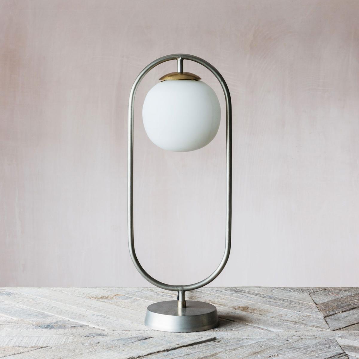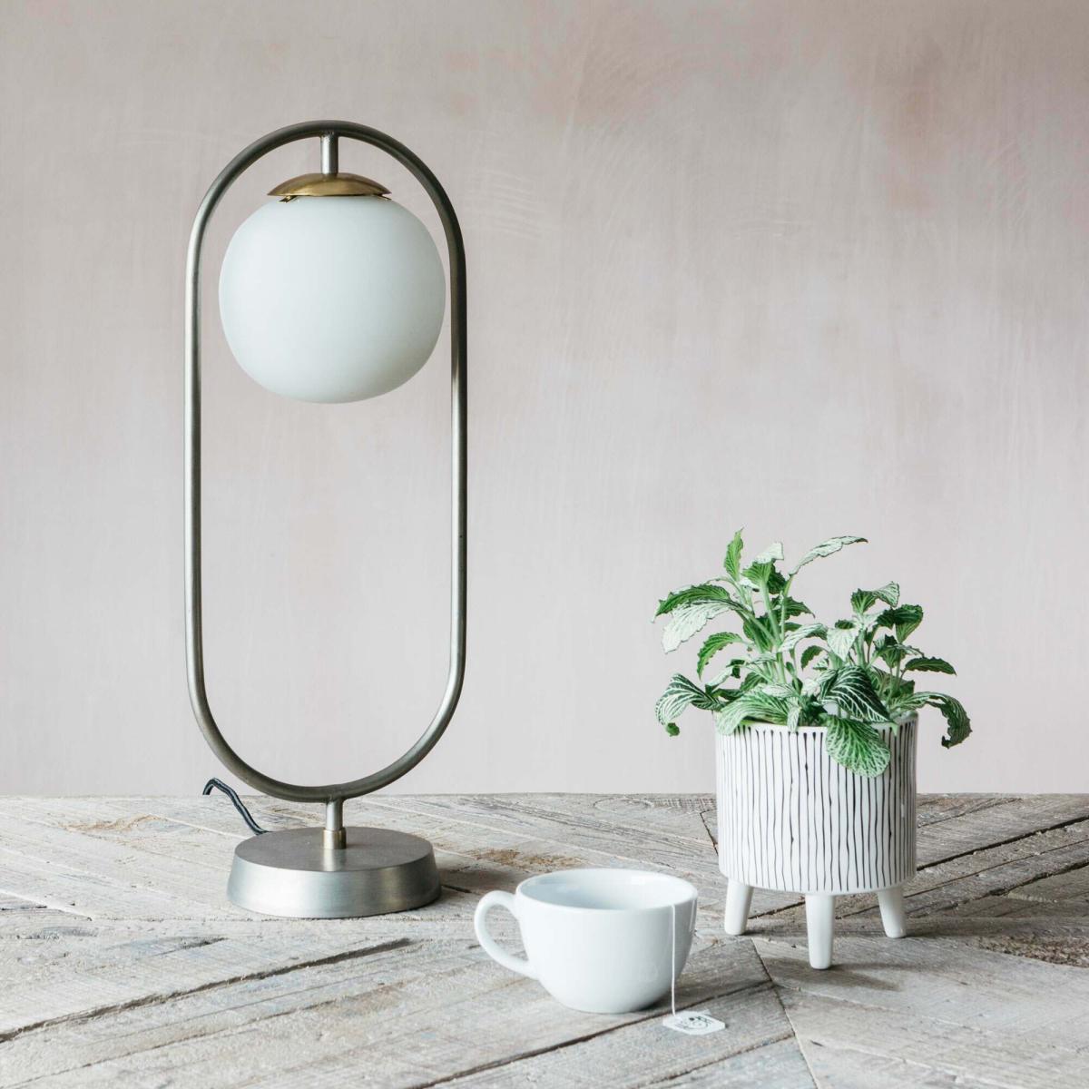 Imbue your home with Art Deco elegance with the seamless design of this lantern-style table lamp. Featuring an opaque orb framed by a continuous line of brass and a sturdy base.