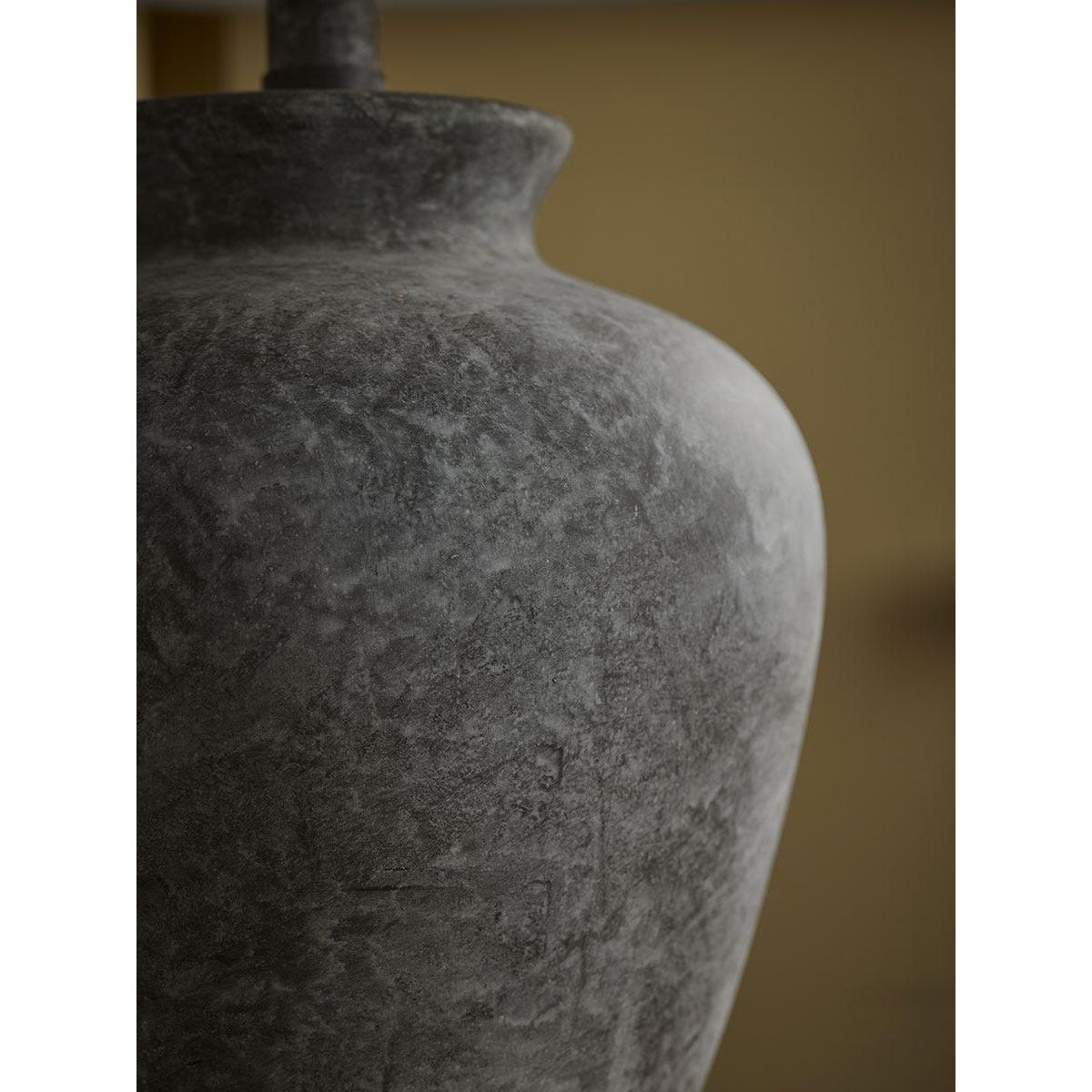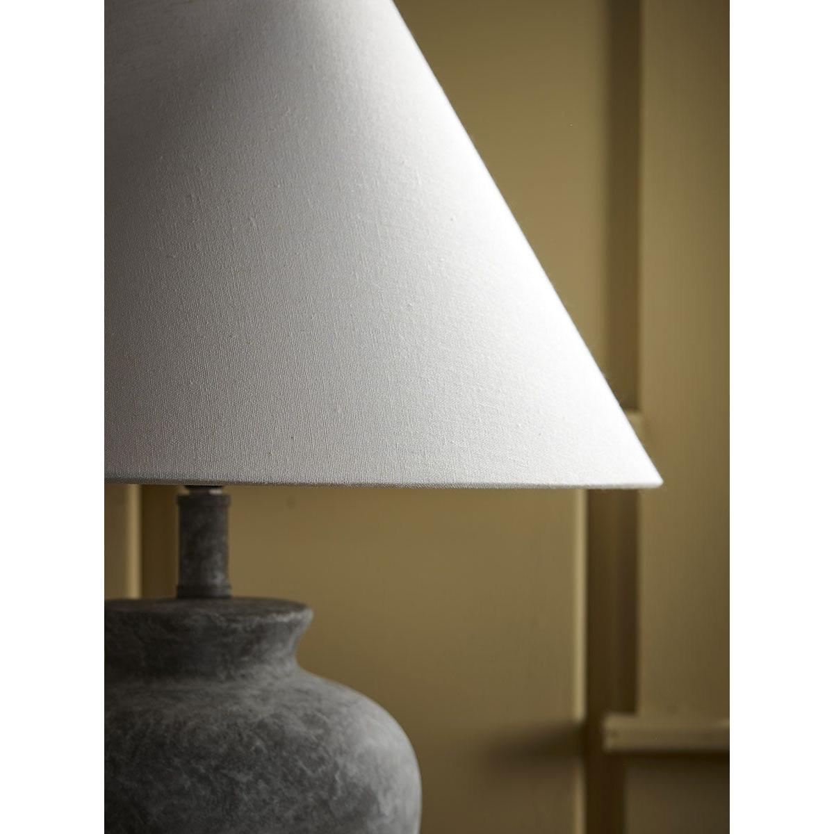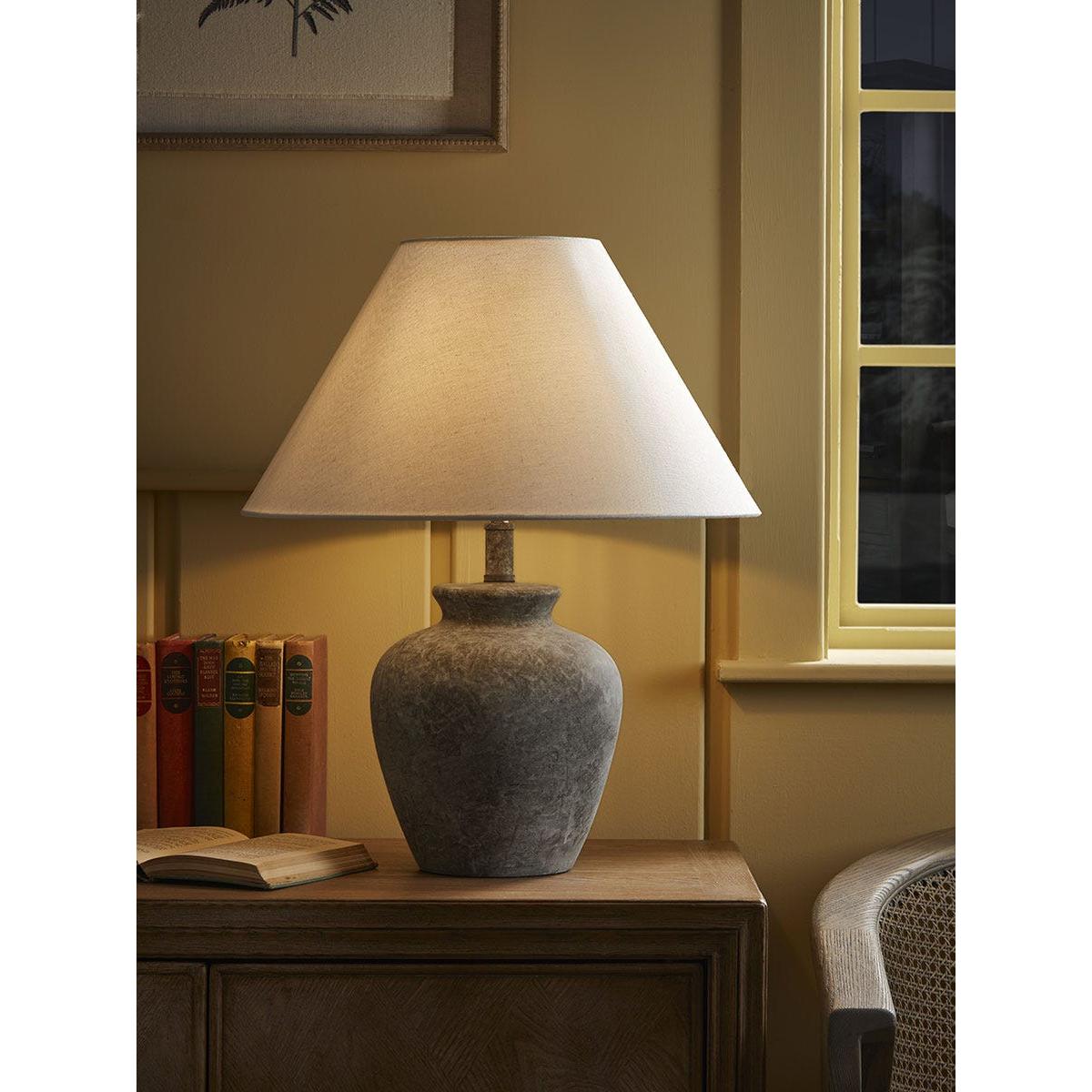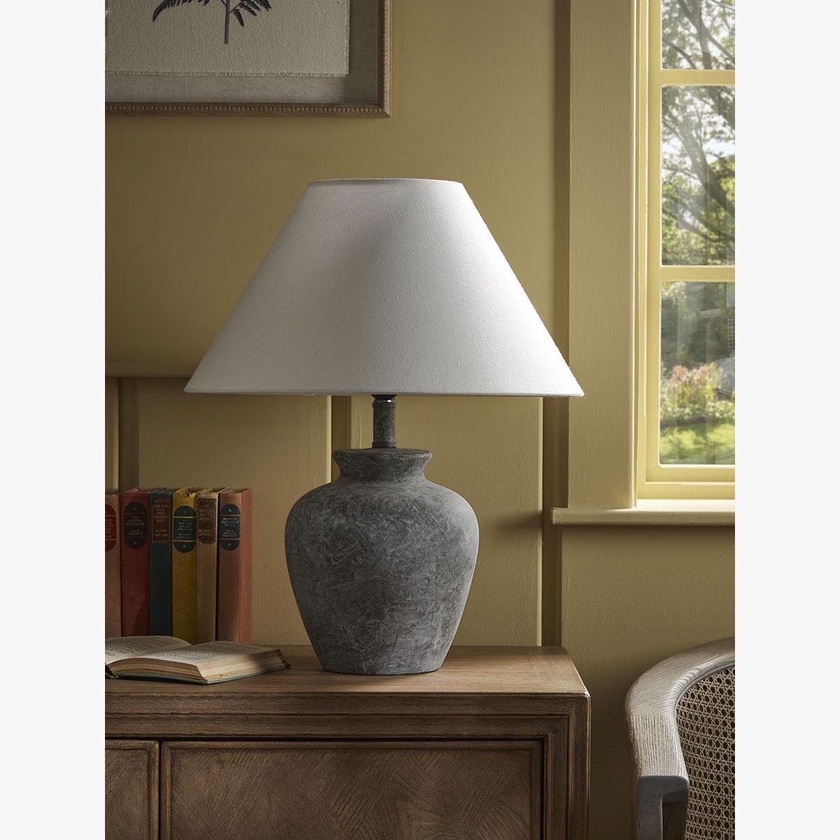 With a stone-effect ceramic base, this lamp adds a modern touch of rustic charm to your home. The darker base contrasts with the cream shade, adding a wonderful feature to your home, lit or unlit.