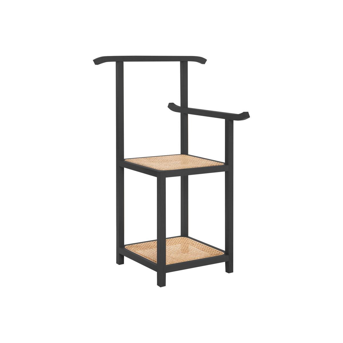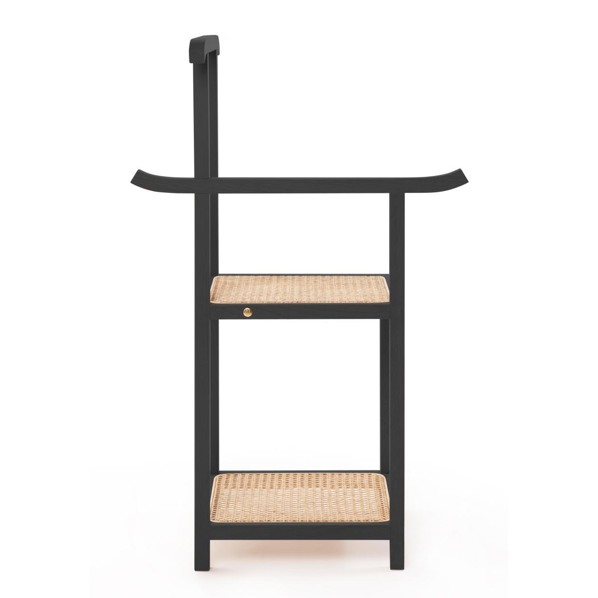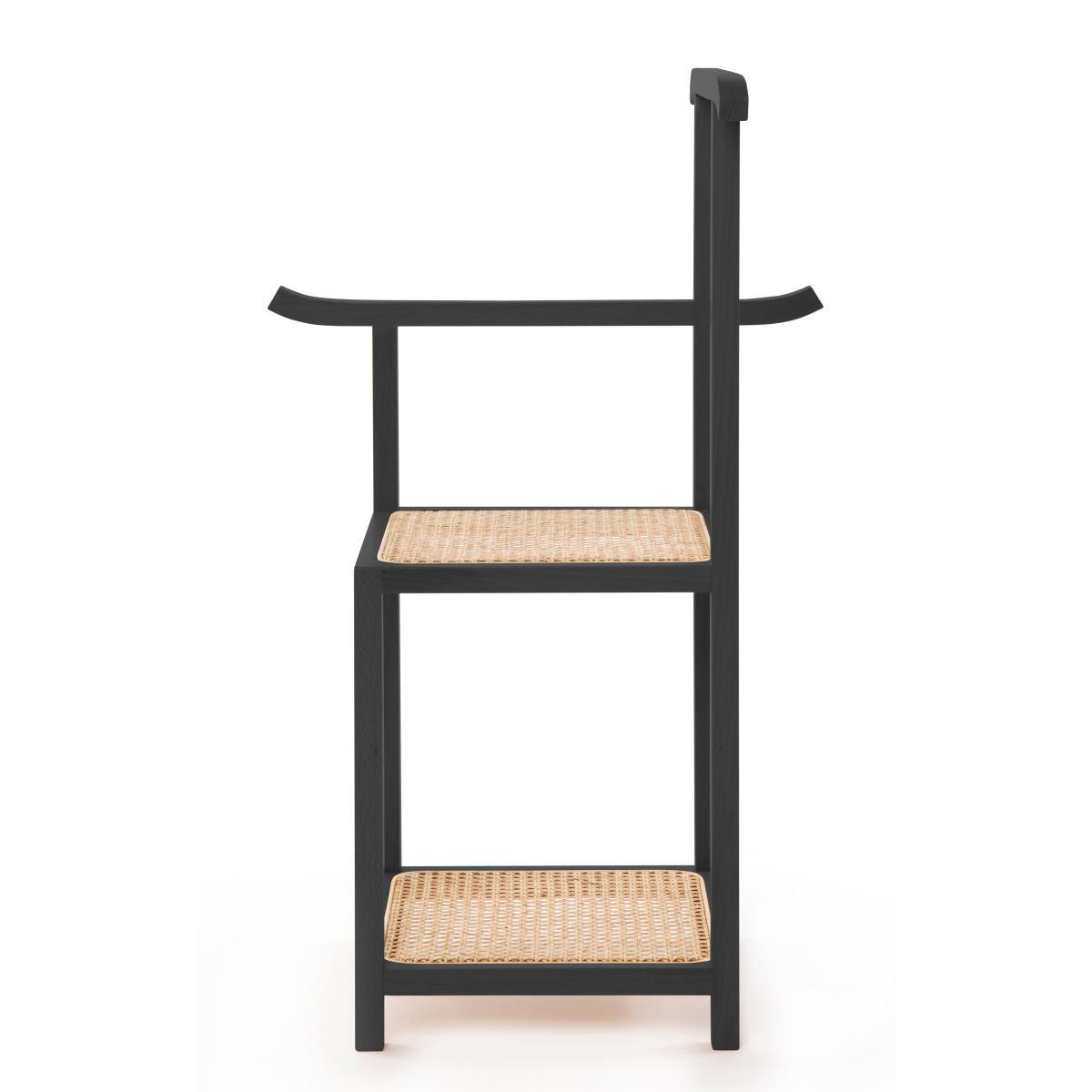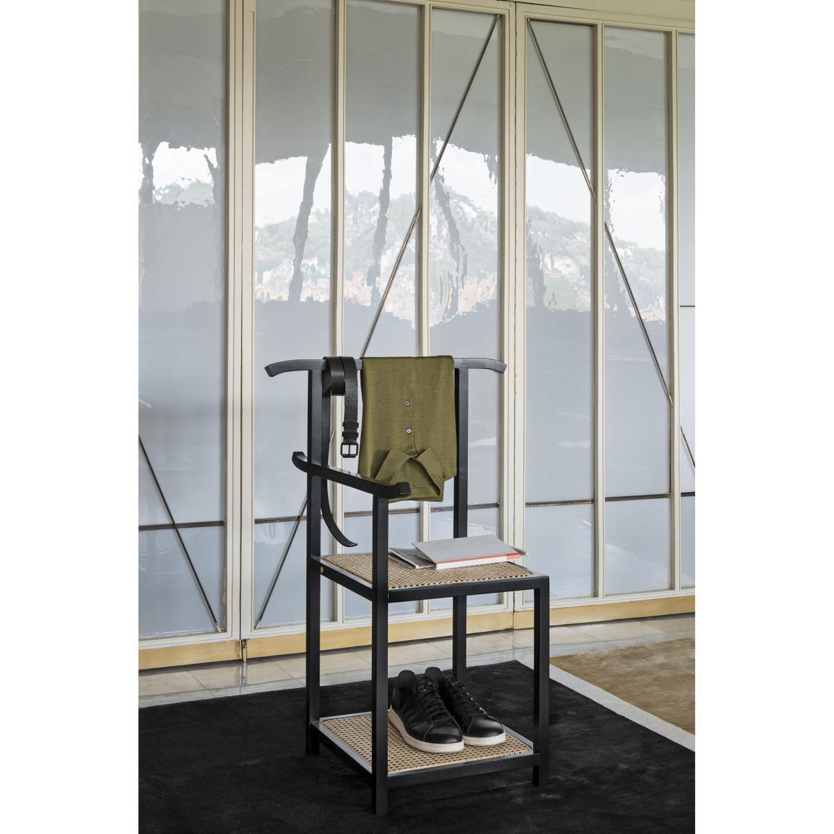 Singapore-born designer Nathan Yong is the creator of this minimalist item, with an oriental feel. It is a functional 2-in-1 piece of furniture that serves as a valet and a chair: practical for sitting down to put on shoes! The shelf located under the seat can be used to store bags and shoes. The back and armrest can serve as hangers for clothes or towels. The Majordomo will finds its place in a bedroom or bathroom. Majordomo consists of a square-section beech wood structure. The seat and shelf are created from natural straw caning.